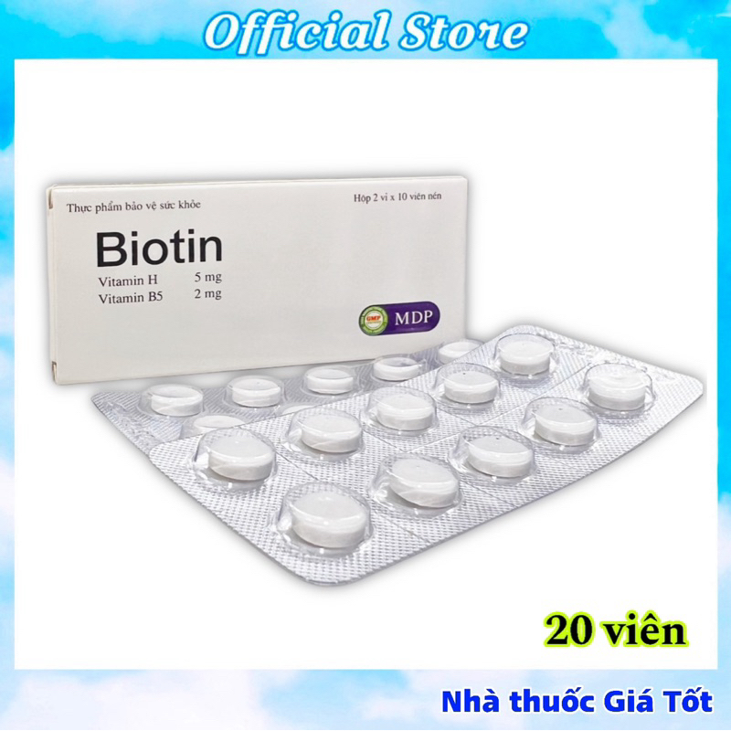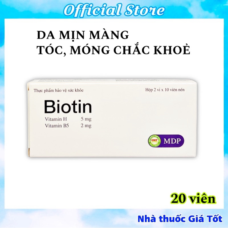 Biotin viên uống bổ sung biotin và vitamin B5 giúp đẹp da, da mịn màng, tóc dày bóng, móng chắc khỏe (20 viên)1. Giới thiệu sản phẩm:Biotin (hay còn được gọi là vitamin B7, vitamin H) là một trong những thành phần quan trọng cấu tạo và tham gia vào sự phát triển của tóc, móng, da.Vitamin B5 (hay còn được gọi là acid pantothenate) cũng một loại vi chất đóng vai trò quan trọng đối với sự phát triển của da, tóc và móng.Việc kết hợp Vitamin B5 và Biotin (Vitamin B7) đem đến lợi ích tích cực trong việc nuôi dưỡng và cải thiện da, tóc, móng.Viên uống Biotin là dòng sản phẩm chuyển bổ sung Bitotin (Vitamin H) và Vitamin B5. Công dụng chính của sản phẩm là hỗ trợ làm đẹp da, giúp da mịn màng, sáng khỏe, giúp tóc dày bóng, suôn mượt, cải thiện tình trạng tóc gãy rụng, tóc yếu, móng tay dễ xước gãy…