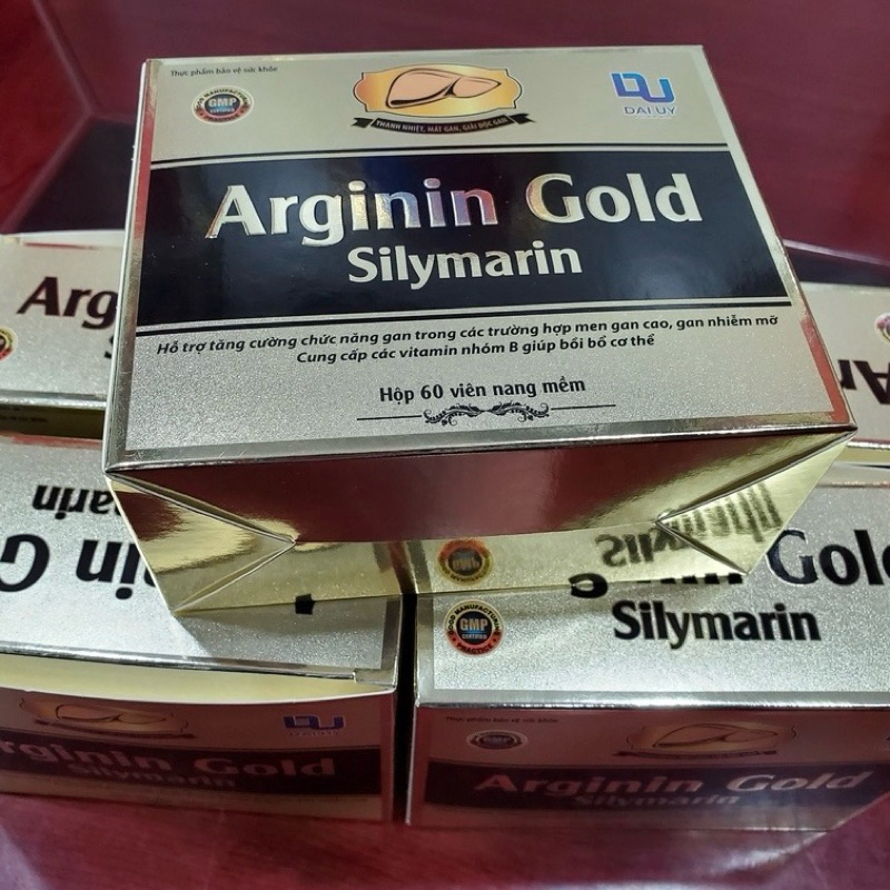 Thực phẩm bảo vệ sức khoẻ viên uống bổ gan Arginin Gold Silymarin.———————- Hỗ trợ tăng cường chức năng gan trong các trường hợp men gan cao, gan nhiễm mỡ- Cung cấp các vitamin nhóm B giúp bồi bổ cơ thể- Hỗ trợ giúp thanh nhiệt, mát gan, giải độc và bảo vệ gan- Hỗ trợ tăng cường chức năng gan hạn chế tác hại của rượu bia, hoá chất đối với gan————————THÀNH PHẦN:- Arginin HCL: 100mg- Cao diệp hạ châu: 80mg- Cao cà gai leo: 80mg- Cao bồ công anh: 60mg- Cao bìm bim: 20mg- Silymarin: 10mg- Vitamin PP: 4mg- Vitamin B1: 2mg- Vitamin B6: 2mg- Phụ liệu: Licethin, Carboxil, CaCO3, Nipazil, Nipazol, dầu đậu nành, sáp ong, gelatin, glycerin, sorbitol, tital dioxide, vanila, mầu socola, nước RO vừa đủ 1 viên.QUY CÁCH: Hộp 6 vỉ x 10 viên nang mềm————-Cách dùng:- Người lớn: uống 1 viên/ lần x 2 lần/ ngày- Trẻ em từ 12-18 tuổi: uống 1 viên/ lần/ ngàyKhi muốn sử dụng nhiều hơn hoặc cần biết thêm thông tin về sản phẩm, vui lòng hỏi ý kiến bác sĩ.* LƯU Ý: Sản phẩm này không phải là thuốc và không có tác dụng thay thế thuốc chữa bệnh.#bogan #bổgan #daiuy #vienbogan #vienuongbogan #arginin #thucphamchucnang #tangcuongchucnanggan #loimat
