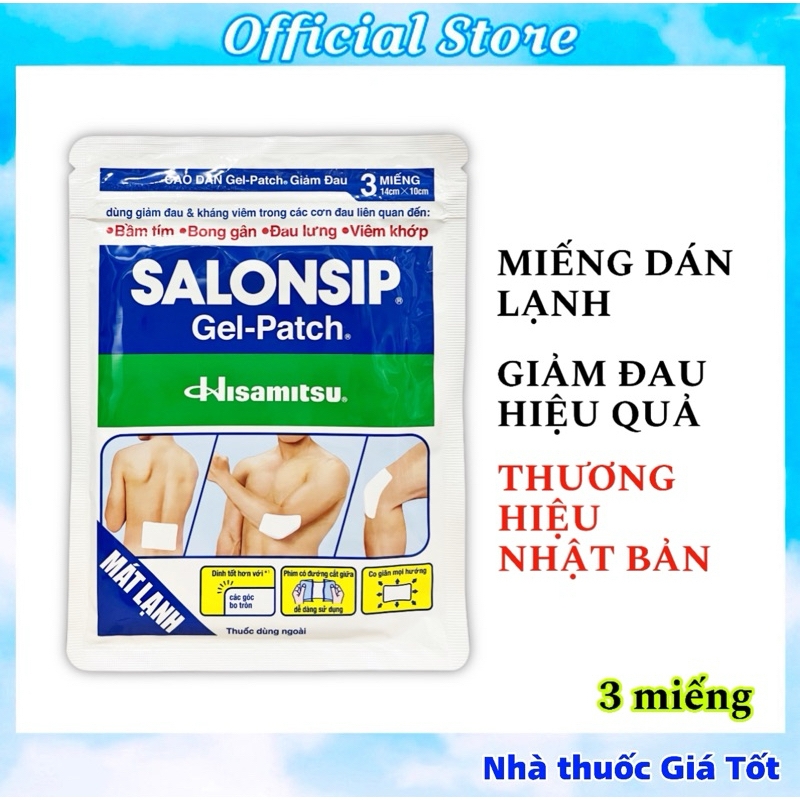 [3 miếng 14x10cm] Cao Dán Salonsip ✅ Thành phần tá dược: cho 100g cao dán/ 1000cm2- Glycol salicylate………………………..1,25g- L-menthol………………………………….1,00g- dl-Camphor……………………………….0,30g- Tocopherol acetate……………………1,00g✅ Thành phần tá dược: Gelatin, Titanium oxide, Synthetic aluminum silicate, isopropylmethyl phenol, polyglycerol polyglycidyl ether, polyacrylic acid, partially hydrolyzed polyvinyl alcohol, polyethylene glycol monostearate, partially neutralized polyacrylate, glycerin, nước tinh khiết, perfume✅ Dạng bào chế: cao dán✅ Chỉ định: Người lớn và trẻ em từ 30 tháng tuổi trở lên: dùng giảm đau trong các cơn đau liên quan đến mỏi cơ, đau cơ, đau vai, đau lưng đơn thuần, bầm tím, bong gân, căng cơ…✅ Liều lượng, cách dùng: - Rửa sạch, lau khô vùng da bị đau- Gỡ miếng cao dán ra khỏi tấm phim và dán vào chỗ bị đau không quá 4 lần trong ngày- Gỡ miếng cao dán ra khỏi da sau 8 giờ dán❌ Lưu ý- Không dán lên vùng da tổn thương hoặc vết thương hở- Không sử dụng cho người có tiền sử dị ứng với một trong các thành phần của sản phẩm- Sản phẩm này không phải là thuốc và không có tác dụng thay thế thuốc chữa bệnh✅ Sản xuất tại: Công ty TNHH Dược phẩm Hisamitsu Việt Nam- Quy cách đóng gói: bao 2 miếng 14cm x 10cm- Ngày sản xuất & hạn sử dụng in trên bao bì sản phẩmĐịa chỉ mua hàng trực tiếp