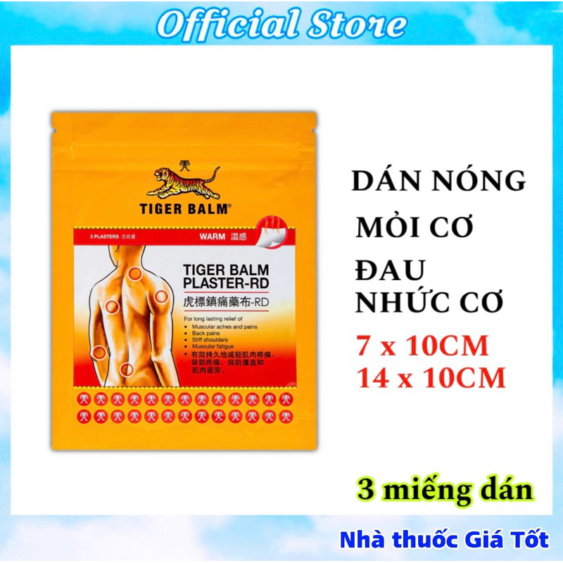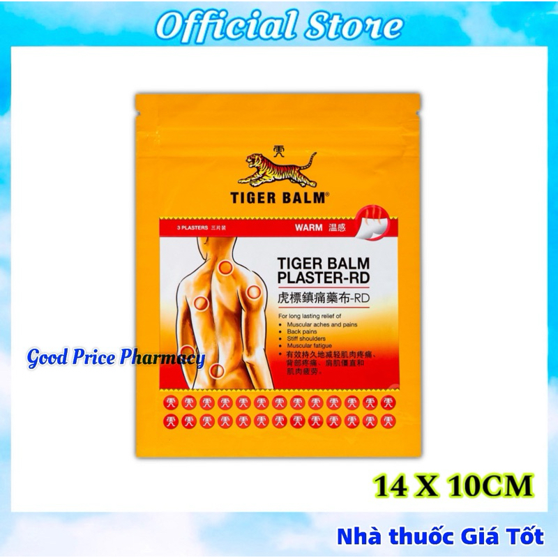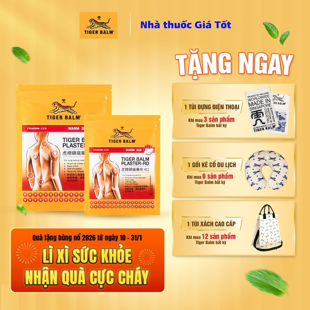 TIGER BALM PLASTER-RDTHÀNH PHẦNHoạt chất: Camphor 1,0%, Tinh dầu Bạc hà 0,6%, Tinh dầu Khuynh diệp 0,5%, Menthol 0,3%, Dịch chiết ớt 0,2%.Tá Dược: Dung dịch Sorbitol 70%, Jurymer AC-10H, Jurymer SH 8, Glycerin đậm đặc, Kaolin nặng, Propylene Glycol, Natri CMC 2200, Natri CMC 1380, Natri Polyacrylate, Polysorbate 80, Hidrotalcite tổng hợp, Nhôm Dihydroxyaluminum Aminoacetate, Nước tinh khiết.DẠNG BÀO CHẾCao dánQUY CÁCH ĐÓNG GÓITúi gồm 3 miếng dán 10x14cmTúi gồm 3 miếng dán 7x10cmCHỈ ĐỊNHGiảm các triệu chứng mỏi cơ, đau và nhức cơ, cứng cổ và vai, vết đụng đập, bong gân và đau lưng.LIỀU DÙNG VÀ CÁCH DÙNGLàm sạch và khô vùng dán. Gỡ bỏ lớp màng bảo vệ và dán miếng cao dán lên vùng bị đau từ một đến hai lần mỗi ngày. Không dán miếng cao dán 1 tiếng trước hoặc sau khi tắm.