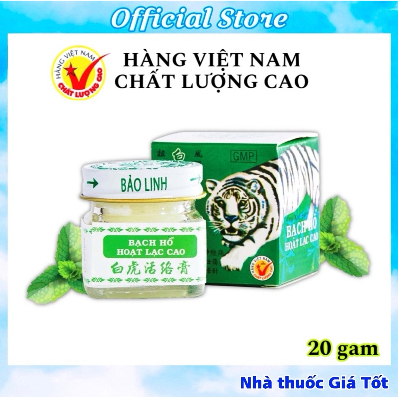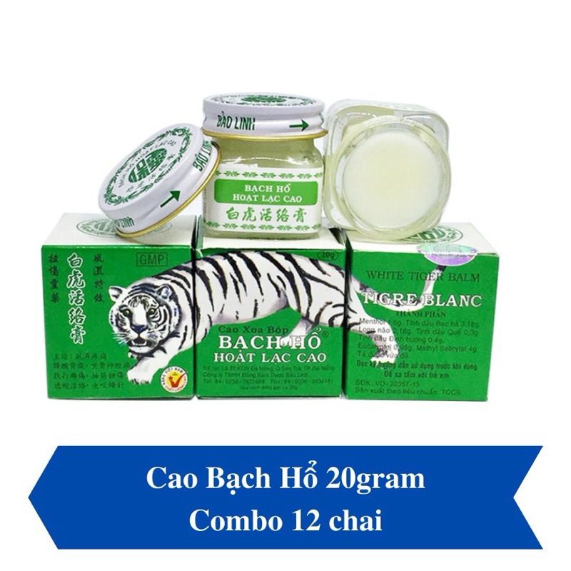 CAO XOA BÓP BẠCH HỔ HOẠT LẠC CAO✅THÀNH PHẦNLọ 20g gồm:- Chiết xuất tinh bạc hà:.......................3,18g- Long não:...........................................2,18g - Tinh dầu quế:.......................................0,3g- Tinh dầu đinh hương:..........................0,4g- Menthol:..............................................1,6g- Eucalyptol:........................................0,98g- Menthyl salicylat:...................................4gTá dược vừa đủ.✅CÔNG DỤNG CỦA CAO XOA BÓP BẠCH HỔ:- Cao xoa bóp khớp chứa Methyl Salicylat và Eucalyptol hỗ trợ bảo vệ & tái cơ cấu các xương đặc biệt các khớp xương.- Cao xoa bóp bạch hổ hoạt lạc cao hỗ trợ giảm đau lưng, tê bì chân tay, đau các khớp như khớp bả vai, khớp gối tay chân, đau đốt sống cổ, mỏi vai gáy…Hỗ trợ Giảm đau cho người bị đau khớp cấp và mãn tính.- Chấn thương trong thể thao, bong gân, chân tay bị tê, chuột rút, mỏi lưng, đau lưng.- Hỗ trợ điều trị thấp khớp hiệu quả.- Hỗ trợ giảm đau nhức các khớp bả vai, đốt sống cổ, lưng, khớp gối tay chân, đau đầu, đau mỏi vai gáy.- Cao thoa bóp khớp có các thành phần thảo mộc tự nhiên, mùi thơm dễ chịu.Hỗ trợ Giảm đau nhức, mỏi xương vai xương gối cho người già khi thời tiết thay đổi.2 Cách sử dụng cao xoa bóp Bạch Hổ Hoạt Lạc Cao- Cao bạch hổ chỉ được dùng thoa hoặc bóp bên ngoài da. Không được dính vào miệng hoặc mắt, mũi.- Rửa sạch và lau khô chỗ bị đau, tê thấp sau đó dùng 1 lớp cao thoa và bóp nhẹ, day các huyệt để khí huyết bên trong được lưu thông, làm vết thương mau lành.- Chú ý không bôi lên vết thương hở.✅CÁCH DÙNG:- Sử dụng ngày 3-4 lần cho đến khi tình hình được cải thiện.Sản phẩm không phải là thuốc không có tác dụng thay thế thuốc chữa bệnh.-------------------------------------------------------#đaunhức #đauđầu #đaulưng #đaukhớp #đaunhucxuongkhop #nhứcmỏi #caosaovang #daucula #caosaovangsi #caosaovangchinhhang #duoctw3 #duoctrunguong3 #camcum #saytauxe #nhucdau #daudau #daubung #daugio #dauconho #daunong❌ Sản phẩm này không phải là thuốc và không có tác dụng thay thế thuốc chữa bệnh