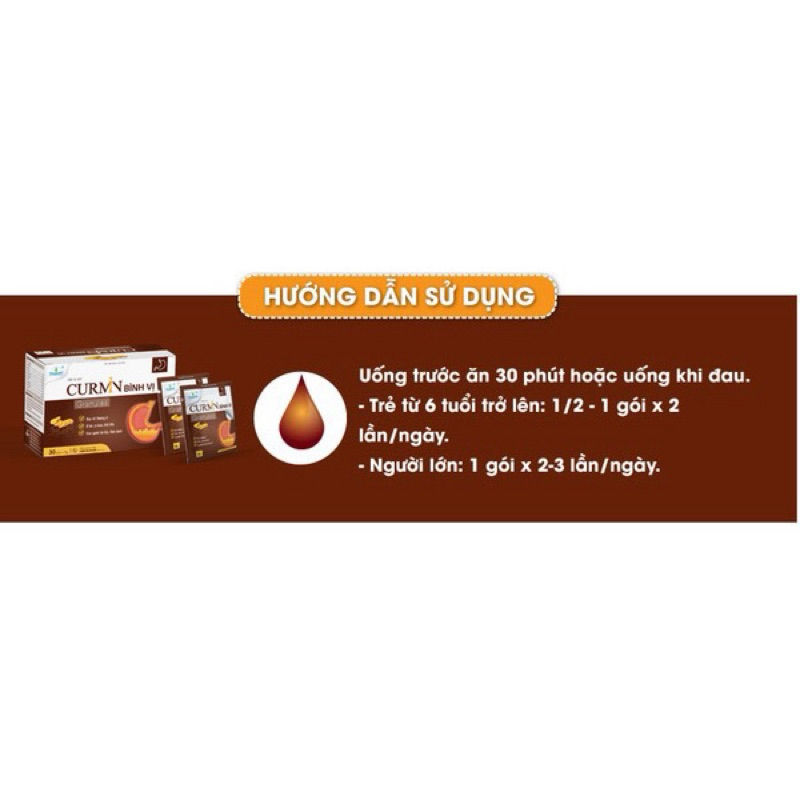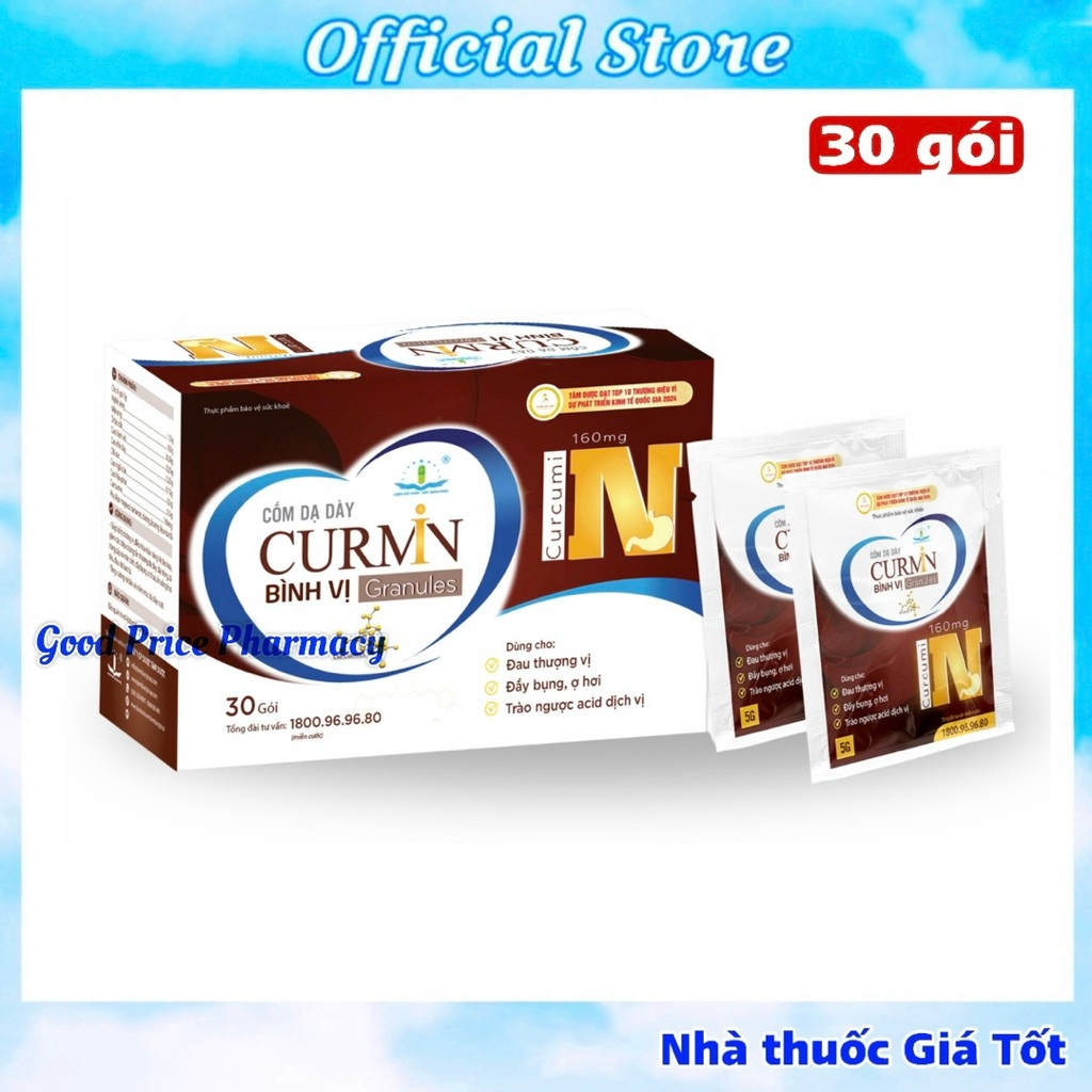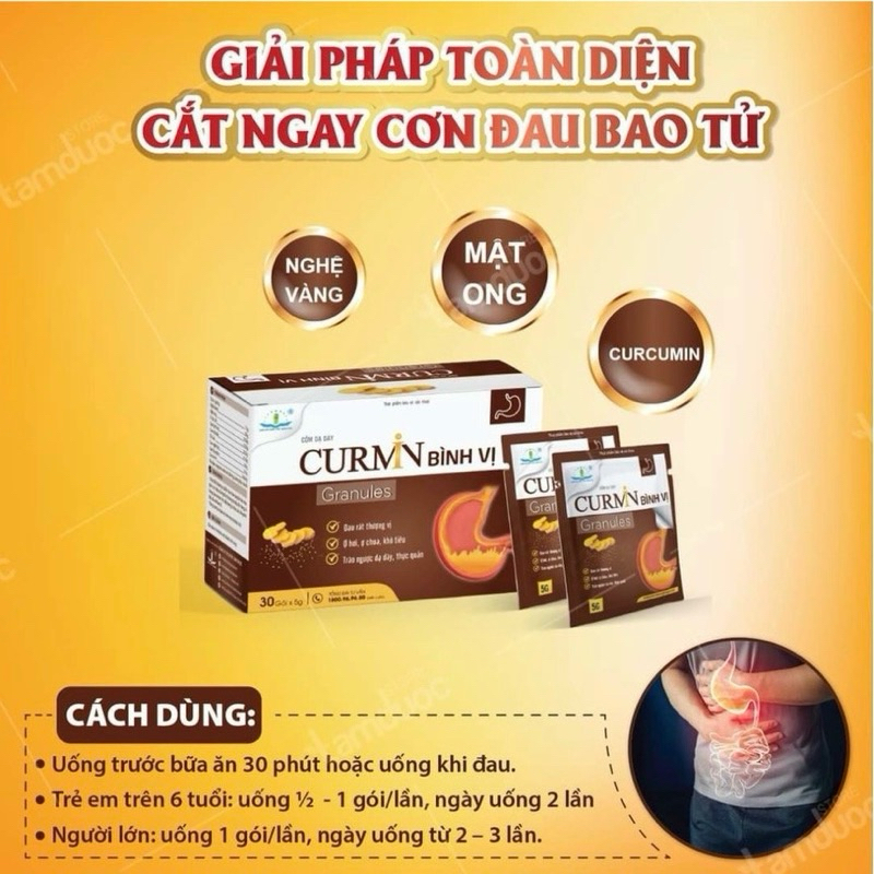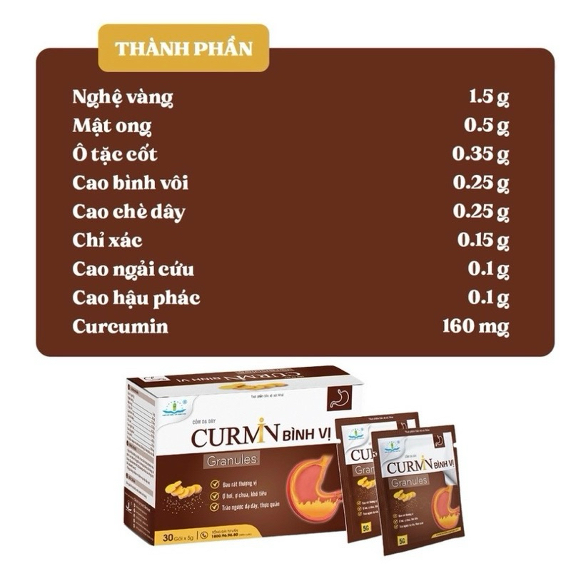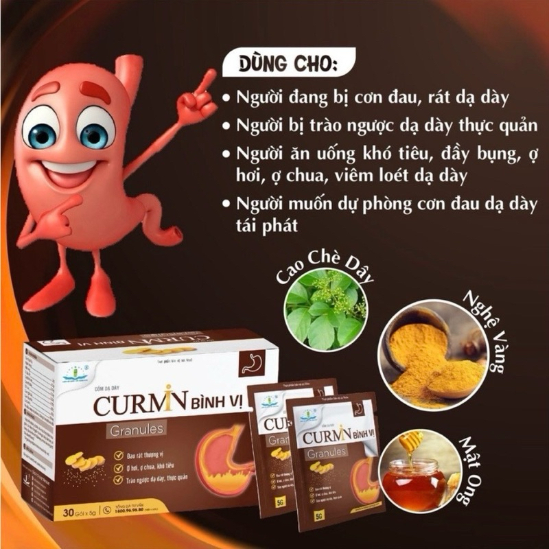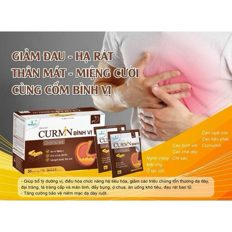 Cốm Dạ Dày Curmin Bình Vị Granules✅ Thành phần- Nghệ vàng: 1.5g- Mật ong: 0.5g- Ô tặc cốt: 0.35g- Cao bình vôi: 0.25g- Cao chè dây: 0.25g- Chỉ xác: 0.15g- Cao ngải cứu: 0.1g- Cao hậu phác: 0.1g- Curcumin: 160mgPhụ liệu: Masgnesi carbnat, đường, hương liệu vừa đủ 1 gói 5g.✅ Công dụng- Giúp bổ tỳ dưỡng vị, điều hòa chức năng hệ tiêu hóa, hỗ trợ giảm các triệu chứng tổn thương dạ dày, đại tràng, tá tràng cấp và mãn tính, đầy bụng, ợ chua, ăn uống khó tiêu, đau rát bao tử.- Tăng cường bảo vệ niêm mạc dạ dày ruột. ✅ Đối tượng sử dụng* Người đang bị cơn đau, rát dạ dày* Người bị trào ngược dạ dày - thực quản* Người ăn uống khó tiêu, đầy bụng, ợ hơi, ợ chua, đau rát thượng vị do viêm loét dạ dày-tá tràng cấp và mãn tính* Người muốn dự phòng cơn đau dạ dày tái phát✅ Cách dùng- Uống trước bữa ăn 30 phút và uống với nước nguội.- Trẻ em trên 6 tuổi: uống ½ - 1 gói/lần, ngày uống 2 lần- Người lớn: uống 1 gói/lần, ngày uống từ 2 – 3 lần- Đợt sử dụng nên kéo dài từ 1 – 3 tháng cùng với chế độ sinh hoạt hợp lý để đạt hiệu quả tốt nhất. Sản phẩm này không phải là thuốc và không có tác dụng thay thế thuốc chữa bệnh. Không dùng cho người mẫn cảm với bất kỳ thành phần nào của sản phẩm