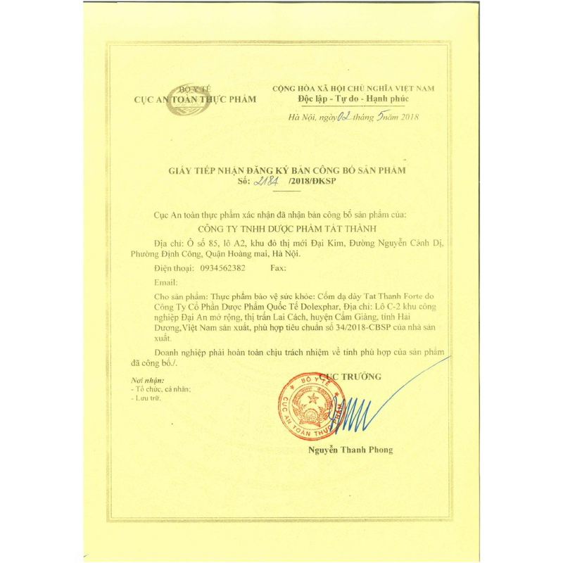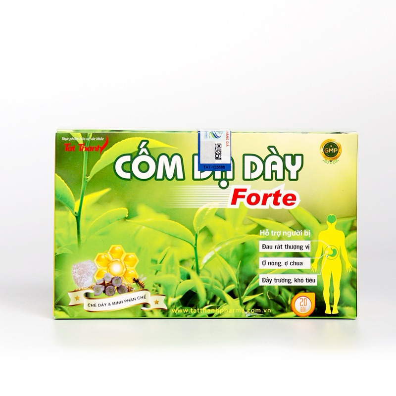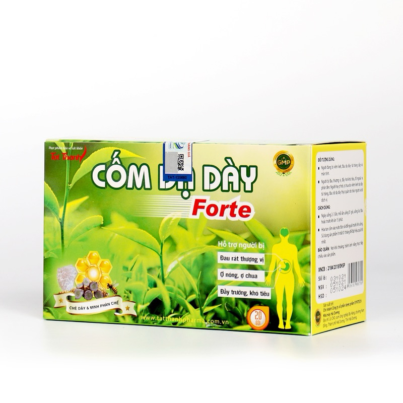 👉 Thực phẩm bảo vệ sức khỏe cốm dạ dày/ viên dạ dày Tất Thành Forte hỗ trợ người bị đau rát thượng vị, ợ nóng, ợ chua, đầy hơi, khó tiêu.✅ Thành phần của cốm dạ dàyTinh nghệ đen……………………….. 1.500mgCao chè dây………………………….. 625mgMật ong………………………………… 500mgCao dạ cẩm…………………………… 380mgÔ tặc cốt……………………………….. 300mgCao bình vôi………………………….. 250mgChỉ xác…………………………………. 200mgMagnesi carbonat………………….. 200mgMinh phàn chế………………………. 150mgHương phụ…………………………… 150mgCam thảo……………………………… 150mgPhụ liệu: Simethicone, đường, hương liệu vừa đủ 01 gói cốm.✅ Thành phần của viên dạ dàyQuy cách: Hộp 30 Viên- Tinh nghệ đen, Cao chè dây, Cao dạ cẩm, Cao chỉ xác, Cao đặc bình vôi, Ô tặc cốt, Magnesi carbonatePhụ liệu: Mật ong , simethicon, magnessium stearate, talc vừa đủ 1 viên✅ Công dụngHỗ trợ giảm các triệu chứng của viem loét dạ dày- tá tràng.Hỗ trợ bổ tỳ.✅ Đối tượng dùngNgười đang bị viem loét, đau dạ dày- tá tràng cấp và mãn tính.Người bị đau thượng vị, đầy hơi khó tiêu, đi ngoài ra phân đen.Người hay ợ hơi, ợ chua do viem loét dạ dày tá tràng, đau rát dạ dày thực quản do trào ngược acid dịch vị.✅ Cách dùng Cốm dạ dàyNgày uống 2-3 lần, mỗi lần uống 1 gói, uống lúc đau hoặc trước khi ăn 15 phút.Hòa tan cốm dạ dày Tất Thành Forte vào nước đun sôi để nguội trước khi uống.Sử dụng sản phẩm cốm Dạ Dày Tất Thành Forte ít nhất 01 tháng để đạt hiệu quả✅ Cách dùng Viên dạ dày- Uống 02 viên/lần x 2-3 lần/ ngày.- Uống lúc đói hoặc trước khi ăn 15 - 30 phút. Sử dụng sản phẩm ít nhất 1 tháng để đạt hiệu quả❌ LƯU Ý: Sản phẩm này không phải là thuốc, không có tác dụng thay thế thuốc chữa bệnh