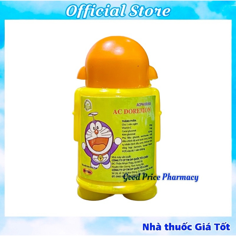 C doremon✅ Thành phần cho 1 viên ngậm:Vitamin C: 2mgCanxi gluconat: 1mgKẽm gluconate: 0.5mgPhụ liệu: glucose, saccharose, chất điều chỉnh độ acid (acid citric), hương tự nhiên (tinh dầu cam), chất tạo màu tổng hợp (tartrazin, sunset yellow FCF) vừa đủ 1 viên 650mg✅ Công dụng:Hỗ trợ bổ sung Vitamin C, tăng cường sức đề kháng✅ Đối tượnd sử dụngNgười có sức đề kháng kémNgười có nhu cầu bổ sung Vitamin C✅ Cách dùngNgậm cho tan trong miệng 1 viên / lầnNgậm 10-20 viên / ngày✅ Thông tin nhà sản xuấtNhà máy sản xuất: công ty CP TM DP Quốc Tế Á ChâuSố tiếp nhận ĐKSP: 8991/2018/ĐKSPBảo quản nơi khô ráo thoáng mátSản phẩm này không phải là thuốc và không có tác dụng thay thế thuốc chữa bệnh