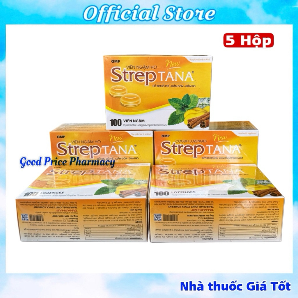 Combo gồm 5 hộp viên ngậm ho Strepatana✅ CÔNG DỤNG NỔI BẬT✔ Hỗ trợ giảm ho, long đờm✔ Làm ấm họng, dịu cổ họng, giảm rát họng – khàn tiếng✔ Hỗ trợ ho do cảm lạnh, ho gió, ho khan, ho có đờm✔ Phù hợp người hay nói nhiều, hút thuốc, thay đổi thời tiết🌱 THÀNH PHẦN THIÊN NHIÊN (trong 1 viên ngậm) • 🌿 Tinh dầu Bạc hà: 7.0 mg • 🌿 Tinh dầu Quế: 1.0 mg • 🌿 Tinh dầu Khuynh diệp: 0.6 mg • 🌿 Tinh dầu Gừng: 0.6 mg • Phụ liệu vừa đủ 2500 mg👉 Hương vị bạc hà – gừng – quế dễ chịu, mát họng, không gắt.⚠️ Sản phẩm là thực phẩm bảo vệ sức khỏe, không phải là thuốc và không có tác dụng thay thế thuốc chữa bệnh.