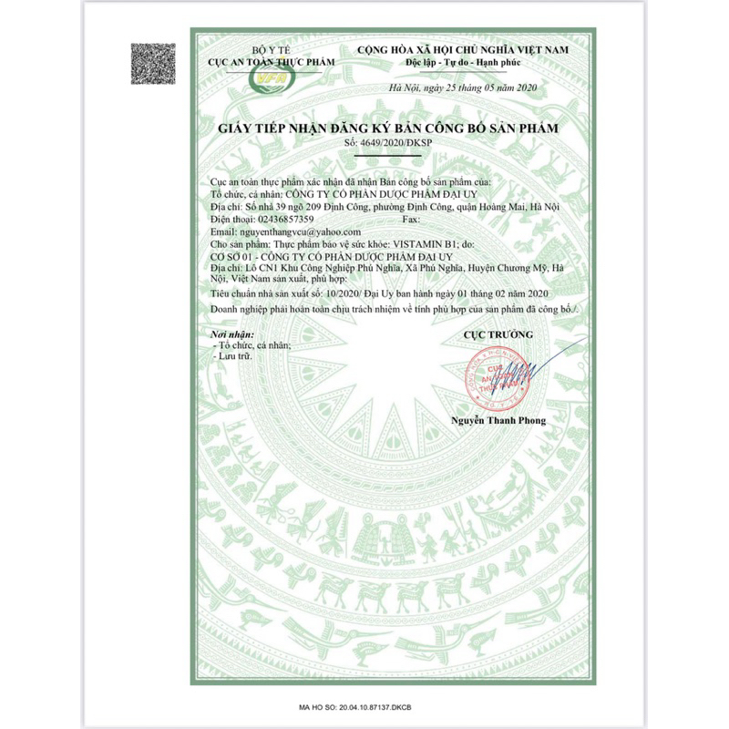 Thành phầnVitamin B1 2500 mcgCông dụng - Bổ sung vitamin B1 cho cơ thể,giúp tăng cường chuyển hóa. - Hỗ trợ giảm nguy cơ cơ thể thiếu vitamin B1 gây tê bì chân taySản phẩm không phải là thuốc và không có tác dụng thay thế thuốc chữa bệnh.Cách dụngNgười lớn và trẻ em trên 10 tuổiUống mỗi lần 1 viên,ngày 2 lầnCó thể dùng liều cao hơn, ngày uống 2_3 lần,mỗi lần 2_3 viênBảo quản: nơi khô ráo,thoáng mát,tránh ánh sáng trực tiếpQuy cách: Lọ 100 viênThực phẩm không phải là thuốc,không có tác dụng thay thế thuốc chữa bệnhSản xuất tại Công ty cổ phần Dược phẩm Đại UySản phẩm không phải là thuốc và không có tác dụng thay thế thuốc chữa bệnh.#vitaminB1 #B1 #vitaminB1_màu_xanh #vitamin_B1