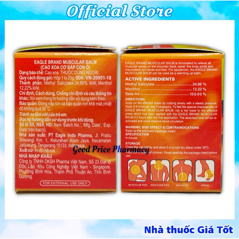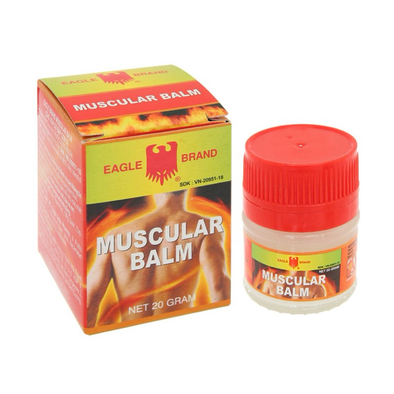 Cao xoa Con Ó Muscular BalmThành phần:Methyl Salicylate..............24,66%Menthol............................12,22%White soft parafin.............35,61%Hard paraffin....................27,51% Dạng bào chế:Cao xoa Chỉ định:Cao xoa cơ bắp Con Ó có tác dụng làm giảm nhanh các cơn đau cơ như: đau vai, đau lưng, đau thắt lưng, đau khớp tay, khớp chân.Đối với các vận động viên, cao xoa cơ bắp Con Ó Muscular Balm có thể được sử dụng như một loại dầu nóng Liều lượng và cách dùng:Day nhẹ vùng bị đau với thuốcBôi 3-4 lần mỗi ngàyĐể cảm nhận được mùi đặc trưng của cao xoa bóp Con Ó, đắp khăn nóng đã có sẵn thuốc lên vùng bị đau 2-3 giờ sau lần điều trị đầu tiên. Hơi nóng lan tỏa giúp cải thiện lưu thông máu Chống chỉ định:Không sử dụng cao xoa cho trẻ em dưới 2 tuổi Đóng gói:Hộp 20 gam (Hộp lớn gồm 12 hộp nhỏ) Nhà sx:PT Eglin Pharma, Indonesiadưới sự đồng ý của cty Borden, Singapore❌ SẢN PHẨM NÀY KHÔNG PHẢI LÀ THUỐC VÀ KHÔNG CÓ TÁC DỤNG THAY THẾ THUỐC CHỮA BỆNH