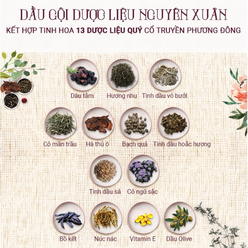 Dầu gội Dược liệu Nguyên Xuân là dầu gội được nghiên cứu dựa trên kinh nghiệm dân gian, kết hợp với những nghiên cứu mới của khoa học hiện đại . Với 13 vị Dược liệu Cổ truyền như bạch quả, hà thủ ô, bồ kết, hương nhu, cỏ mần trầu vỏ quả bưởi, sả chanh, núc nác, dâu tằm, cỏ ngũ sắc… dầu gội Dược liệu Nguyên Xuân giúp dưỡng da đầu và dưỡng tóc từ gốc, giảm tóc gãy rụng, hỗ trợ mọc tóc mới. Từ đó, giúp giảm các vấn đề về tóc: rụng tóc, tóc khô và xơ, da đầu ngứa và hỗ trợ trị tóc nhiều gàu.Dầu gội Dược liệu Nguyên Xuân Nâu còn được bổ sung thêm các thành phần: Vitamin E, dầu olive, …. giúp tóc mềm mại, suôn mượt. Nguyên Xuân thích hợp cho người có mái tóc khô, xơ chẻ ngọn, tóc bị hư tổn do hóa chất uốn, ép, nhuộm…Đối tượng sử dụng:Dùng cho mọi người để có mái tóc dày , mềm mại, suôn mượt.- NGUYÊN XUÂN NÂUNgười có nguy cơ hoặc biểu hiện rụng tóc: người mới ốm dậy, phụ nữ mang thai và sau sinh; người sử dụng hóa chất uốn, ép, nhuộm tóc.Người hay bị ngứa da đầu, nhiều gàu.- NGUYÊN XUÂN DƯỠNG TÓC (XANH LÁ)Người có nguy cơ hoặc biểu hiện rụng tóc: người mới ốm dậy, phụ nữ mang thai và sau sinh; người sử dụng hóa chất uốn, ép, nhuộm tóc.Người hay bị ngứa da đầu, nhiều gàu.- NGUYÊN XUÂN BỒNG BỀNH (VÀNG)Sử dụng cho người có tóc và da đầu dầu, tóc bếtPhục hồi tóc hư tổn, giảm tóc khô xơ chẻ ngọn và gãy rụng do sử dụng nhiều dịch vụ uốn ép nhuộm hay dầu gội hóa chấtDưỡng da đầu và dưỡng tóc từ gốc khiến tóc luôn mềm mại, suôn mượt, bồng bềnh.Giảm rụng tóc, hỗ trợ mọc tóc mới.Giảm gàu hết ngứa.- NGUYÊN XUÂN SẠCH GÀU (XANH DƯƠNG)Dùng cho mọi người để có mái tóc dày, mềm mại, suôn mượt. (Đặc biệt là người có nguy cơ hoặc biểu hiện rụng tóc: người mới ốm dậy, phụ nữ mang thai và sau sinh; người sử dụng hóa chất uốn, ép, nhuộm tóc. Người hay bị ngứa da đầu, nhiều gàu, nấm da đầu).Liều dùng, cách dùng:Làm ướt tóc và da đầu. Lấy khoảng 3-5 ml dầu gội thoa đều và gội nhẹ nhàng rồi xả kỹ bằng nước sạch. Có thể gội lần thứ 2 giúp tóc mềm mượt hơn.#nguyenxuan #bongbenh #daugoiduoclieu #hoalinh #vang #nau #xanh #sachgau #duongtoc #xanhduong