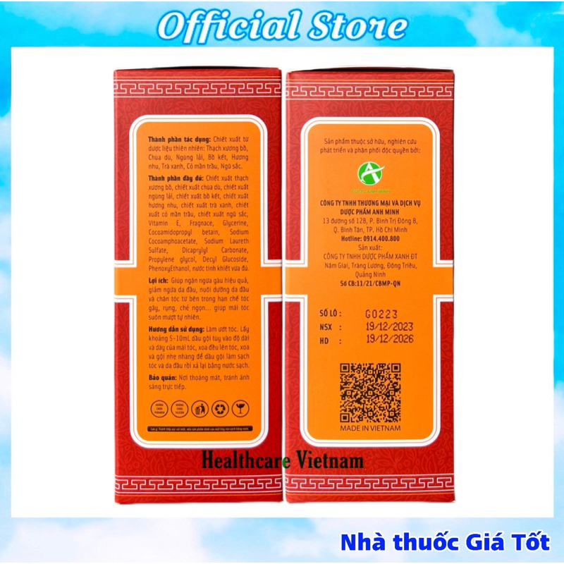 Thành phần- Thành phần chính là bồ kết kết hợp với các loại thảo dược tốt cho tóc như: vỏ bưởi, hương nhu, lá khế, lá sả, lá dâu, cỏ mần trầu; cỏ ngũ sắc và bồ hòn...Công dụng- Giúp bạn phục hồi tóc hư tổn; nuôi dưỡng tóc bóng mượt và giúp mọc tóc hiệu quả.- Giúp dưỡng tóc và da đầu, giúp cho tóc khỏe, không bị khô xơ, chẻ ngọn, cho mái tóc mềm mại, suôn mượt, giảm gãy rụng, góp phần hỗ trợ mọc tóc mới- Hương thơm dược liệu tự nhiên mang lại cảm giác mát mẻ, sảng khoái, thư giãn khi gội đầu.Hướng dẫn sử dụngBước 1: Làm ướt tóc và cả da đầu.Bước 2: Lấy khoảng 3 – 5ml dầu gội tùy thuộc vào độ dài và độ dày của mái tóc.Bước 3: Thoa đều dầu gội lên tóc và kết hợp cả massage nhẹ nhàng để làm sạch da đầu cũng đồng thời giúp cho các dưỡng chất thấm sâu vào bên trong sợi tóc.Bước 4: Xả kỹ tóc bằng nước sạch.Dung tích: 250mlXuất xứ: Việt NamThương hiệu : Dược Anh Minh