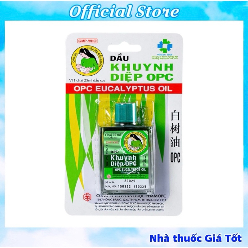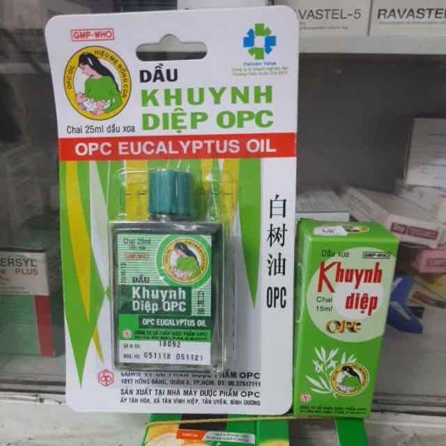 Dầu khuynh diệp OPC 25ml-OPC|Mã SP:M017-Kích thước bao bì (dài x rộng x cao, cm):11 x 4 x 17-Khối lượng bao bì (kg):0.11- Thành phần:Eucalytol 64,833g, Camphor 18,750g, dầu parafin, màu xanh chlorophy 100ml.- Dung tích:25ml- Nơi sản xuất:Việt Nam.THÔNG TIN CHI TIẾT-Dầu khuynh diệp OPC 25ml giúp ngăn ngừa và ho, cảm cúm, nghẹt mũi, côn trùng cắn, trật gân, chóng mặt, nhức đầu, ăn khó tiêu...- Khi xông bạn có thể cho khoảng 5 tới 10giọt vào 250mlnước nóng để xông.- Bị nhức đầu chóng mặthoặc cảm cúm, nghẹt mũibạn xoa dầu vào 2 bên thái dương, cổ, sau gáy và mũi.- Khi bị côn trùng cắn, bạn xoa vào vết côn trùng cắn, sẽ giảm ngứa nhanh trong vài phút.- Lưu ý: không bôi dầu trực tiếp lên mặt của trẻ sơ sinh và trẻ nhỏ. Đọc kỹ hướng dẫn trước khi sử dụng.