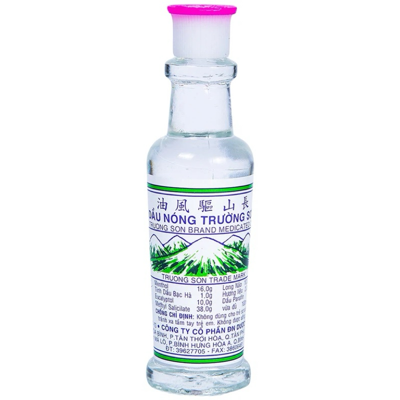 " Thực phẩm không phải là thuốc và không có chức năng thay thế thuốc chữa bệnh."==> Dầu nóng trường sơn có thành phần chính là Menthol, tinh dầu bạc hà, Eucalyptol, Methylsalicylat, long não, tinh dầu Lavand, dùng để làm giảm cảm, ho, sổ mũi, trúng gió, nhức đầu, say tàu xe, xoa bóp chống viêm cảm, muỗi chích, kiến cắn, buồn nôn, đau bụng, nhức mỏi tay chân, đau khớp, trật gân.1. Thành phần của Dầu nóng Trường Sơn:Dược chất chính: Menthol 16.0g, Tinh dầu bạc hà 1.0g, Eucalyptol 10.0g, Methyl salicylat 38.0g, Long não 10.0g, Hương liệu 2.0g, dầu paraffin.Hàm lượng: Dung dịch bôi ngoài da lọ10ml2. Công dụng của Dầu nóng Trường Sơn:Làm giảm cảm, ho, sổ mũi, trúng gió, nhức đầu, say tàu xe, xoa bóp chống viêm cảm, muỗi chích, kiến cắn, buồn nôn, đau bụng, nhức mỏi tay chân, đau khớp, trật gân.3. Cách dùng Dầu nóng Trường Sơn:Thoa và xoa bóp chỗ đau.Pha với nước ấm để xông, thoa bôi lên mũi để hít và ngửi.Chống chỉ định:Không dùng cho trẻ em dưới 3 tuổi.Thận trọng:Phụ nữ có thai và cho con bú.Tránh xa tầm tay trẻ emĐọc kỹ hướng dẫn trước khi dùng.Bảo quảnBảo quản ở nhiệt độ không quá 30 độ C.