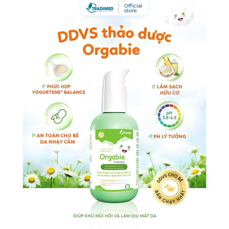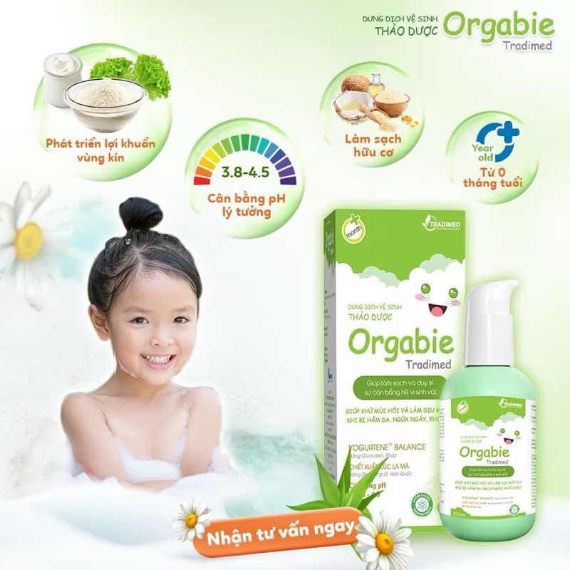 Dung Dịch Vệ Sinh Thảo Dược Cho Bé Gái Orgabie Tradimed 100ml Cho Bé Từ Sơ Sinh Tới Trước Dậy Thì✅ Đối tượng sử dụng: Dùng cho các bé gái từ giai đoạn sơ sinh đến trước dậy thì✅ Công Dụng Sản Phẩm: Giúp làm sạch nhẹ nhàng, kháng khuẩn, khử mùi hôi, duy trì độ ẩm và độ cân bằng pH tự nhiên, cho da vùng kín mềm mịn. Giúp làm dịu mát da khi bị: hăm da, ngứa ngáy, khó chịu. Góp phần ngăn ngừa viêm nhiễm, nấm ngứa vùng kín của bé gái✅ Thành Phần: Purified Water, Chamomilla Recutita (Matricaria) Flower Extract (Chiết xuất Cúc la mã), Aloe vera extract (Chiết xuất Lô Hội), Camellia sinensis extract (Chiết xuất trà xanh), Persea americana fruit extract (Chiết xuất quả bơ), Citrus Maxima Essential Oil (Tinh dầu Bưởi), Thymus Vulgaris Essential Oil (Tinh dầu Bách Lý Hương), Yogurtene Balance (Yogurt Powder (bột sữa chua) and Inulin), Decyl Glucoside, Panthenol (Vitamin B5), Tocopheryl Acetate (Vitamin E), Bisabolol, Allantoin, Cocamidopropyl Betaine, Sodium Chloride, Silver (Nano silver), Potassium sorbate, Disodium EDTA, Lactic acid✅ Hướng Dẫn Sử Dụng: - Làm ướt vùng kín và lấy một lượng gel vừa đủ, thoa rửa nhẹ nhàng vùng kín cho bé, sau đó rửa lại thật kỹ bằng nước sạch. - Sử dụng sau mỗi lần thay bỉm hoặc vệ sinh cá nhân hoặc khi tắm cho bé. - Có thể dùng thay thế sữa tắm cho bé. * Lưu ý: Sản phẩm này chỉ dùng để rửa ngoài, không dùng để thụt rửa bên trong.