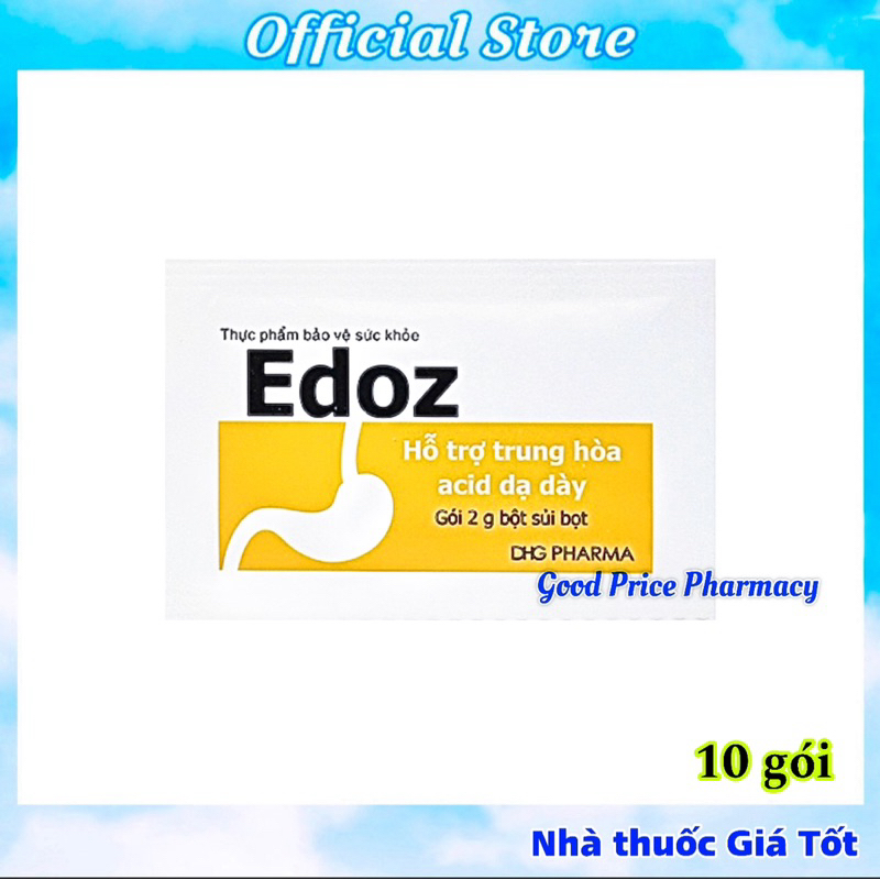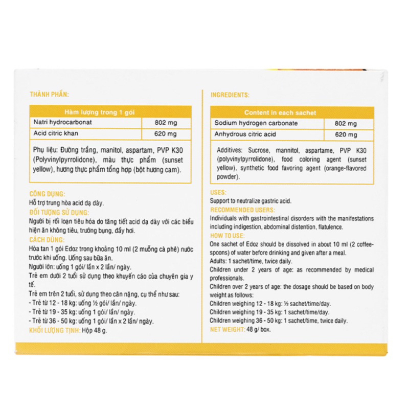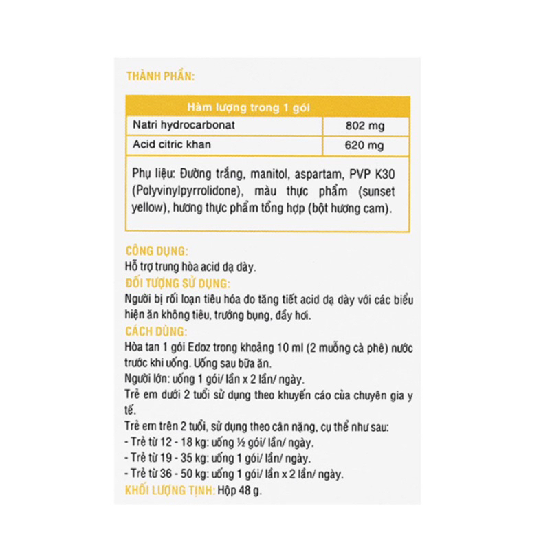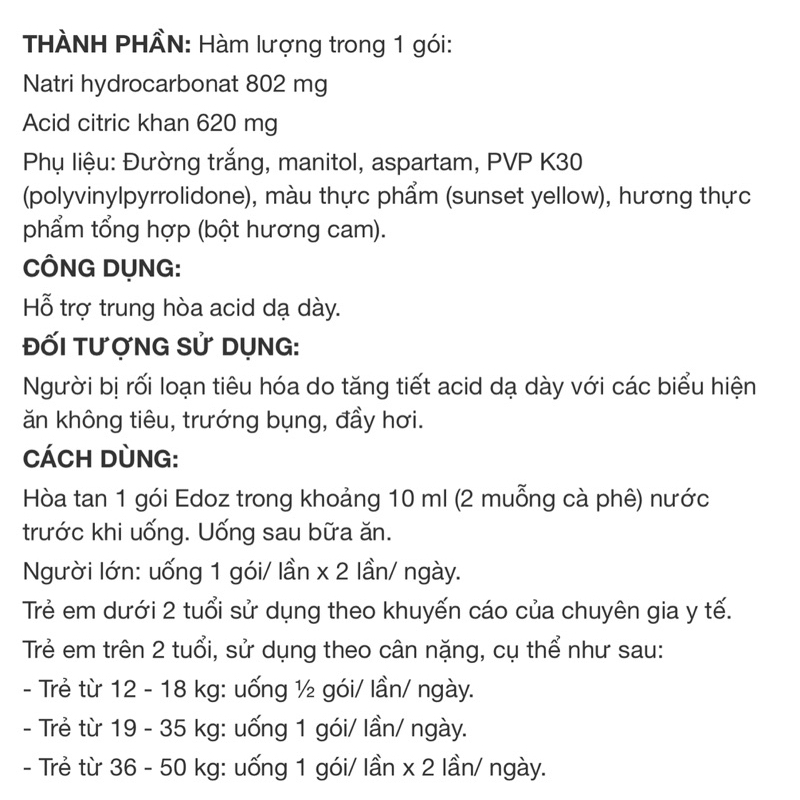 CÔNG DỤNGGiúp giảm các triệu chứng khó tiêu do acid và rối loạn tiêu hóa như trướng bụng, đầy hơi, ăn không tiêu.ĐỐI TƯỢNG SỬ DỤNGNgười bị rối loạn đường tiêu hóa: ăn không tiêu, tăng tiết acid dạ dày, ợ nóng, trướng bụng, đầy hơi, buồn nôn, nôn.Trẻ em ăn không tiêu, nấc cụt.CÁCH DÙNGHòa tan Edoz Kids trong nước trước khi uống. Uống sau bữa ăn.Trẻ em từ 2 - 12 tuổi: 1 - 2 gói x 3 lần/ ngày.Người lớn và trẻ em trên 12 tuổi: 2 - 3 gói x 3 lần/ ngày.CHÚ ÝSản phẩm này không phải là thuốc và không có tác dụng thay thế thuốc chữa bệnh.