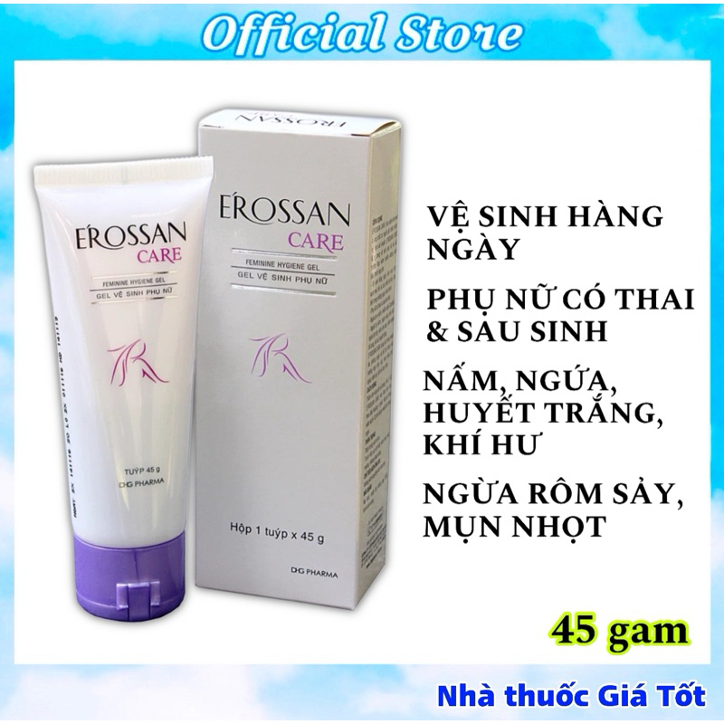 Gel vệ sinh Phụ nữ Erossan Care (Dược Hậu Giang - DHG Pharma) - Làm sạch, khử mùi, huyết trắng, bôi rôm sảy, mụn, nấmTuýp 45gChi tiếtTHÀNH PHẦN:De-ion water, sodium lauryl sulfate, glycerin, hydroxypropyl methylcellulose 615, ethanol 96%, alpha - terpineol, PEG - 12 dimethicone, perfume, menthol crystal, citric acid (monohydrate), CI 16185, CI 42090.CÔNG DỤNG:E’ROSSAN CARE chứa alpha-terpineol là hợp chất có nguồn gốc thiên nhiên, có tính sát khuẩn. E’ROSSAN CARE dùng trong vệ sinh phụ nữ và các trường hợp viêm nhiễm đường sinh dục, thích hợp cho:- Vệ sinh hằng ngày: làm mát, làm sạch mùi hôi và các chất dơ bẩn, đặc biệt trong những ngày hành kinh.- Phụ nữ có thai và sau khi sinh.- Ngứa do vi nấm, nhiễm nấm Candida.- Người bị viêm, ngứa vùng sinh dục: ngứa âm hộ, viêm âm đạo, viêm ngoài tử cung, khí hư, huyết trắng.E’ROSSAN CARE dùng sát trùng ngoài da, phòng ngừa và hỗ trợ trong các trường hợp: rôm, sảy, mụn nhọt, ghẻ ngứa, nấm da, nấm kẻ tay chân, …CÁCH DÙNG:Thấm ướt vùng cần sử dụng, cho 2 - 5 g E’ROSSAN CARE vào lòng bàn tay, thoa đều khoảng 1 phút. Rửa lại bằng nước sạch. Có thể dùng nhiều lần trong ngày. BẢO BẢO QUẢN: Nơi khô, nhiệt độ không quá 30oC, tránh ánh sáng.THẬN TRỌNG:Thận trọng với trẻ em.Tránh tiếp xúc với mắt, niêm mạc mũi, miệng. Không được uống.CHỈ TIÊU KÍCH ỨNG DA:Không kích ứng đến kích ứng nhẹ.#gelvesinh #vesinhphunu #erossan #erossancare #erosan