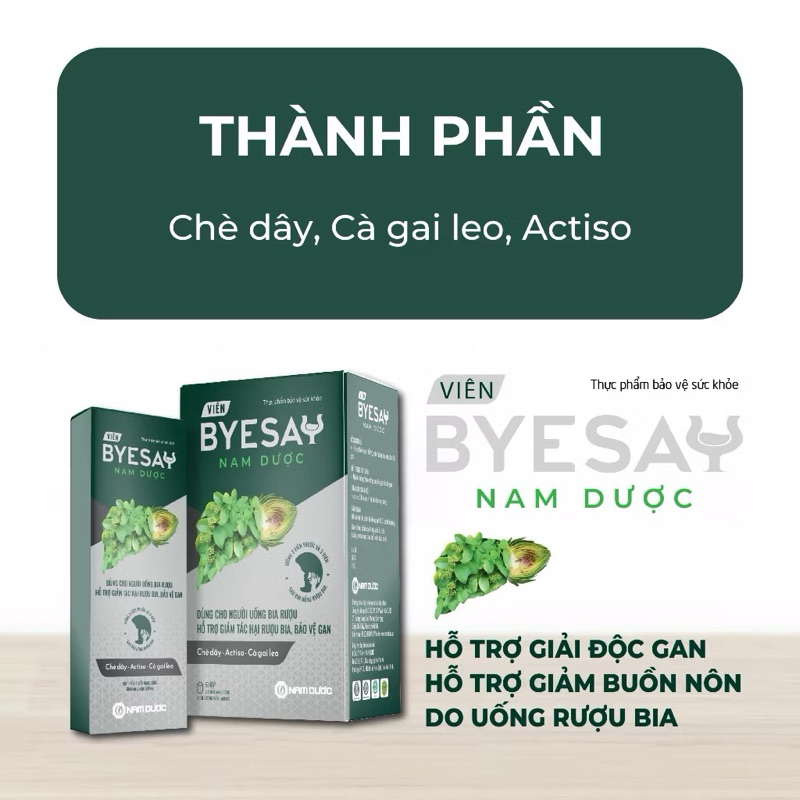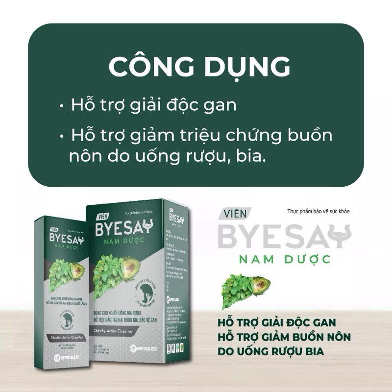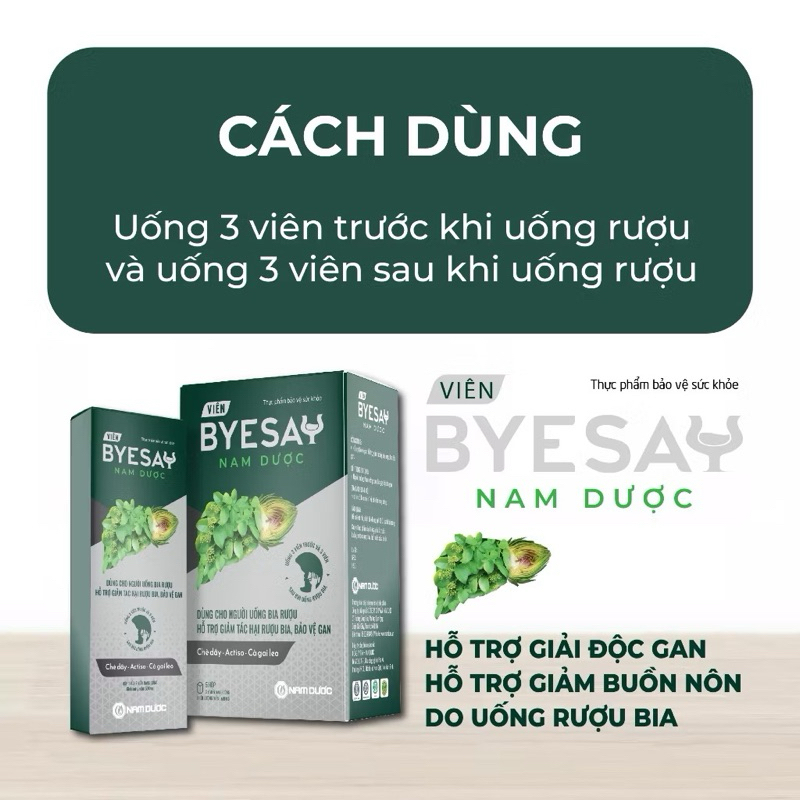 CÔNG DỤNG- Tăng cường chuyển hoá rượu bằng cách làm chậm quá trình chuyển hoá thành Acetaldehyd- Thúc đẩy quá trình chuyển hoá Acetaldehyd thành acid acetic, rồi tạo thành CO2 và H2O không độc hại đối với cơ thể- Do đó, sản phẩm có tác dụng ngăn chặn những tác hại do rượu gây ra đối với các cơ quan trong cơ thể con người, giảm bớt tỷ lệ nghiện do rượu.THÀNH PHẦN VIÊN UỐNGChè dây ……………................... 0,7 gCà gai leo …………...................0,35 gActiso…..................... 0,14 gAmidon, aerosil, kali sorbat, PEG 6000, tween 80. talc, magnesi stearat vừa đủ 1 viên.THÀNH PHẦN GÓI NƯỚCChè dây ……..4.0 gCà gai leo …. 2.0 gAstiso……..... 0.8 gĐường phèn, kali sorbat, nước RO vừa đủ.......60mlĐỐI TƯỢNG SỬ DỤNGNgười hay phải uống rượu bia, người bị say rượu, người nghiện rượu.Người bị các triệu chứng khó chịu sau khi uống rượu, bia như: Đau đầu, mệt mỏi, buồn nôn, chướng bụng.Người suy giảm chức năng gan.HƯỚNG DẪN SỬ DỤNG VIÊN UỐNG- Để có hiệu quả giải rượu tốt nhất và phòng ngừa say rượu, uống 3 viên Giải rượu Nam Dược với nước ấm trước khi sử dụng rượu, bia khoảng 1 giờ và 3 viên sau khi uống rượu bia. - Trường hợp quên uống viên Giải rượu Nam Dược trước khi sử dụng rượu bia có thể uống 6 viên sau khi uống rượu bia để hạn chế các triệu chứng nhức đầu, khó chịu do rượu bia gây ra. - Trường hợp suy giảm chức năng gan, vàng da, mụn nhọt, mẩn ngứa, mệt mỏi, kém ăn, ăn đắng miệng, đi tiểu ít, nước tiểu đỏ, rối loạn tiêu hoá: uống ngày 2 lần x 2 viên/lần, đợt dùng 15-30 ngày.HƯỚNG DẪN SỬ DỤNG GÓI NƯỚC- Để có hiệu quả giải rượu tốt nhất và phòng ngừa say rượu, giảm các triệu chứng khó chịu do uống nhiều rượu bia: uống 1 túi trước hoặc sau khi uống rượu. Hiệu quả tốt nhất nếu uống 1 túi trước khi uống rượu 1 giờ. Có thể uống thêm 1 túi sau khi uống rượu, trong trường hợp người mệt mỏi hoặc uống quá nhiều.- Trường hợp suy giảm chức năng gan, vàng da, mụn nhọt, mẩn ngứa, mệt mỏi, kém ăn, ăn đắng miệng, đi tiểu ít, nước tiểu đỏ, rối loạn tiêu hóa: uống ngày 2 lần x 1 túi, đợt dùng 15-30 ngày.BẢO QUẢN Để nơi khô ráo, tránh ánh sáng.HẠN DÙNG36 tháng kể từ ngày sản xuấtLưu ý- Sản phẩm này không phải là thuốc và không có tác dụng thay thế thuốc chữa bệnh.Sản xuất bởi: Công ty TNHH Nam Dược - Việt Nam