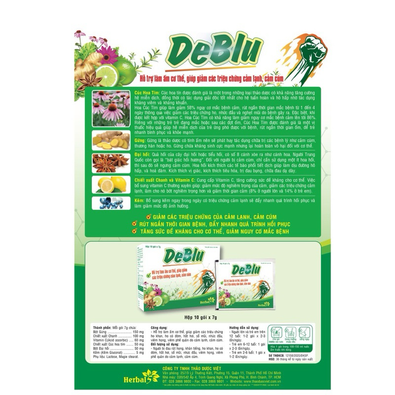 Thành phần: mỗi gói 7g chứaBột gừng:......................... 150 mgChiết xuất Chanh:............ 100 mgVitamin C (Acid ascorbic): 60 mgChiết xuất Cúc hoa tím:..... 50 mgBột Đại hồi:....................... 50 mgKẽm (Kẽm Gluconat):......... 5 mgPhụ liệu: Lactose, Magie stearat.Công dụng:Hỗ trợ làm ấm cơ thể, giúp giảm các triệu chứng ho khan, ho có đờm, hắt hơi, sổ mũi, nhức đầu, viêm họng, viêm phế quản do cảm lạnh, cảm cúm.Hướng dẫn sử dụng:Người lớn và trẻ em trên 12 tuổi: 1-2 gói x 2-3 lần /ngày.Trẻ em 6-12 tuổi: 1 gói x 2-3 lần/ngày.Trẻ em 2-6 tuổi: 1 gói x 1-2 lần/ngày.Sản phẩm không phải là thuốc, không thể thay thế thuốc chữa bệnh.