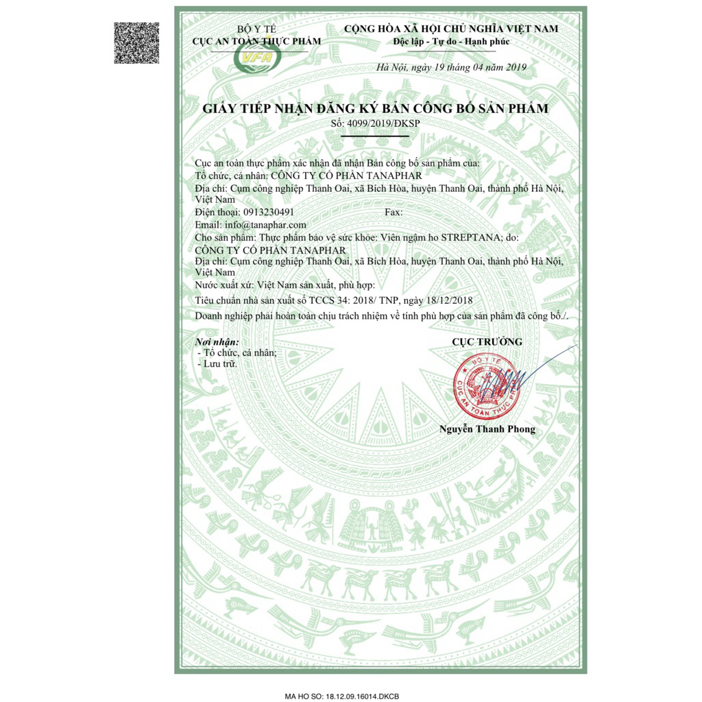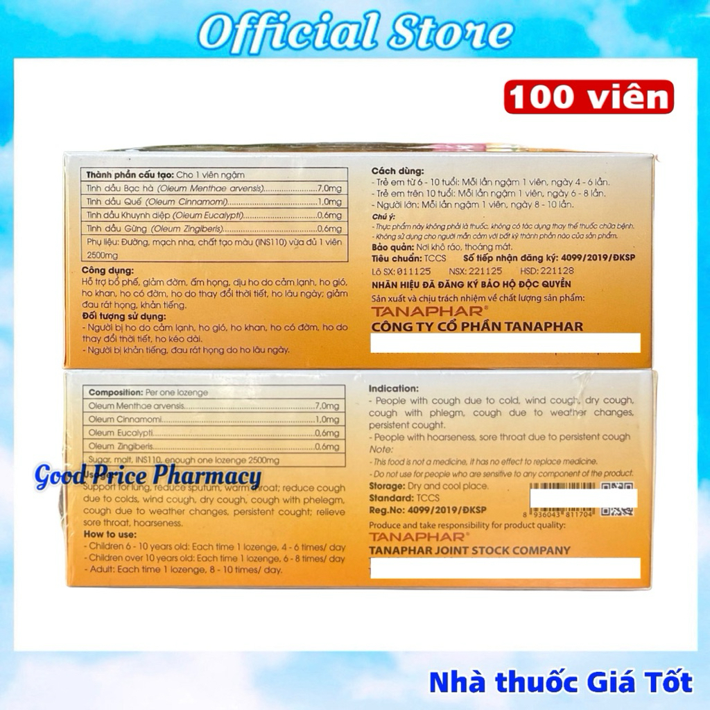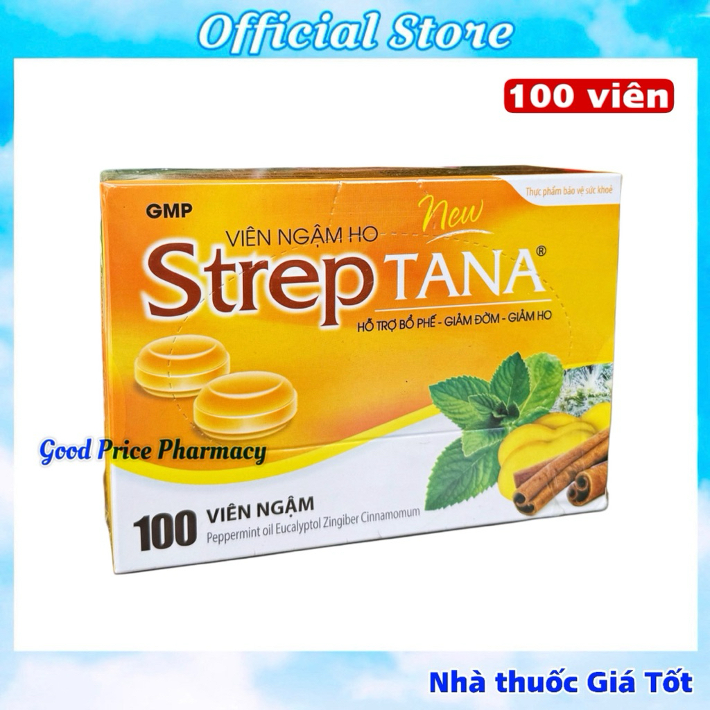 🌿 Viên Ngậm Ho Streptana – Giảm Ho, Long Đờm, Dịu Họng (Hộp 100 Viên) 🌿🔰 Official Store – Hàng chính hãng TANAPHAR🔰 Chuẩn GMP – Đã đăng ký Bộ Y Tế🔰 Phù hợp cho cả người lớn & trẻ em trên 6 tuổi✅ CÔNG DỤNG NỔI BẬT✔ Hỗ trợ giảm ho, long đờm✔ Làm ấm họng, dịu cổ họng, giảm rát họng – khàn tiếng✔ Hỗ trợ ho do cảm lạnh, ho gió, ho khan, ho có đờm✔ Phù hợp người hay nói nhiều, hút thuốc, thay đổi thời tiết🌱 THÀNH PHẦN THIÊN NHIÊN (trong 1 viên ngậm) • 🌿 Tinh dầu Bạc hà: 7.0 mg • 🌿 Tinh dầu Quế: 1.0 mg • 🌿 Tinh dầu Khuynh diệp: 0.6 mg • 🌿 Tinh dầu Gừng: 0.6 mg • Phụ liệu vừa đủ 2500 mg👉 Hương vị bạc hà – gừng – quế dễ chịu, mát họng, không gắt.👨👩👧 ĐỐI TƯỢNG SỬ DỤNG✔ Người bị ho do cảm lạnh, ho gió, ho lâu ngày✔ Người khàn tiếng, đau rát họng✔ Người làm việc nói nhiều, môi trường máy lạnh, khói bụi✔ Trẻ em từ 6 tuổi trở lên & người lớn📌 CÁCH DÙNG • 👶 Trẻ 6–10 tuổi: Ngậm 1 viên/lần, ngày 4–6 lần • 🧒 Trẻ trên 10 tuổi: Ngậm 1 viên/lần, ngày 6–8 lần • 👨 Người lớn: Ngậm 1 viên/lần, ngày 8–10 lần📌 Ngậm tan từ từ, không nhai để đạt hiệu quả tốt nhất.📦 THÔNG TIN SẢN PHẨM • Quy cách: Hộp 100 viên ngậm • Dạng: Viên ngậm ho • Tiêu chuẩn: TCCS • Số ĐKSP: 4099/2019/ĐKSP • Nhà sản xuất: CÔNG TY CỔ PHẦN TANAPHAR • Bảo quản: Nơi khô ráo, thoáng mát⚠️ Sản phẩm là thực phẩm bảo vệ sức khỏe, không phải là thuốc và không có tác dụng thay thế thuốc chữa bệnh.