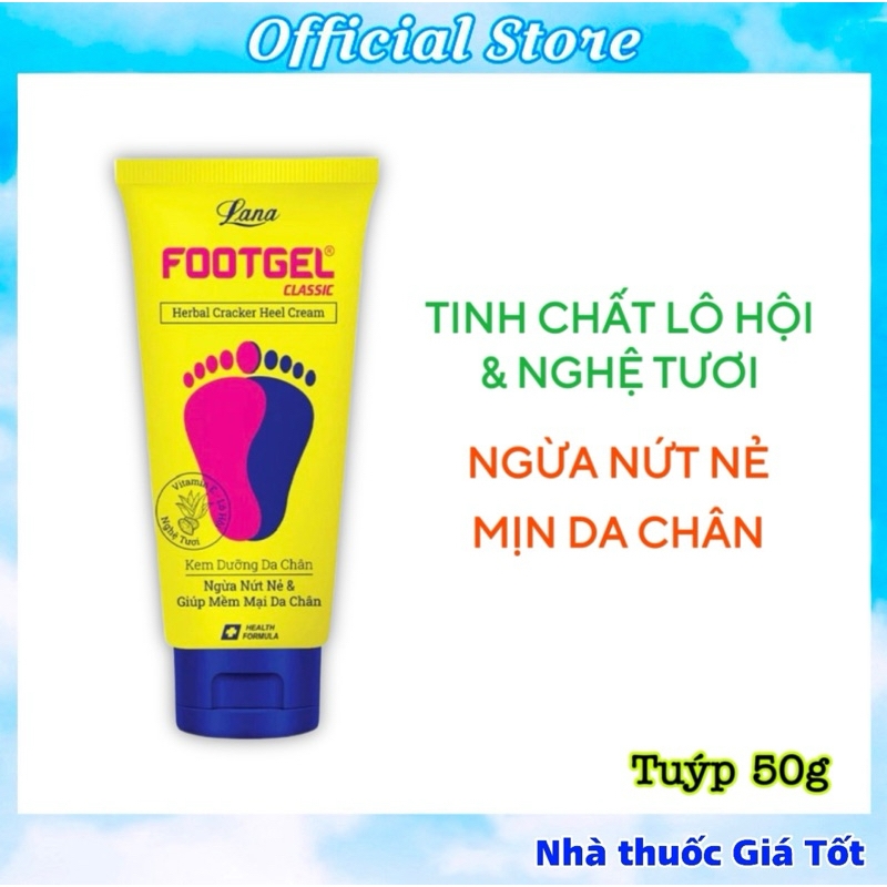 Kem Dưỡng Da Chân FOOTGEL là liệu thảo mộc hoàn toàn tự nhiên: Lô hội và củ Nghệ tươi. Với kỹ thuật tiên tiến, các hoạt chất trong cây Lô hội và củ Nghệ được ly trích hoàn toàn nhằm mang lại hiệu quả cao trong việc nhanh chóng các vết nứt nẻ da chân, đặc biệt là gót chân. FOOTGEL LANA còn được phối hợp với Vitamin E hàm lượng cao, giúp kéo da non nhanh& mềm mại.Làm lành nhanh chóng các vết nứt nẻ gót chân, da bàn chân, các trường hợp ” nước ăn da”.Dưỡng da bàn chân, bắp chân và da quanh móng chân không bị khô, chai sần,… giúp da láng mịn, không bị “mốc trắng”.Cách sử dụng: Rửa sạch bàn chânlau khô. Thoa kem lên vùng da chân bị nứt nẻ, kẽ ngón chân, vùng da quang móng chân và bắp chân. Để khô tự nhiên. Mỗi ngày thoa 1-2 lần. Thoa liên tục hằng ngày đến khi lành hẳn.