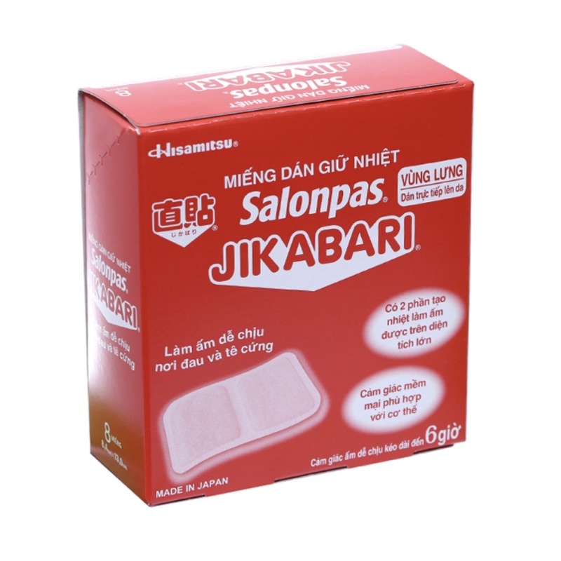 ✳️Miếng dán giữ nhiệt Salonpas Jikabari là miếng dán y tế, sinh nhiệt bằng phản ứng sắt với oxy trong không khí và chất xúc tác là muối giúp làm ấm cơ thể, cải thiện vùng tuần hoàn, kích thích tiêu hóa, làm giảm các triệu chứng mỏi cơ, cứng cơ, đau cơ và khó chịu trong chu kỳ kinh nguyệt, đau dây thần kinh.✳️Công dụng:Cải thiện tuần hoàn máu.Làm giảm các triệu chứng mỏi cơ, cứng cơ, đau cơ và khó chịu trong chu kỳ kinh nguyệt, đau dây thần kinh.Kích thích hoạt động đường tiêu hoá.Làm ấm cơ thể.✳️Hướng dẫn sử dụng: Gỡ bỏ miếng phim ở mặt sau và dán miếng dán vào nơi cần làm ấm 1 ngày 1 lần trong 6 giờ.✳️Thận trọng:Chỉ sử dụng theo như hướng dẫn.Không cắt, chà, gấp hoặc xé miếng dán.Nếu phần bên trong của miếng dán tiếp xúc trực tiếp với da, lau sạch bằng khăn ướt hoặc rửa sạch.Không làm ẩm miếng dán bằng nước.Gỡ miếng dán khỏi da trước khi tắm.Không dán liên tục cùng một vị trí nếu bạn có da nhạy cảm.Chỉ sử dụng mỗi miếng dán 1 lần.Ngưng sử dụng và hỏi ý kiến Bác sĩ hoặc Dược sĩ nếu nổi mụn, ngứa, đỏ da, hoặc kích ứng da quá mức xảy ra.✳️Bảo quản:Nơi khô ráo thoáng mát, tránh ánh nắng trực tiếp. Để xa tầm tay trẻ em.Sử dụng miếng dán ngay khi mở bao bì, vì miếng dán sẽ sinh nhiệt khi bao bì được mở ra.Đảm bảo chắc chắn miếng dán đã hoàn toàn mát sau khi sử dụng và được bỏ đi như là rác không cháy.✳️Xuất xứ thương hiệu: Nhật Bản✳️Sản xuất tại: Nhật Bản#JIKABARI #salonpas #hisamistu