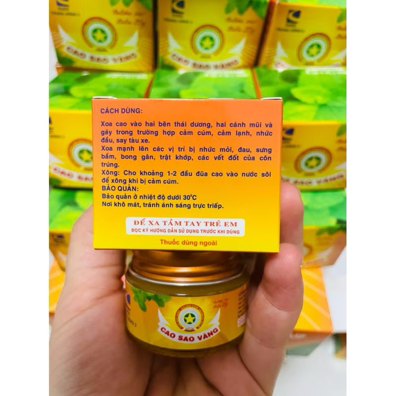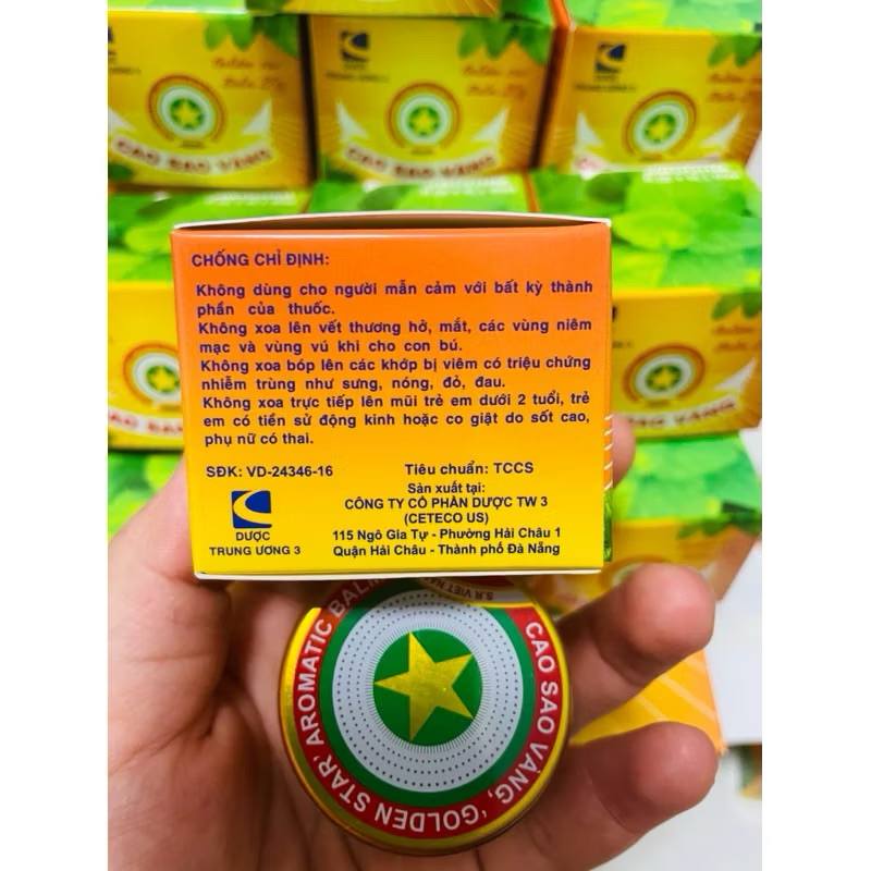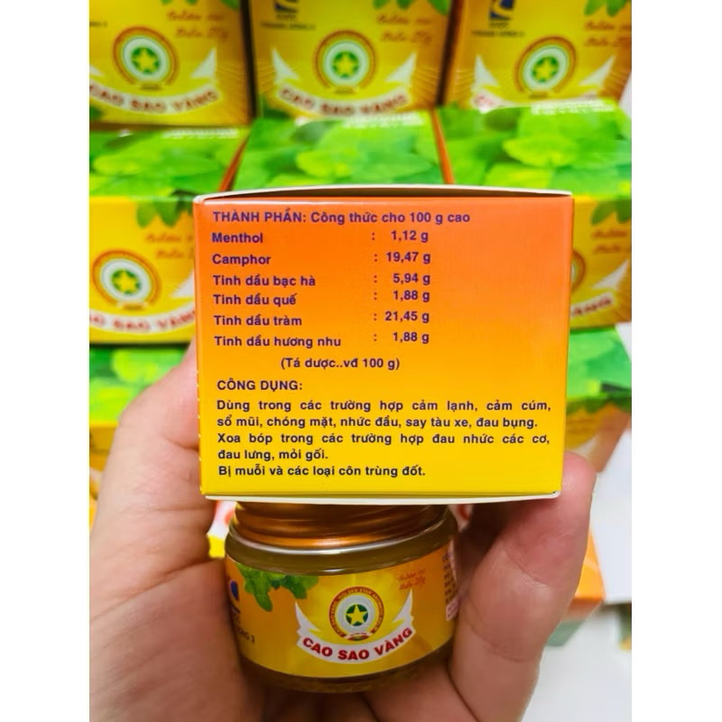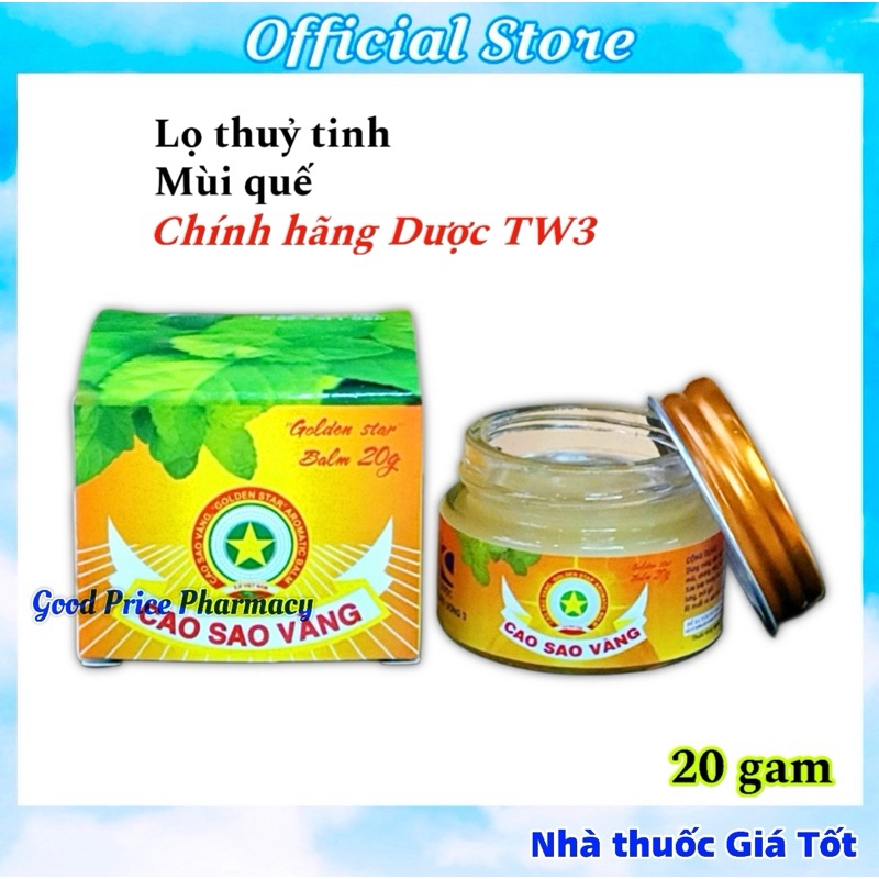 Cao sao vàng 20g chính hãng Dược Trung Ương 3Cao sao vàng 20g Dược TW3 ( Dầu Cù Là ) - Golden star Balm Giảm Đau Nhức, Côn Trùng Đốt, Say Tàu Xe- Khối lượng: 20g- Nguồn gốc: Việt Nam- Hạn sử dụng: 5 năm kể từ ngày sản xuất- Bao bì bằng giấy bên ngoài, bên trong là hộp sành chứa cao.- Cao thơm và dễ chịu.✅ Cách dùng:+ Nhức đầu, chóng mặt, cảm cúm, say tàu xe: Xoa dầu cao vào hai bên thái dương và gáy, xoa vào lỗ mũi.+ Khi bị muỗi và các côn trùng khác đốt: Xoa dầu cao vào chỗ bị đốt.+ Có thể xông: Cho khoảng 1 – 2 đầu đũa dầu cao vào nước sôi để xông
