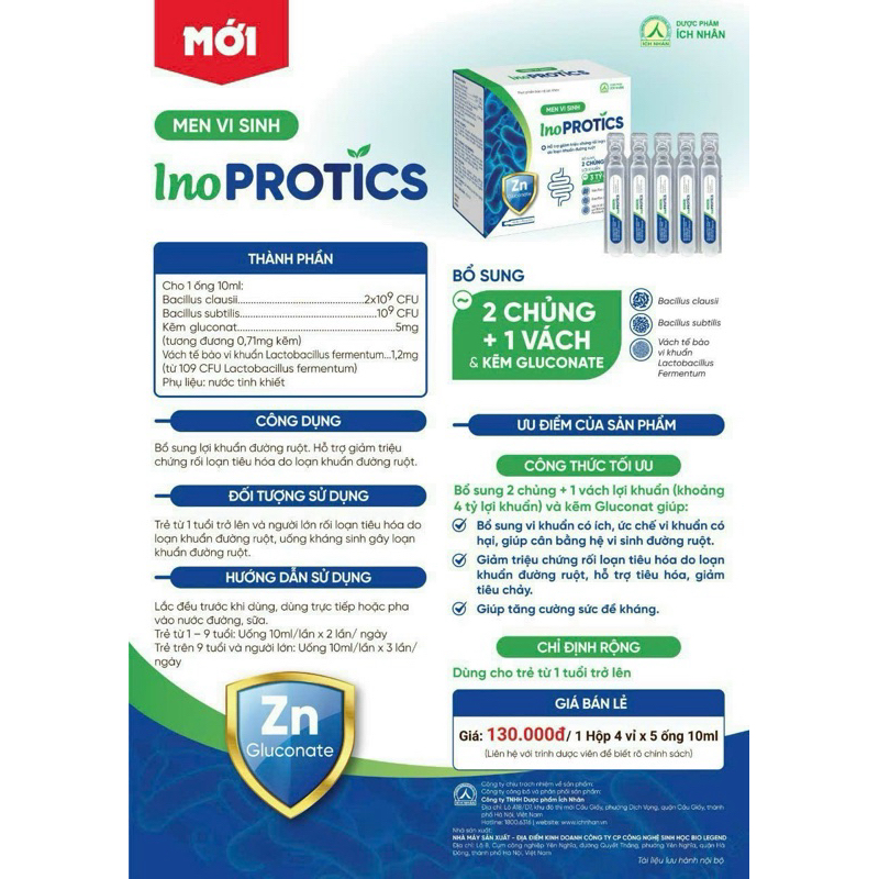 QUY CÁCH: Hộp 20 ống 10ml.THƯƠNG HIỆU: DƯỢC PHẨM ÍCH NHÂN.MÔ TẢ: Men vi sinh InoProtics: Công thức bổ sung lợi khuẩn chuẩn 3 trong 11️⃣ Bào tử lợi khuẩn dòng Bacillus clausii và Bacillus subtilis (sống sót mạnh nhờ tính đề kháng tự nhiên): Bổ sung lợi khuẩn, giúp cân bằng hệ vi sinh đường ruột.2️⃣ Vách tế bào lợi khuẩn dòng Lactobacillus fermentum: hoạt động được trong môi trường acid, đặc biệt hoạt động mạnh ở ruột non, giúp giảm triệu chứng rối loạn tiêu hóa.3️⃣ Kẽm gluconat: Bổ sung kẽm, hỗ trợ ổn định tiêu hóa nhất là bệnh tiêu chảy, tăng sức đề kháng.📌 Trẻ từ 1 tuổi trở lên và người lớn đều có thể sử dụng để ổn định tiêu hóa, cải thiện tình trạng rối loạn vi khuẩn đường ruột.THÀNH PHẦN: cho 1 ống 10ml- Bacillus clausii..................................................2 tỉ CFU- Bacillus subtilis.................................................2 tỉ CFU- Kẽm gluconat.........................................................5 mg- Vách tế bào vi khuẩn Lactobacillus fermentum....1,2mg.Phụ liệu: Nước tinh khiết vừa đủ.CÔNG DỤNG:- Bổ sung lợi khuẩn đường ruột.- Hỗ trợ giảm triệu chứng rối loạn tiêu hóa do loạn khuẩn đường ruột.ĐỐI TƯỢNG SỬ DỤNG:- Trẻ em từ 1 tuổi trở lên và người lớn bị rối loạn tiêu hóa do loạn khuẩn đường ruột, uống kháng sinh gây loạn khuẩn đường ruột.HƯỚNG DẪN SỬ DỤNG:* Lắc đều trước khi dùng, dùng trực tiếp hoặc pha vào nước, đường, sữa.- Trẻ em từ 1 - 9 tuổi: Uống 10ml/ lần x 2 lần/ ngày.- Trẻ em trên 9 tuổi và người lớn: Uống 10ml/ lần x 3 lần/ ngày.____________________- Thực phẩm này không phải là thuốc và không có tác dụng thay thế thuốc chữa bệnh. - Không sử dụng cho người có mẫn cảm với bất kỳ thành phần nào của sản phẩm.