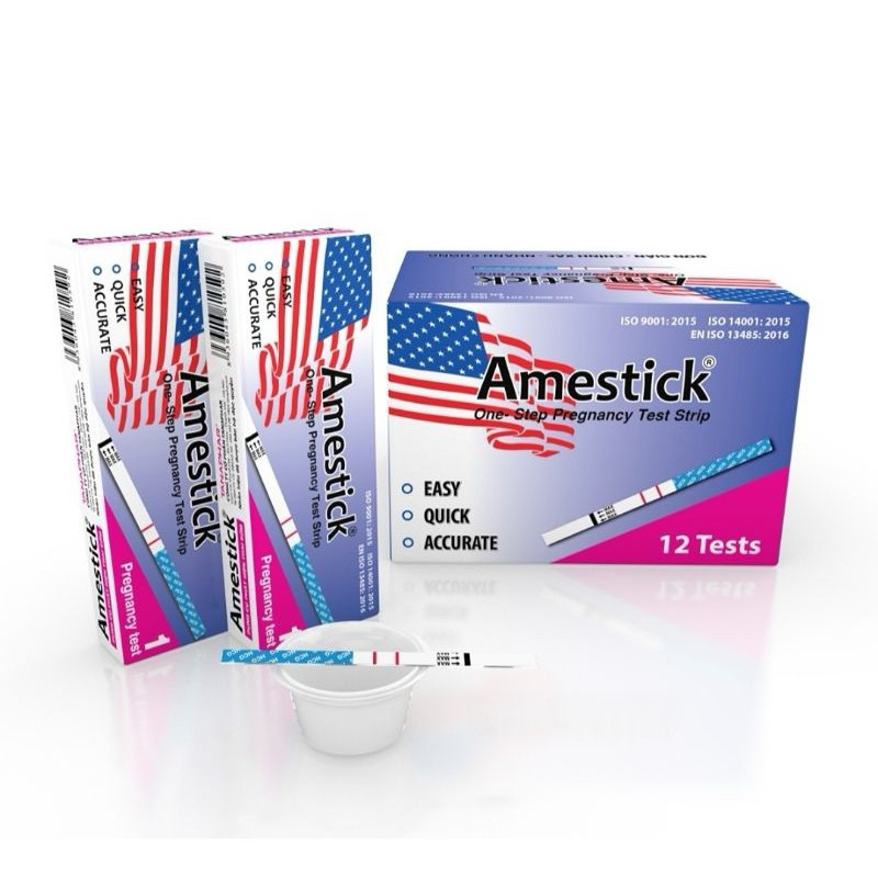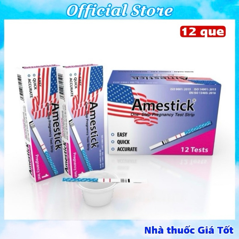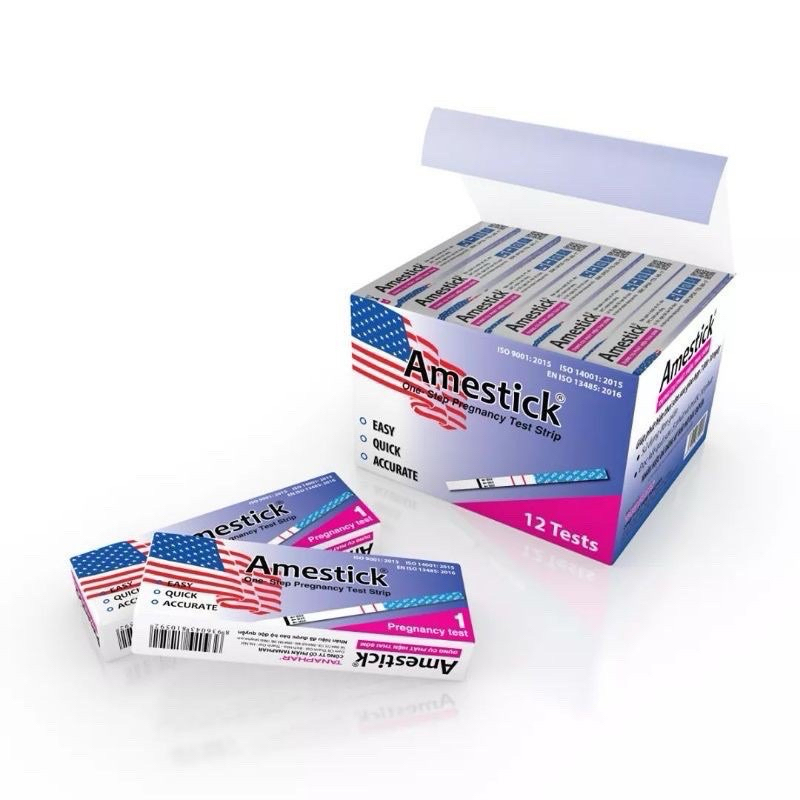 Sản phẩm bao gồm 12 que thử thai AmestickQue thử thai AmestickƯu điểm của que thử thai Amestick:Que thử thai Amestick giúp bạn phát hiện thai sớm một cách Nhanh Chóng – Đơn Giản – Chính Xác.Sau 7 đến 10 ngày sau khi quan hệ.Không nên kiểm tra trước 7 ngày.Nên kiểm tra vào sáng sớm để có kết quả chính xác nhất.Được bộ y tế cấp số ĐKLH: SPCĐ-TTB-305-17. Đạt tiêu chuẩn: ISO: 13485:2016.Hướng dẫn sử dụng dụng cụ phát hiện thai sớm AmestickTiến hành test với que thử thai Amestick Lấy nước tiểu vào buổi sáng ngay khi thức dậy (lúc đó hCG là hoóc môn giúp phát hiện thai có nồng độ cao nhất). Lấy que thử ra khỏi túi, phải dùng ngay trong vòng 10 phút (mỗi que thử chỉ sử dụng một lần).Nhúng que thử vào cốc nước tiểu theo chiều mũi tên, sao cho mặt nước tiểu không ngập quá đầu mũi tên in trên que thử. Sau 10 đến 15 giây, lấy que thử đặt nằm ngang trên mặt phẳng khô, sạch, đọc kết quả sau 5 phút và trước 10 phút.Cách đọc kết quả que thử thai:ĐÃ CÓ THAI: Trên que thử xuất hiện 2 vạch ngang màu hồng.KHÔNG CÓ THAI: Trên que thử xuất hiện 1 vạch ngang màu hồng.KHÔNG ĐẠT: Trên que thử không xuất hiện vạch ngang màu hồng nào (do thao tác thử sai, mẫu nước tiểu không đạt, hoặc bảo quản không đúng.Nên thử lại bằng que thử mới.Lưu ý: Một số ít trường hợp cho kết quả có thai giả do người thử đang dùng các loại thuốc an thần, lợi tiểu, kháng co giật, thuốc có chứa hCG hoặc người (chiếm tỷ lệ nhỏ) có nồng độ hCG cao hơn bình thường…