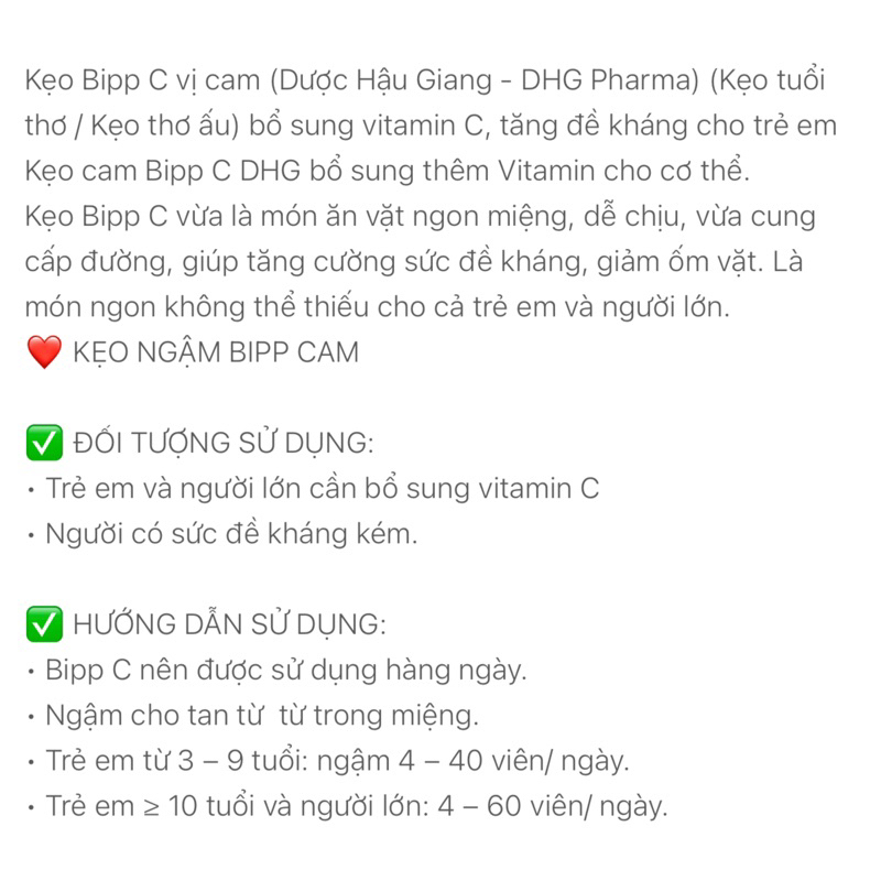 Sản phẩm ko phải là thuốc và không có tác dụng thay thế thuốc chữa bệnhThành phần:Hàm lượng trong 1 viên kẹo ngậm- Vitamin C: 10 mg- Glucose: 100mgĐường trắng, magnesi stearat, màu vàng tartrazin, màu orange lake, vanilin, bột hương cam, natri carboxymethylcelluloseCông dụng:- Bổ sung vitamin C cho cơ thể, giúp tăng cường sức đề kháng, bảo vệ thành mạch.Đối tượng sử dụng:- Trẻ em và người lớn cần bổ sung vitamin C.- Người có sức đề kháng kém.Hướng dẫn sử dụng: - Bipp C nên được sử dụng hàng ngày.- Ngậm cho tan từ từ trong miệng.- Trẻ em từ 3 – 9 tuổi: ngậm 4 – 40 viên/ ngày.- Trẻ em ≥ 10 tuổi và người lớn: 4 – 60 viên/ ngày.#vienngamvitaminc #vienngam #vitaminc #bippc #keongambippc #keongam #bippcvicam #keovitaminc #keongamvitaminc #cngam #vitamincngam #vienngambippc #keocngam #keoc #ckeo #cgoi #goicngam #ccam