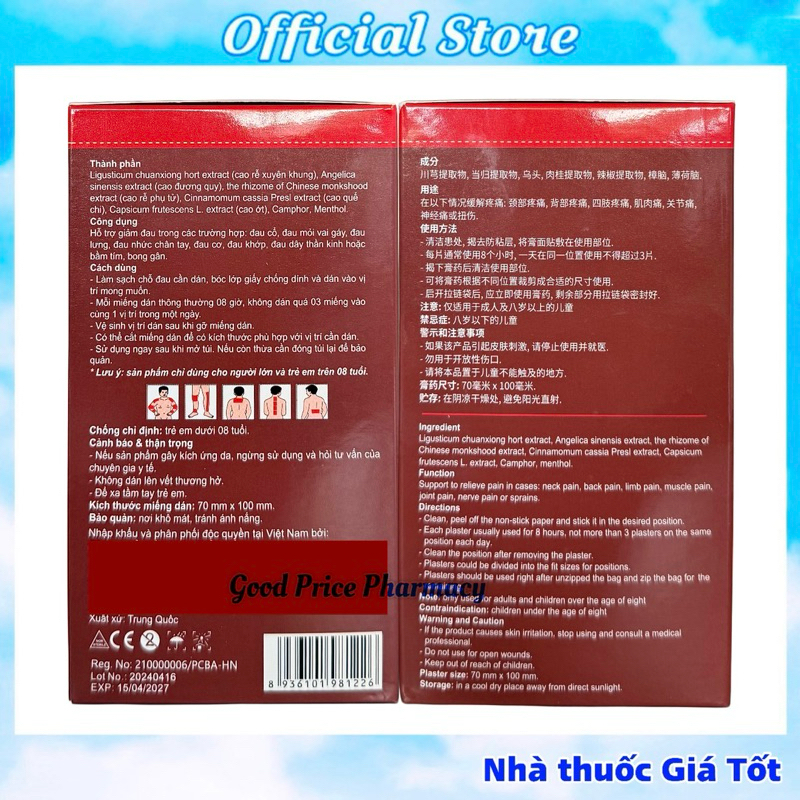 Cách dùng:- Làm sạch vùng da cần dán, lau khô.- Dán miếng cao vào chỗ đau tối đa 8 tiếng- Tránh dán vào vùng da bị trầy xước, mẩn đỏ hay vết thương hở.Quy cách: hộp 20 túi x 5 miếng / túiXuất xứ Trung QuốcNhập khẩu và phân phối: Dược Tất Thành❌ LƯU Ý: Sản phẩm này không phải là thuốc và không có tác dụng thay thế thuốc chữa bệnh