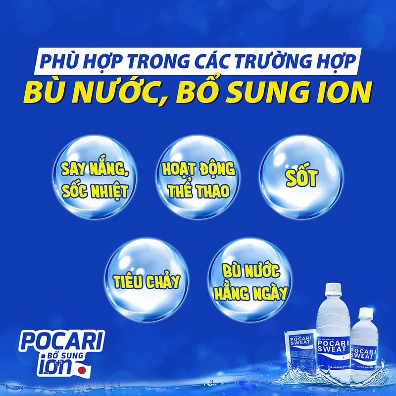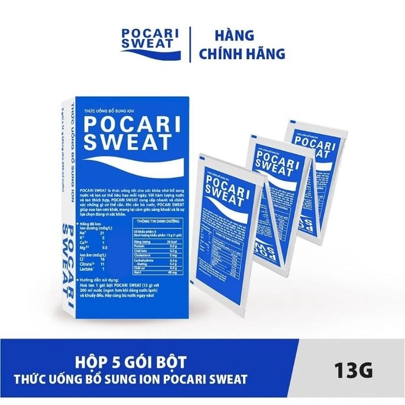 BẢN. Với thành phần gồm NƯỚC và CÁC ION THIẾT YẾU (Natri, Kali, Canxi, Magiê, Clo), tương tự dịch cơ thể, POCARI SWEAT giúp bù nước nhanh, xua tan cơn khát và mang lại cảm giác sảng khoái. Đối tượng sử dụng: Dùng cho các trường hợp cần bù nước, bổ sung ion. NHỮNG LỢI ĐIỂM CỦA POCARI SWEAT: Thành phần gồm nước và ion tương tự dịch cơ thể Bảo toàn nước lâu hơn trong cơ thể so với nước thườngBù nước nhanh hơn 2.2 lần so với nước thườngSản phẩm từ tập đoàn dược phẩm hàng đầu Nhật BảnĐáp ứng tiêu chí 5 KHÔNG: , KHÔNG CHẤT TẠO MÀU, KHÔNG ĐƯỜNG HÓA HỌC, KHÔNG CHẤT BẢO QUẢN, KHÔNG GAZ, KHÔNG CAFFEINE - an toàn tuyệt đối cho sức khỏe POCARI SWEAT BỔ SUNG ION - BÙ NƯỚC MỌI LÚC MỌI NƠI Trung bình, bạn MẤT KHOẢNG 2500ML dịch cơ thể mỗi ngày thông qua các hoạt động: bài tiết, đổ mồ hôi, hô hấp, hay ngay cả khi ngủ và tắm. Khi đổ mồ hôi, cơ thể bạn mất đi cả nước và các ion thiết yếu. NƯỚC LỌC THÔI LÀ CHƯA ĐỦ! CÁC TRƯỜNG HỢP ĐIỂN HÌNH KHI CƠ THỂ CẦN BÙ NƯỚC – BỔ SUNG ION Say nắng, sốc nhiệt: Nắng nóng, làm việc dưới môi trường nhiệt độ cao khiến cơ thể bị say nắng, sốc nhiệt, có thể dẫn đến nguy hiểm đến tính mạng nếu không bù nước (dịch cơ thể) kịp thời. Hoạt động thể thao: Khi luyện tập thể thao không nên để hụt quá 2% trọng lượng cơ thể do đổ mồ hôi. Cứ 20 phút luyện tập, hãy nạp 100 - 200ml POCARI SWEAT. Sốt: Khi sốt, thân nhiệt tăng cao khiến cơ thể đổ mồ hôi, gây mất nước (dịch cơ thể) trầm trọng. Tiêu chảy: Đi ngoài phân lỏng và nóng sốt khiến nước (dịch cơ thể) mất đi nhanh chóng và nguy hiểm tính mạng nếu không bù nước kịp thời. Bù nước hằng ngày: Mỗi ngày, cơ thể mất khoảng 2500ml nước (dịch cơ thể) thông qua các hoạt động: bài tiết, đổ mồ hôi, hô hấp, hay ngay cả khi ngủ và tắm.Hộp 5 gói bột (13gr/gói).zalo
