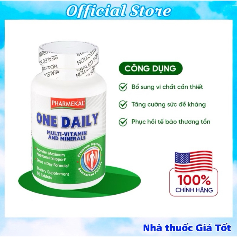"Viên Uống Bổ Sung Vitamin Và Khoáng Chất Pharmekal One Daily Multivitamin And Mineral 60 ViênViên Uống Bổ Sung Vitamin Và Khoáng Chất Pharmekal One Daily Multivitamin And Mineral bổ sung vitamin và khoáng chất cho cơ thể, chứa hỗn hợp vitamin và các khoáng chất thiết yếu có lợi sức khỏe, giúp chống lại sự mệt mỏi do thiếu hụt dinh dưỡng, đồng thời nâng cao sức đề kháng cho cơ thể. Sản phẩm sản xuất theo công nghệ tiên tiến, an toàn cho sức khỏe của bạn. Sử dụng Viên Uống Bổ Sung Vitamin và Khoáng Chất Pharmekal mỗi ngày sẽ giúp bạn sở hữu một cơ thể khỏe mạnh. Sản phẩm này không phải là thuốc và không có tác dụng thay thế thuốc chữa bệnh.Thành phần và công dụng:- Viên Uống Bổ Sung Vitamin Và Khoáng Chất Pharmekal One Daily Multivitamin And Mineral chứa 33 loại vitamin và khoáng chất giúp nâng đề kháng cho cơ thể.- Các loại vitamin và khoáng chất thiết yếu: Vitamin A, Vitamin C, Vitamin D, vitamin K, Axit Folic... bổ sung các vitamin và khoáng chất thiết yếu cho cơ thể, giúp cơ thể chống lại sự mệt mỏi, hiện tượng mất cân bằng và thiếu hụt dinh dưỡng.- Thành Phần Khác: Cellulose, Croscarmellose, Cellulose Coating, Gelatin, Silica, Magnesium Stearate, and Titanium Dioxide.... nâng cao sức đề kháng cho cơ thể, đảm bảo các quá trình chuyển hoá quan trọng diễn ra bình thường.Đối tượng sử dụng:Viên Uống Bổ Sung Vitamin Và Khoáng Chất Pharmekal One Daily Multivitamin And Mineral dùng cho người từ tuổi trưởng thành bị suy nhược cơ thể, sức đề kháng kém, đang phục hồi sau khi phẫu thuật. Hướng dẫn sử dụng:Ngày uống 1 lần, mỗi lần 1 viên hoặc theo hướng dẫn trong hộp." Xuất xứ: Mỹ HSD: 3 năm kể từ ngày sản xuất Thương hiệu: Pharmekal