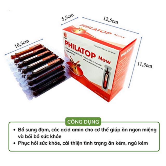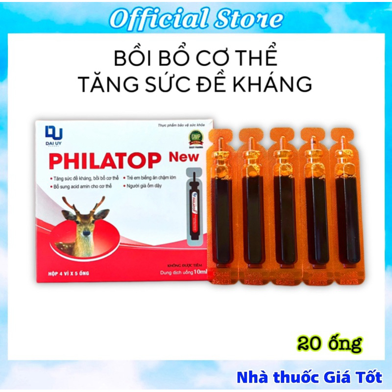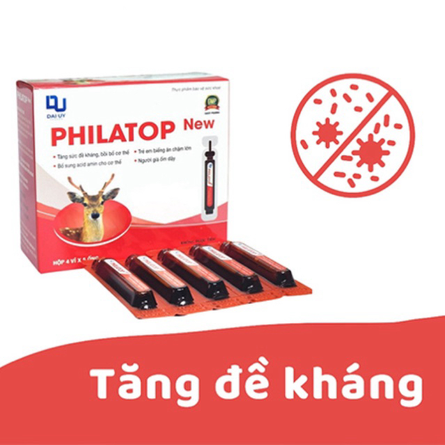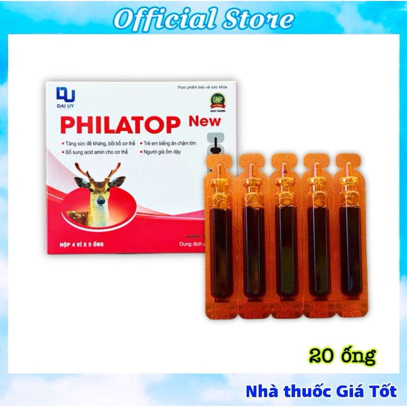 Philatop ống nhựa là sản phẩm của Công ty Cổ phần Dược phẩm Đại Uy .🚫Hãy chú ý mua sản phẩm chính hãng, tránh mua phải hàng giả hàng nhái trôi nổi trên thị trường!THÔNG TIN CHUNGĐược Bộ Y Tế cấp phép sản xuấtSản xuất theo dây chuyền đạt chuẩn GMP Bộ Y Tế và GMP Quốc tếSản xuất và phân phối: CÔNG TY CỔ PHẦN DƯỢC PHẨM ĐẠI UYTHÔNG TIN SẢN PHẨMThành phần:+ Đạm thuỷ phân từ gan lợn+ Lysine HCL 10mg+ Thymomod lin 2mg+ Folic 200 mcg+ Đường trắng+ Nipazil+ Nipazol+ Nước tinh lọc vừa đủ 10mlCÔNG DỤNG+ Sử dụng bổ trợ cho người cần nâng cao sức khỏe, đặc biệt là người mới ốm dậy.+ Phục hồi sức khỏe cho người phải làm việc quá sức.+ Sử dụng cho trẻ em còi xương, suy dinh dưỡng, chậm lớn.+ Phối hợp để nâng cao sức khỏe, tăng cường sức đề kháng cho người đang điều trị bệnh lao.+ Người đang điều trị viêm loét dạ dày tá tràng.+ Người có bệnh lí đường tiêu hóa dẫn tới việc kém hấp thu các dưỡng chất.+ Sử dụng cho phụ nữ có thai, bà mẹ đang cho con bú đặc biệt là những bà mẹ ít sữa.+ Sử dụng cho trẻ biếng ăn, người ăn kém ngủ kém.+ Bố sung đạm, các acid amin cho cơ thể giúp ăn ngon miệng và bồi bổ sức khoẻHƯỚNG DẪN SỬ DỤNG+ Người lớn: thường uống 2 đến 3 ống mỗi ngày.+ Trẻ em: uống 1 đến 2 ống mỗi ngàyPhụ nữ có thai và đang cho con bú: uống 1 ống mỗi ngày liên tục trong 20 đến 30 ngày, sau đó nghỉ ít nhất 1 tháng rồi uống lại.❌ LƯU Ý: Sản phẩm này không phải là thuốc và không có tác dụng thay thế thuốc chữa bệnh#anrattot #anngon #coixuong #philatop #treanngon #tanghapthu #tangcuonghapthu #acidamin #vitamin #tangcuonghapthu #suydinhduong #daiuy#philatop #philatopnew #philatopconhuou #philatopchobe #philatopongnhua #philatopconhươu #Philatopchobé