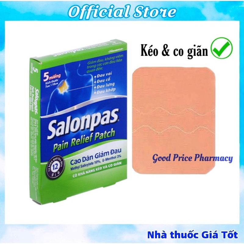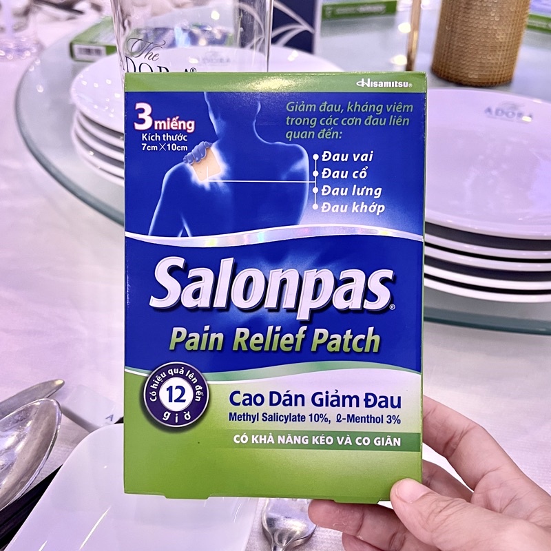 ✅ Cao dán Salonpas màu da - Salonpas Pain Relief Patch có khả năng kéo và co giãn, có hiệu quả lên đến 12 giờ.- Kích thước: 7cm x 10cm- Đóng gói: Hộp 3 miếng; Hộp 5 miếng.- Sản xuất tại: Hisamitsu Việt Nam, dưới sự nhượng quyền của Hisamitsu Nhật Bản.- Xuất xứ: Việt Nam✅ THÀNH PHẦN Salonpas Pain Relief Patch- Methyl salicylate ……. 10%- l-Menthol ……. 3%.✅ CÔNG DỤNG Salonpas Pain Relief PatchDùng hỗ trợ giảm đau trong các cơn đau liên quan đến: ■ Đau cổ Đau vai ■ Đau khớp ■ Đau lưng ■ Căng cơ ■ Bầm tím ■ Bong gân✅ Lưu ý: KHÔNG sử dụng:■ Trên vùng da bị tổn thương hay vết thương hở. ■ Trên mắt hoặc vùng da quanh mắt. ■ Chung với băng dán nóng. ■ Cùng thời điểm với các sản phẩm giảm đau dùng ngoài khác. ✅ CÁCH DÙNG Salonpas Pain Relief PatchNgười lớn và trẻ em từ 12 tuổi trở lên:■ Rửa sạch và lau khô vùng da bị đau. ■ Gỡ cao dán ra khỏi tấm phim và dán vào chỗ bị đau. ■ Không sử dụng quá 4 miếng trong một ngày. ■ Chỉ dán một miếng một lần cho mỗi vùng da bị đau. ■ Không sử dụng quá 2 miếng một ngày cho mỗi vùng da bị đau. ■ Gỡ bỏ miếng dán sau 12 giờ. ■ Không sử dụng miếng dán quá 5 ngày liên tục trên một vùng da bị đau.#salonpas #dán_giảm_đau