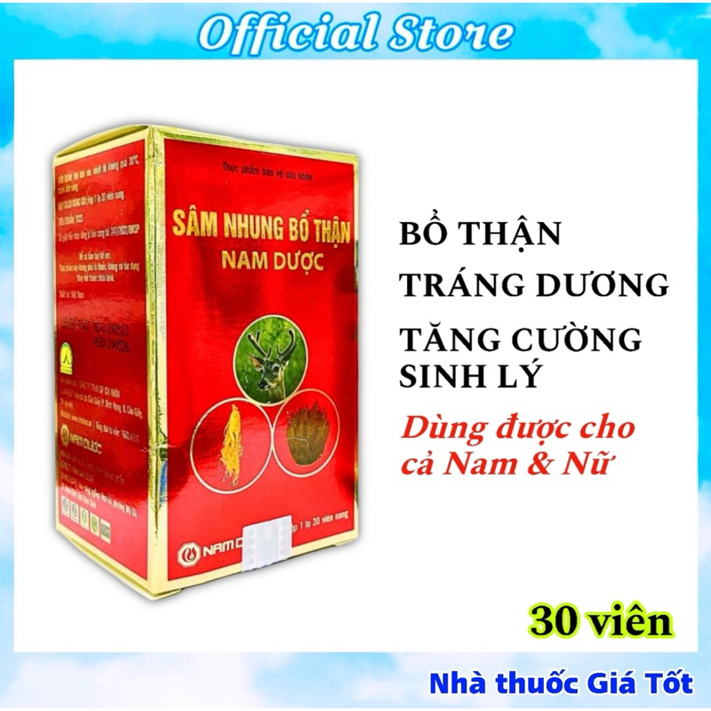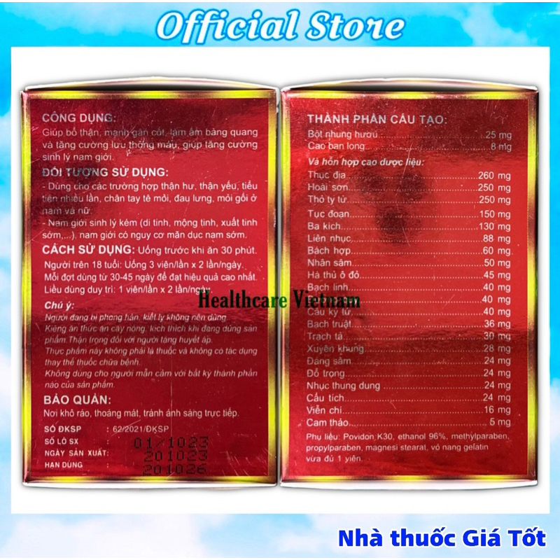 Thành phầnNhunghươu 5mgNhân sâm 10mgĐông trùng hạ thảo 4mgTỏa dương (Nấm Ngọc Cẩu) 100mgHà thủ ô đỏ 150mgThỏ ty tử 100mgCâu kỷ tử 100mgĐỗ trọng 100mgPhụ liệu: Tinh bột, aerosil, PEG 6000, Tween 80, talc, magnesi stearat, kali sorbat vừa đủ 1 viênCông dụng– Giúp bổ thận, cố tinh, tráng dương, tăng cường sinh lực.– Dùng trong các trường hợp thận hư, thận yếu gây mệt mỏi, đau lưng mỏi gối, ù tai chóng mặt, sinh lý kém, ngủ hay mơ, đi tiểu đêm nhiều, rụng tóc nhiều, tóc bạc sớm. Phụ nữ kinh nguyệt không đều, khí hư bạch đới.Liều dùngCách dùngNgày uống 2 lần, mỗi lần 2 viên sau ăn, mỗi đợt dùng 3 tháng.Sức khỏe yếu, suy nhược cơ thể nên dùng thường xuyênĐối tượng sử dụngDùng cho cả nam và nữ bị chứng thận hư, thận yếu có một trong các biểu hiện sau:Suy nhược cơ thể, thường xuyên mệt mỏi.Đau lưng, mỏi gối, ù taiTiểu đêm nhiều, tóc rụng, bạc sớm.Phụ nữ kinh nguyệt không đều, khí hư, bạch đớisản phẩm này không phải là thuốc không có tác dụng thay thế thuốc chữa bệnh.