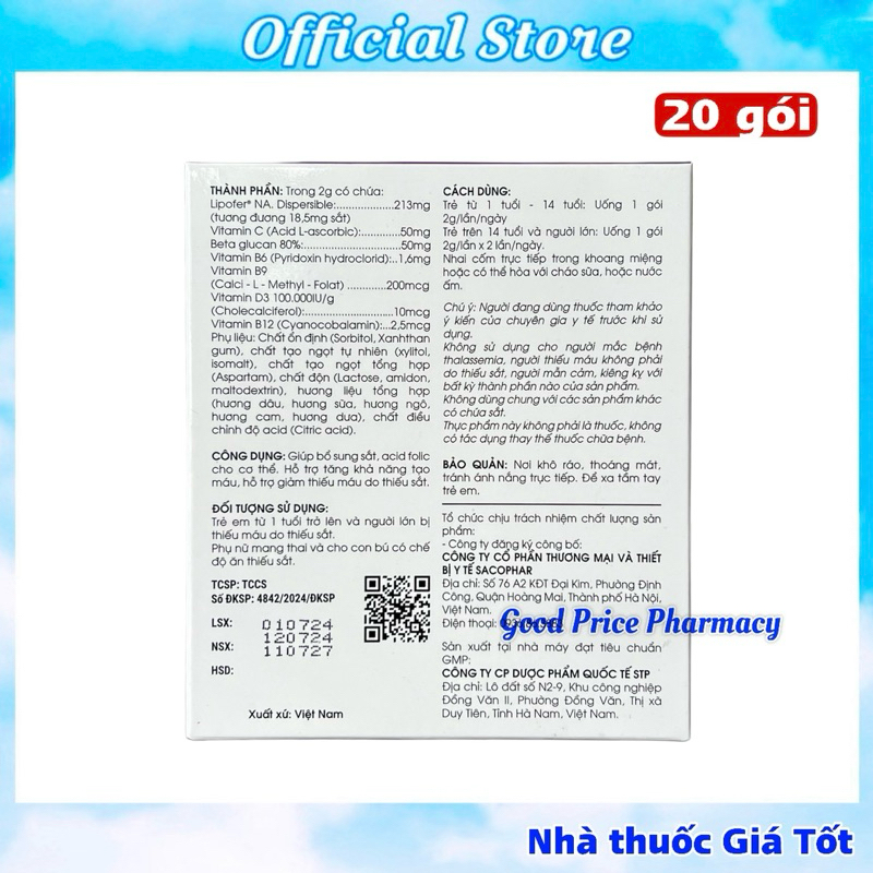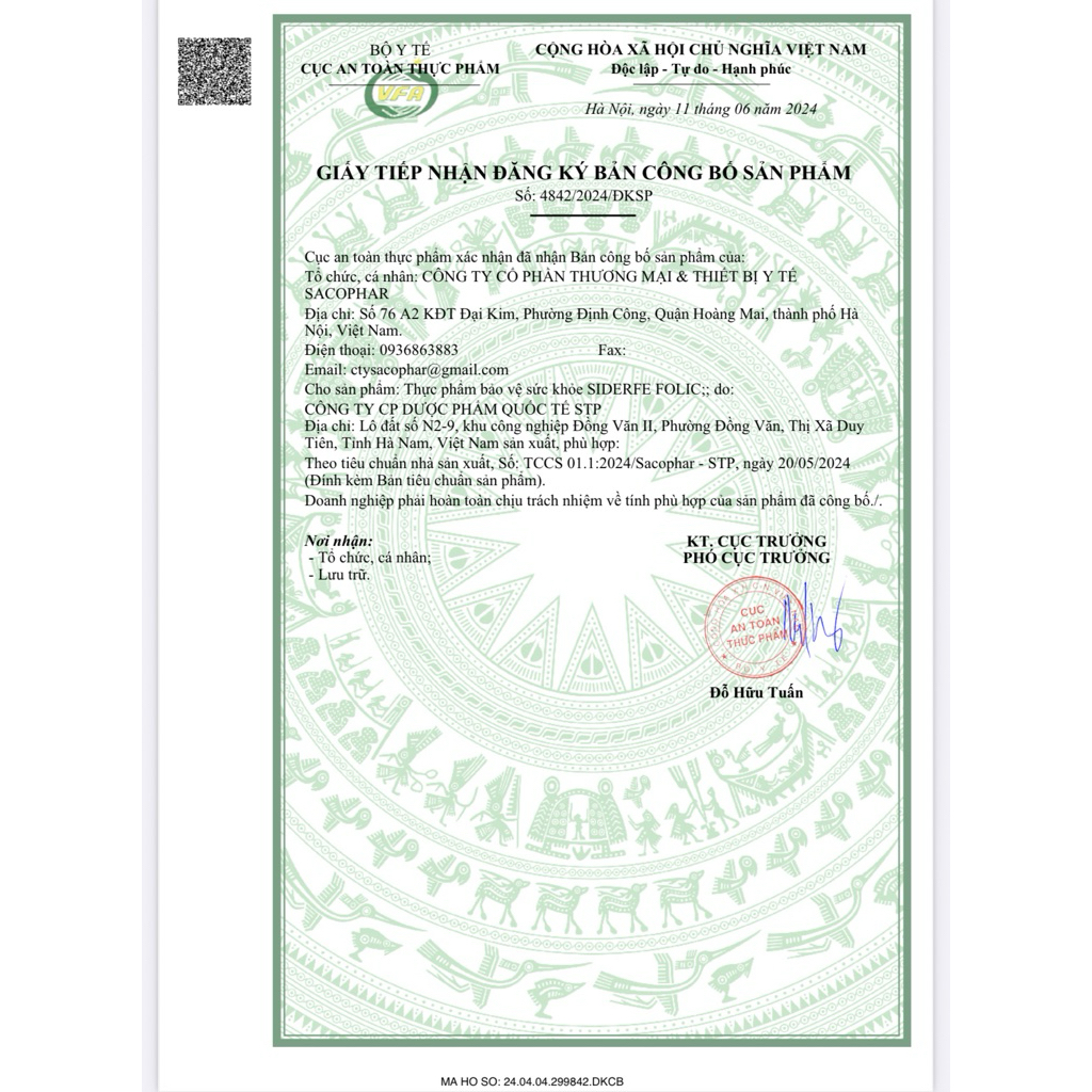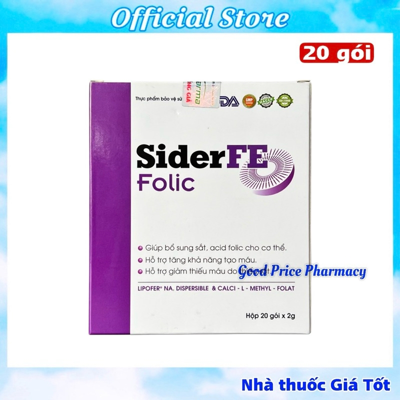 Sider FE folic✅ THÀNH PHẦN: Trong 2g có chứa:Lipofer® NA. Dispersible: 213mg (tương đương 18,5mg sắt)Vitamin C (Acid L-ascorbic): 50mgBeta glucan 80%: 50mgVitamin B6 (Pyridoxin hydroclorid):.1,6mgVitamin B9(Calci - L - Methyl - Folat) :200mcgVitamin D3 100.000U/g (Cholecalciferol): 10mcgVitamin B12 (Cyanocobalamin): 2,5mcgPhụ liệu: Chất ổn định (Sorbitol, Xanhthan gum), chất tạo ngọt tự nhiên (xylitol, isomalt), chất tạo ngọt tổng hợp (Aspartam), chất độn (Lactose, amidon, maltodextrin), hương liệu tổng hợp (hương dâu, hương sữa, hương ngô, hương cam, hương dưa), chất điều chỉnh độ acid (Citric acid).✅ CÔNG DỤNG: Giúp bổ sung sắt, acid folic cho cơ thể. Hỗ trợ tăng khả năng tạo máu, hô trợ giảm thiếu máu do thiếu sắt.✅ ĐỐI TƯỢNG SỬ DỤNG:Trẻ em từ 1 tuổi trở lên và người lớn bị thiếu máu do thiếu sắt.Phụ nữ mang thai và cho con bú có chế độ ăn thiếu sắt.✅ CÁCH DÙNG:Trẻ từ 1 tuổi - 14 tuổi: Uống 1 gói 2g/lần/ngàyTrẻ trên 14 tuổi và người lớn: Uống 1 gói 2g/lần x 2 lần/ngày.Nhai cốm trực tiếp trong khoang miệng hoặc có thế hòa với cháo sữa, hoặc nước ấm.❌ LƯU ÝKhông sử dụng cho người mắc bệnh thalassemia, người thiếu máu không phải do thiếu sắt, người mẫn cảm, kiêng kỵ với bất kỳ thành phần nào của sản phẩm.Không dùng chung với các sản phẩm khác có chứa sắt.Thực phẩm này không phải là thuốc, không có tác dụng thay thế thuốc chữa bệnh.✅ BẢO QUẢN: Nơi khô ráo, thoáng mát, tránh ánh nắng trực tiếp. Để xa tầm tay trẻ em.Tổ chức chịu trách nhiệm chất lượng sản phẩm:✅ Công ty đăng ký công bố:CÔNG TY CỐ PHẦN THƯƠNG MẠI VÀ THIẾT BỊ Y TẾ SACOPHARTCSP: TCCSSố ĐKSP: 4842/2024/ĐKSP