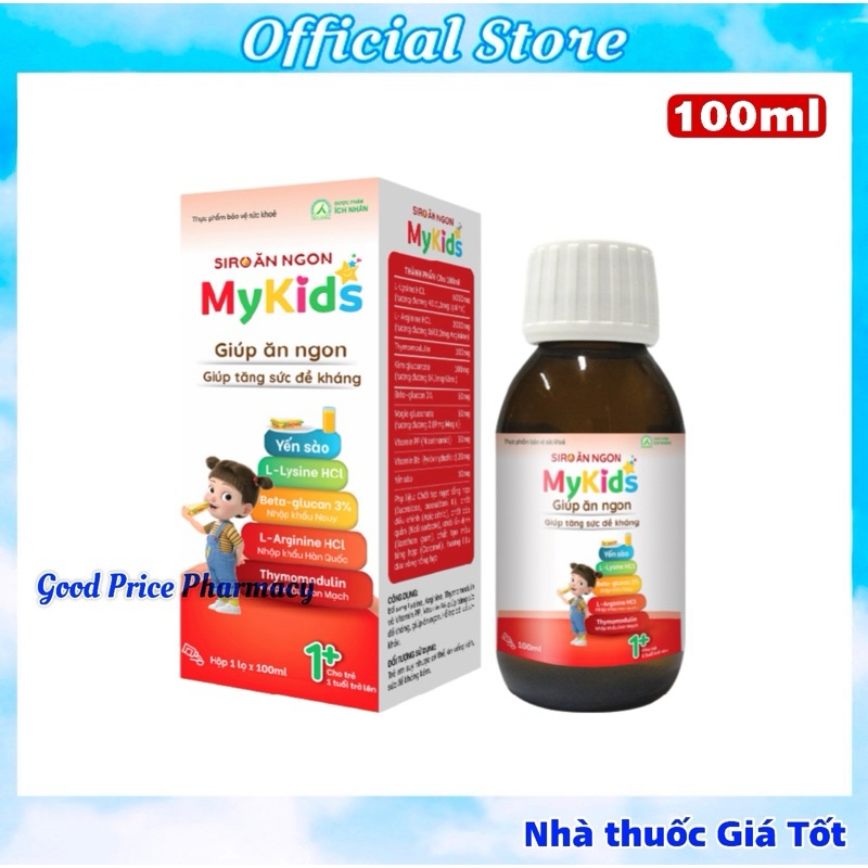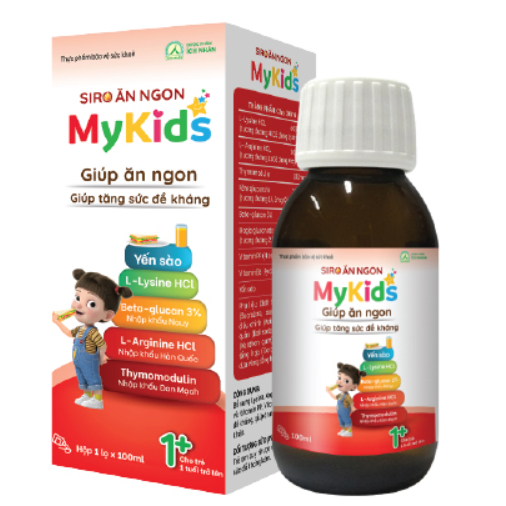 HỘP 1 LỌ 100MLTHÀNH PHẦNCho 10ml: L-Lysine HCL……………………… 600mg (tương đương 481,52mg Lysine) L- Arginine HCL…………………… 200mg (tương đương 165,32mg Arginine)Thymomodulin……………………… 10mg Beta-glucan 3%……………………………… 5mg Kẽm gluconate………………………. 10mg (tương đương 1,43mg Kẽm ) Magie gluconate………………………5mg (tương đương 0,289mg Magie) Vitamin PP (Nicotinamid)………………… 5mg Vitamin B6 (Pyridoxin hydrochlorid)… 2mg Yến sào……………………………… 1mg Phụ liệu: chất tạo ngọt tổng hợp (sucralose, acesulfam K), chất điều chỉnh (acid citric), chất bảo quản (kali sorbate), chất ổn định (xanthan gum), chất tạo màu tổng hợp (Caramel), hương liệu dưa vàng tổng hợp.CÔNG DỤNGBổ sung Lysine, Arginine, Thymomodulin và vitamin PP, vitamin B6 giúp tăng sức đề kháng, giúp ăn ngon, hỗ trợ bồi bổ sức khỏe.ĐỐI TƯỢNG SỬ DỤNGTrẻ em suy nhược cơ thể, ăn uống kém, sức đề kháng kém.HƯỚNG DẪN SỬ DỤNGLắc đều trước khi dùngTrẻ từ 1-3 tuổi: ngày uống 2 lần, mỗi lần 5mlTrẻ từ 3-12 tuổi: ngày uống lần, mỗi lần 10mlTrẻ trên 12 tuổi: ngày uống 3 lần, mỗi lần 10ml❌ LƯU Ý: Sản phẩm này không phải là thuốc và không có tác dụng thay thế thuốc chữa bệnh