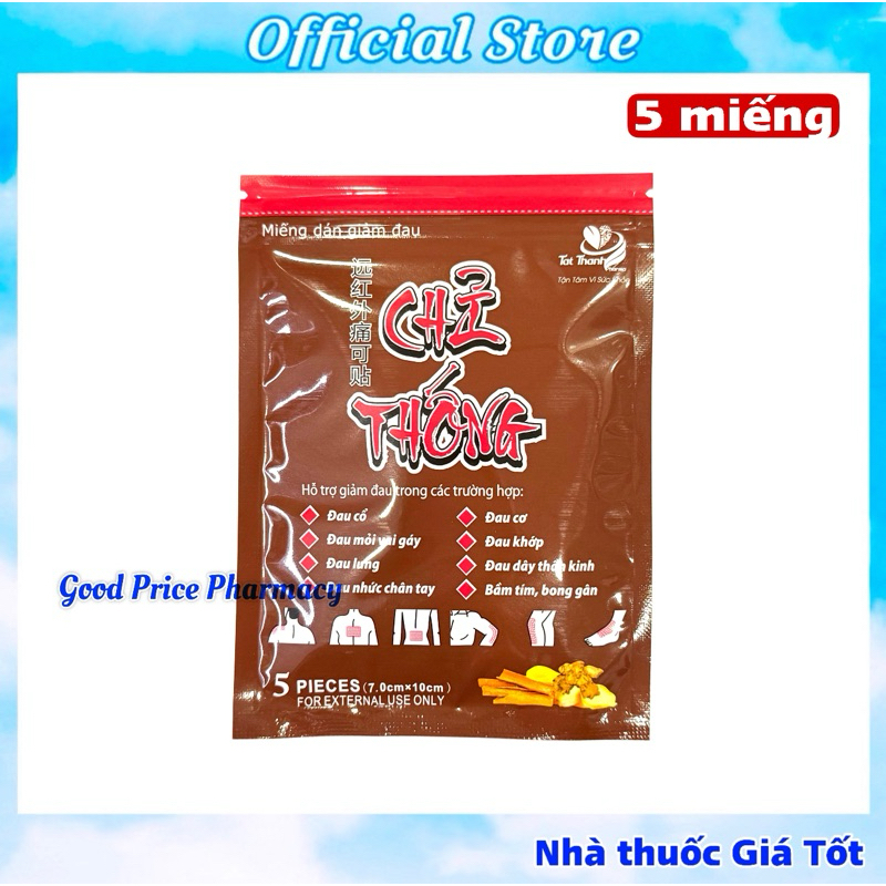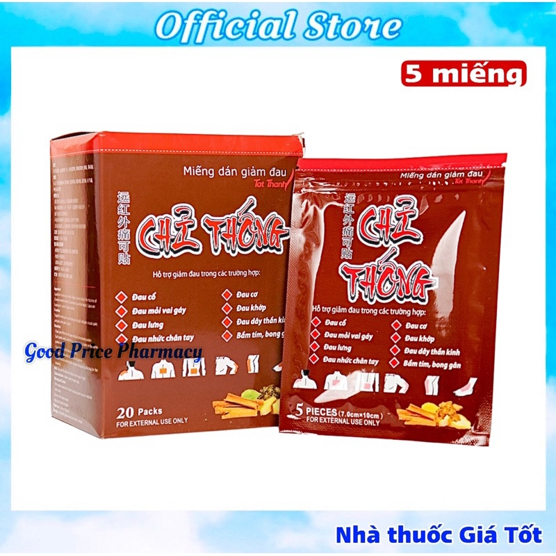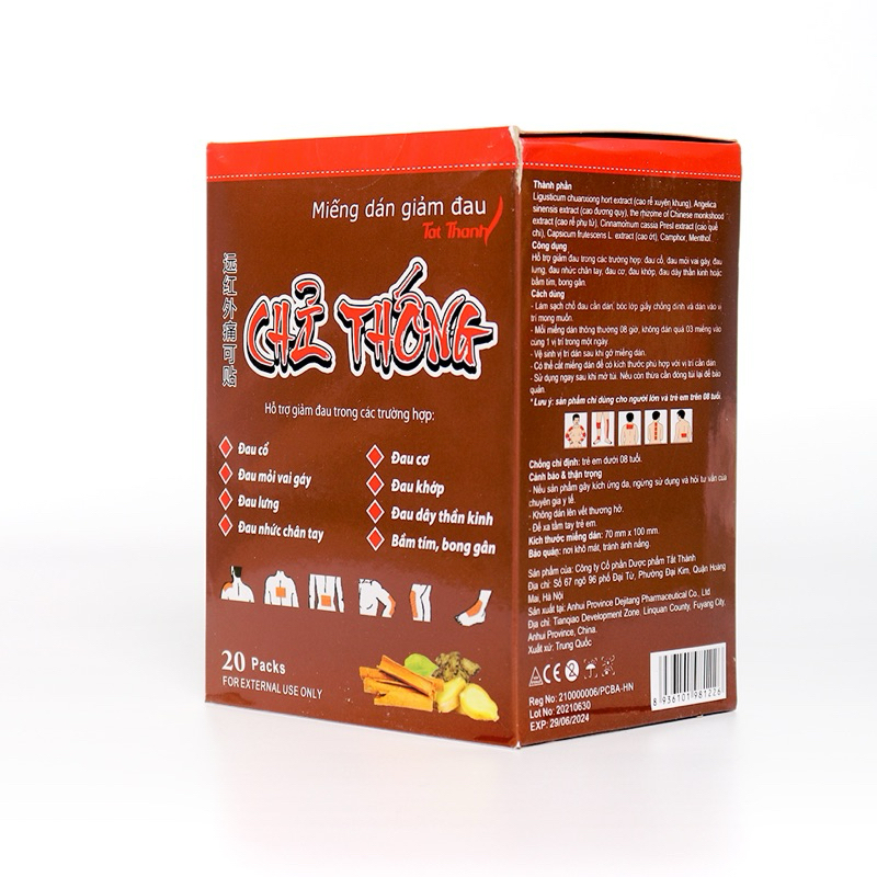 Miếng dán giảm đau Chỉ Thống sử dụng trong các trường hợp: đau cổ, đau mỏi vai, đau lưng, đau nhức chân tay, đau cơ, đau khớp, đau dây thần kinh hoặc bầm tím, bong gân.✅ Thành phầnLigusticum chuanxiong hort extract (cao rễ xuyên khung), Angelica sinensis extract (cao đương quy), the rhizome of Chinese monkshood extract (cao rễ phụ tử), Cinnamomum cassia Presl extract (Cao quế chi), Capsicum frutescens L extract (cao ớt), Camphor, Menthol✅ Công dụngHỗ trợ giảm đau trong các trường hợp: đau cổ, đau mỏi vai gáy, đau lưng, đau nhức chân tay, đau cơ, đau khớp, đau dây thần kinh hoặc bầm tím, bong gân.✅ Cách sử dụngLàm sạch chỗ đau cần dán, bóc lớp giấy chống dính và dán vào vị trí mong muốn.Mỗi lần dán thông thường 08 giờ, không dán quá 03 miếng dán cùng 1 vị trí trong một ngày.Vệ sinh vị trí dán sau khi gỡ miếng dán.Có thể cắt miếng dán để có kích thước phù hợp với vị trí cần dán.Sử dụng ngay khi mở túi. Nếu còn thừa cần đóng túi lại để bảo quản❌ Lưu ý: Miếng dán giảm đau Chỉ thống chỉ dùng cho người lớn và trẻ em trên 08 tuổi.Chống chỉ định : Trẻ em dưới 08 tuổi.❌ Cảnh báo:Nếu sản phẩm gây ra ứng dụng da, hãy ngừng sử dụng và hỏi các vấn đề của chuyên gia y tế.– Không dán lên vết thương hở– Để xa tầm tay trẻ em✅ Quy cách: 5 miếng dán / túiKích thước miếng dán: 70mm x 100mmBảo quản: khô mát, tránh ánh nắng.Sản phẩm của Anhui Province Dejitang Pharmaceutical CO.,LTDTrung QuốcNhà phân phối: CÔNG TY CỔ PHẦN DƯỢC PHẨM TẤT THÀNH