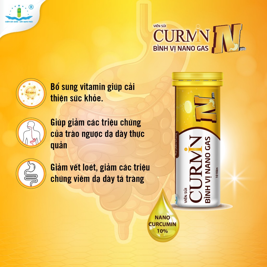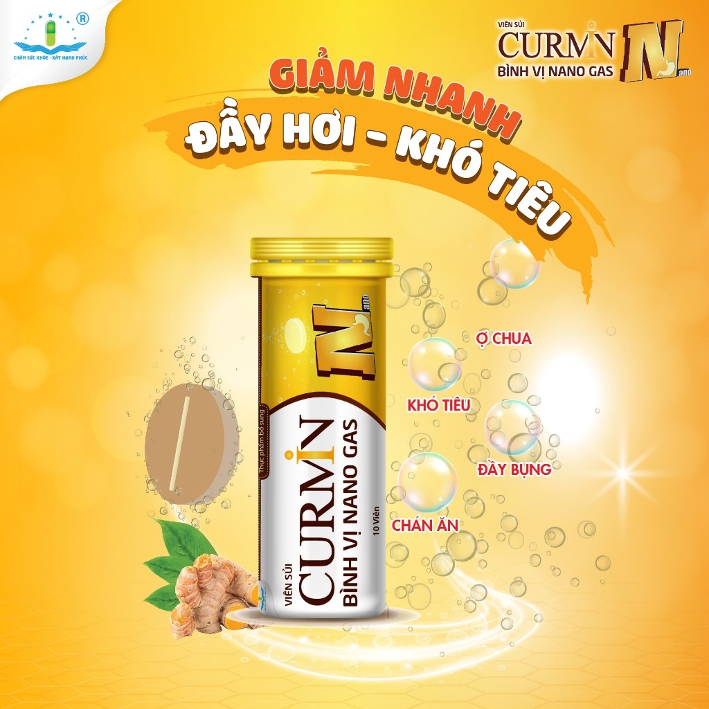 Viên sủi CURMIN BÌNH VỊ NANO GAS - Hỗ trợ điều hòa tiêu hóa Tuýp 10 viênViên sủi CURMIN BÌNH VỊ NANO GAS giúp làm dịu và cải thiện quá trình tiêu hóa đồng thời chống đầy hơi. Chỉ sau 5 phút sử dụng, hỗ trợ giải quyết nhanh các trường hợp ợ hơi, đầy hơi, khó tiêu,... đồng thời giảm nhanh cảm giá khó chịu do đau bụng, đầy bụng và căng tức bụng.1. THÀNH PHẦN: Cho một viên 4 gam- Nano curcumin 10%.........................225mg- Simethicone .....................................25mg- Papain ..............................................60mg- Amylase ............................................20mgThành phần bổ sung:- Vitamin PP (Niacin) ..........................2mg- Vitamin B5 (Pantothenic acid) ..........2mg- Vitamin B6 (Pyridoxin hydroclorid) ...2mgPhụ liệu: Acid citric, đường tinh luyện, natri bicarbonate, polyvinylpyrrolidone K30, sodium benzoate, aspartame, saccharin, hương liệu, parafin, cồn 96%.... 4100mg2. CÔNG DỤNG:- Bổ sung vitamin giúp cải thiện sức khỏe.- Hỗ trợ giảm các triệu chứng của trào ngược dạ dày thực quản, giúp giảm vết loét, giảm các triệu chứng viêm dạ dày tá tràng.3. ĐỐI TƯỢNG SỬ DỤNG:- Người viêm loét dạ dày, hành tá tràng, trào ngược dạ dày thực quản.HƯỚNG DẪN SỬ DỤNG:- Hòa tan một viên sủi trong 200 – 250 ml nước ấm, chờ sủi tan hết rồi uống. Nên sử dụng sau bữa ăn.4. KHUYẾN CÁO-Trẻ em từ 2-12 tuổi: ngày uống không quá 1 viên-Trẻ em trên 12 tuổi và người lớn: ngày uống không quá 2 viên, chia làm 1-2 lần-Trẻ em dưới 2 tuổi và các trường hợp khác phụ thuộc vào ý kiến của bác sĩ, dược sĩHƯỚNG DẪN BẢO QUẢN-Nơi khô ráo, thoáng mát, tránh ánh nắng trực tiếp. Sản phẩm được tiếp thị và phân phối bởi CÔNG TY CỔ PHẦN DƯỢC TÂM DƯỢC◾QUY CÁCH ĐÓNG GÓI: Tuýp 10 viên◾HẠN SỬ DỤNG: Hạn sử dụng in trên bao bì*Lưu ý: - Thực phẩm này không phải là thuốc và không có tác dụng thay thế thuốc chữa bệnh.- Không dùng cho người mẫn cảm với bất kỳ thành phần nào của sản phẩm#curmin #curminbinhvi #daday #daudaday #daubaotu #viemloetdaday #roiloantieuhoa #dieuhoatieuhoa #daybung #chuongbung #ohoi #khotieu #tatrang #loetbaotu #thucphamchucnang #chinhhang #tamduoc