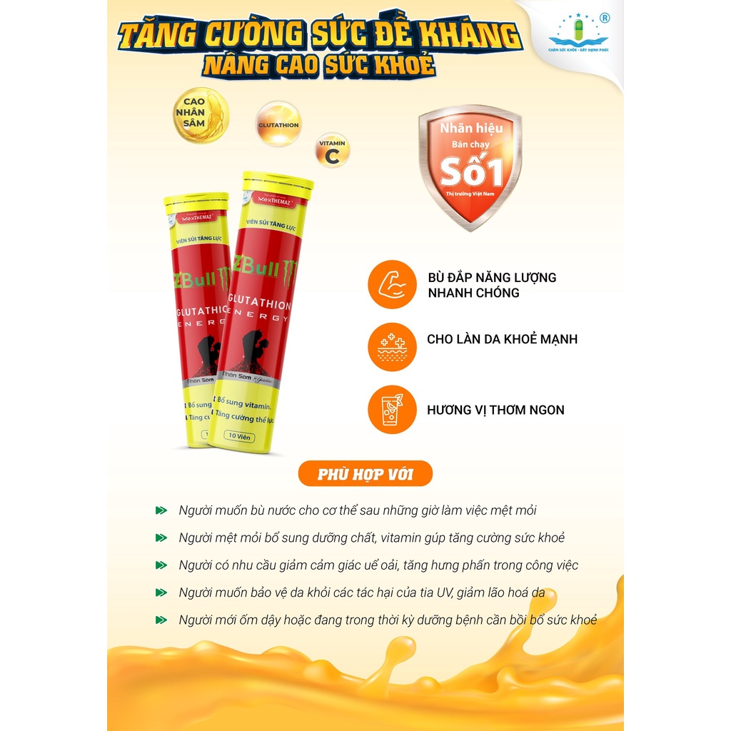QUY CÁCH: Hộp 1 tuýp 10 viên.MÔ TẢ: Một cơ thể khỏe mạnh là tiền đề giúp bạn vươn tới những thành công. Tâm Dược Store mang đến cho bạn giải pháp 3 TRONG 1:- Giúp cơ thể bổ sung năng lương, khỏe nhanh chóng - Làm đẹp da và chống lão hóa da cực hiệu quả- Tăng cường sức đề kháng cho cở thể chống lại bệnh tậtVIÊN SỦI TĂNG LỰC ZBULL M - Sản phẩm đầu tiên trên thị trường vừa giúp tăng lực, vừa làm đẹp da với sự kết hợp độc đáo CAO NHÂN SÂM & GLUTATHION và vitamin thiết yếu.ƯU ĐIỂM SẢN PHẨMViên Sủi Tăng Lực Zbull M là sản phẩm đầu tiên trên thị trường với sự kết hợp độc đáo CAO NHÂN SÂM & GLUTATHION và vitamin thiết yếu mang lại công dụng 3 trong 1: GIÚP KHỎE - ĐẸP DA - CHỐNG LÃO HÓA & TĂNG CƯỜNG SỨC ĐỀ KHÁNG.- Giải quyết được nhu cầu của nhóm khách hàng có nhu cầu thấp & vừa ( công nhân, nhân viên văn phòng, nội trợ,...) có mong muốn vừa chăm sóc sức khỏe, vừa làm đẹp da. - Chỉ 2 viên mỗi ngày, nâng cao sức khỏe, phòng ngừa dịch và cảm cúm hiệu quả.- Dạng viên sủi hòa tan nhanh, hấp thu nhanh, tác dụng nhanh.- Hương vị tăng lực cá tính, bảo toàn nguyên vẹn hàm lượng.THÀNH PHẦN:Cao Nhân sâm : 90mg Chiết xuất Hoa hòe : 20mgVitamin C : 100mg Inositol : 60mgGlutathion : 25mg Kẽm GluconatCao Linh chi : 30mg Vitamin PP, vitamin B2CÔNG DỤNG:Bổ sung cao Nhân sâm, Glutathion và một số vitamin giúp:- Tăng cường sức đề kháng- Tăng cường sức khỏe, giảm mệt mỏi- Cung cấp Glutathione hỗ trợ tăng khả năng chống oxy hoá, thải trừ độc tố và bảo vệ làm da luôn mịn màng.ĐỐI TƯỢNG SỬ DỤNG:Viên Sủi Tăng Lực Zbull M dùng mỗi ngày 2 viên trong các trường hợp:- Người mệt mỏi, cần hồi phục sức khỏe- Người trưởng thành cần chống oxy hóa để bảo vệ da khỏi các gốc tự do gây tổn hại da hoặc có dấu hiệu lão hóa da: da không đều màu, sạm da- Người thiếu hụt vitamin, sức khỏe kém- Người cần cải thiện, duy trì sức khỏe và làn da.PHÂN PHỐI: Công ty cổ phần Dược Tâm Dược.- Thực phẩm này không phải là thuốc và không có tác dụng thay thế thuốc chữa bệnh. - Khồng dùng cho người mẫn cảm với bất kỳ thành phần nào của thuốc.______________________________________________#Zbull #ZbullCola #ChánĂn #MệtMỏi #SuyNhượcCơThể #TăngCườngSứcĐềKháng #BồiBổSứcKhỏe#Zbull #Zbull_Cola #Chán_Ăn #Mệt_Mỏi #Suy_Nhược_Cơ_Thể #Tăng_Cường_Sức_Đề_Kháng #Bồi_Bổ_Sức_Khỏe