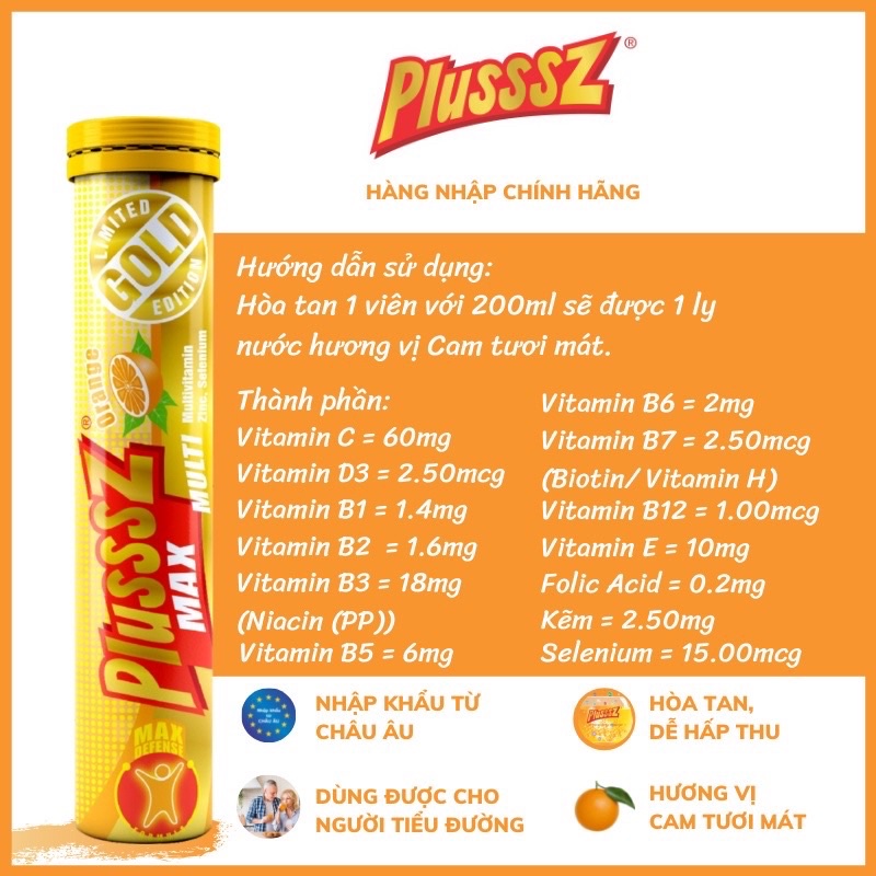 Viên Bổ sủi bọt không đường hương vị cam với công thức tiên tiến kết hợp các Vitamin và khoáng chất thiết yếu cho cơ thể giúp tăng cường sức đề kháng tự nhiên của cơ thể Viên bổ sủi bọt không đường hương vị chanh với công thức tiên tiến kết hợp tối ưu vitamin C và kẽm giúp tăng cường sức đề kháng tự nhiên của cơ thể. Viên bổ sủi bọt không đường hương vị đào Plusssz Calcium chứa 1000mg Canxi hữu cơ giúp cơ thể hấp thụ tối đa lượng canxi cần thiết mỗi ngày.👉 CÁCH DÙNG:• Liều dùng: 1-2 viên mỗi ngày.• Cách dùng: Hòa tan 1 viên với 200ml nước sẽ được 1 ly nước cam thơm mát.• Dùng được cho bệnh nhân tiểu đường.🎗 QUY CÁCH SẢN PHẨM:• Tuýp 20 viên✅ LƯU Ý: • Sản phẩm này không phải là thuốc và không có tác dụng thay thế thuốc chữa bệnh! #nakapharma #viensuiplusssz #plusssz #bosungcanxi #tangcuongsucdekhang #tangcuongmiendich #phongngualoangxuong
