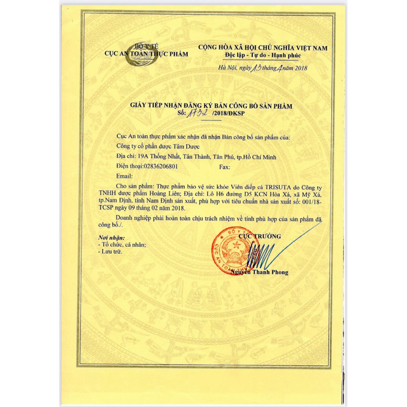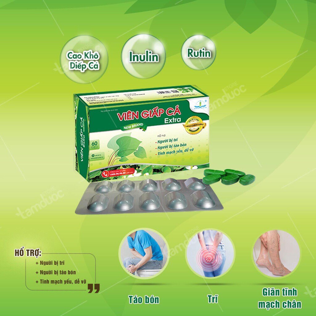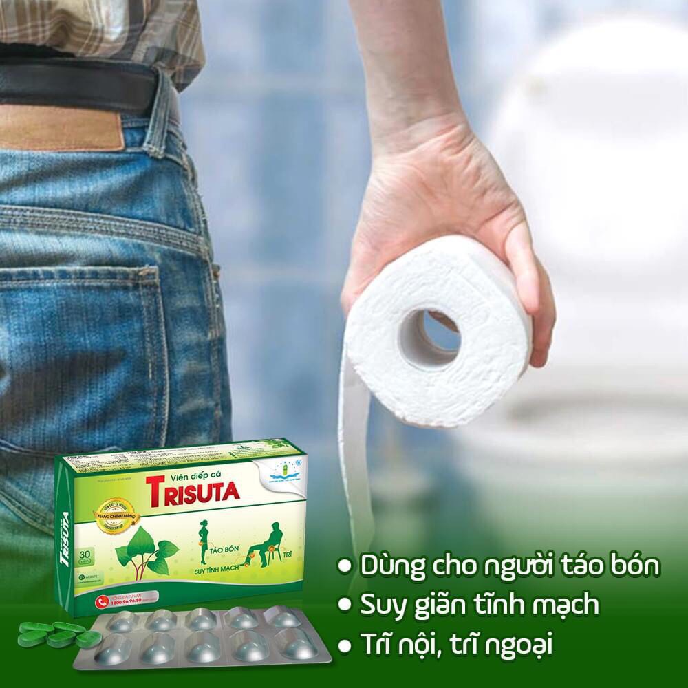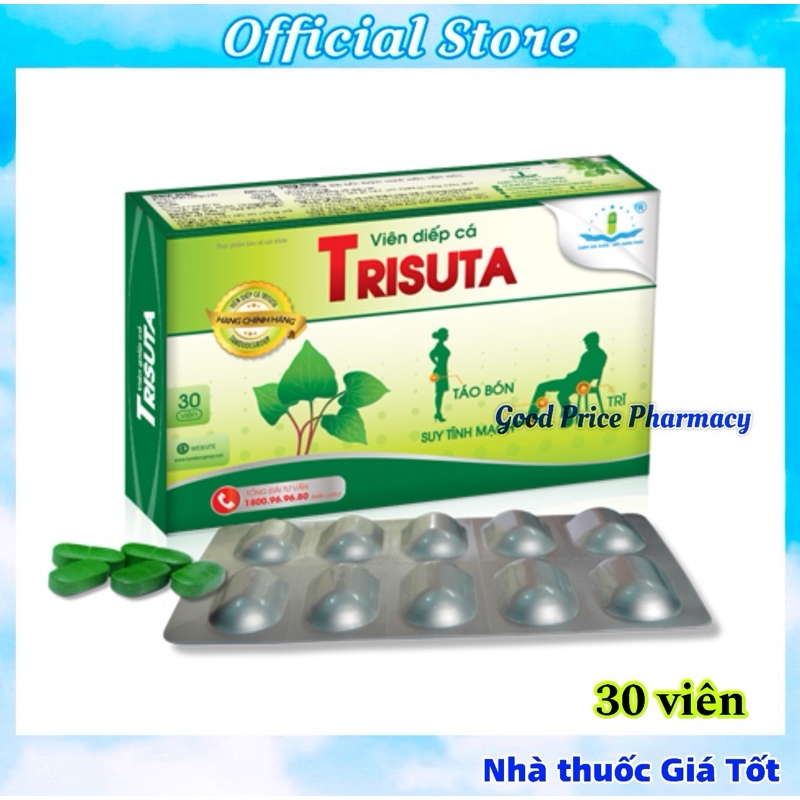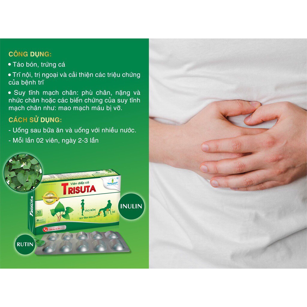 VIÊN DIẾP CÁ TRISUTAViên diếp cá Trisuta giảm tình trạng bệnh trĩ nội, trĩ ngoại, táo bón, trứng cá, suy tĩnh mạch. Giúp tăng tính bền thành mạch máu, cầm máu, nhuận tràng.1. THÀNH PHẦN:- Cao khô diếp cá: 650mg- Inulin: 100mg- Magie carbonate: 100mg- Rutin: 20mg2. CÔNG DỤNG:- Giúp tăng tính bền thành mạch máu, hỗ trợ cầm máu, nhuận tràng- Hỗ trợ giảm chịu chứng suy tĩnh mạch phù chân, nặng chân, trĩ3. ĐỐI TƯỢNG SỬ DỤNG:- Người đang bị bệnh trĩ hoặc muốn phòng ngừa bệnh trĩ- Người có nguy cơ giãn tĩnh mạch chân hoặc táo bón4. CÁCH SỬ DỤNG:- Uống sau bữa ăn và uống với nhiều nước.- Mỗi lần 02 viên, ngày 2-3 lần.DẠNG BÀO CHẾ: Dạng viênQUY CÁCH ĐÓNG GÓI: Hộp 30 viênHẠN SỬ DỤNG: 36 tháng kể từ ngày sản xuất. Hạn sử dụng in trên bao bìTIÊU CHUẨN: TCCSHotline: để được tư vấn miễn phí.Sản phẩm được tiếp thị và phân phối bởi CÔNG TY CỔ PHẦN DƯỢC TÂM DƯỢCSản phẩm này không phải là thuốc và không có tác dụng thay thế thuốc chữa bệnh.Không dùng cho người mẫn cảm với bất kỳ thành phần nào của sản phẩm.__________________________________#giapca #viendiepca #viendiepcaextra #diepca #benhtri #taobon #suytinhmach #suygiantinhmach