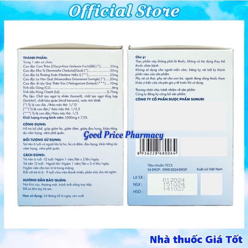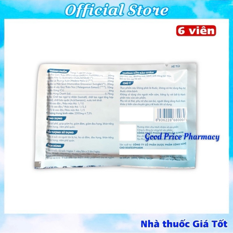 Vỉ 6 Viên Ngậm Ho Không Đường Hecati Cool Hỗ Trợ Giảm Ho, Đờm, Đau Rát Họng, Khản Tiếng✅ THÀNH PHẦN:Trong 1 viên có chứa:Cao đặc Cam Thảo : 30mgCao đặc Kha Tử : 30mgCao đặc Lá Thường Xuân : 25mgCao đặc La Hán Quả : 20mgCao đặc rễ cây Quỳ Thiên Trúc : 10mgTinh dầu Gừng : 4mgTinh dầu Húng Chanh : 0,75 mgPhụ liệu: Chất tạo ngọt tự nhiên (Isomalt), chất tạo ngọt tổng hợp (Sorbitol), chất bảo quản (Acid benzoic), nước tinh khiết.✅ CÔNG DỤNG:Hỗ trợ bổ phế, giúp giảm ho, giảm đờm, giảm đau họng, khản tiếng do viêm họng, viêm phế quản.✅ ĐỐI TƯỢNG SỬ DỤNG:Trẻ trên 6 tuổi và người lớn bị ho, ho có đờm, đau họng, khản tiếng✅ CÁCH DÙNG:Trẻ trên 6 tuổi -12 tuổi: Ngậm 1 viên/ lần x 2 lần/ ngày.Trẻ trên 12 tuổi - Người lớn: Ngậm 1 viên/ lần x 3-4 lần/ ngày.Ngậm viên cho tan từ từ trong miệng.Đối với trẻ từ 6 - 9 tuổi chia viên thành nhiều phần nhỏ cho trẻ ngậm.✅ HƯỚNG DẪN BẢO QUẢN:Nơi khô ráo, thoáng mát, tránh ánh nắng trực tiếp.Để xa tầm tay trẻ em.Hạn sử dụng: 36 tháng kể từ ngày sản xuất.❌ LƯU Ý: Sản phẩm này không phải là thuốc và không có tác dụng thay thế thuốc chữa bệnh