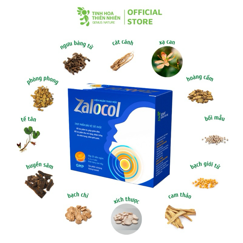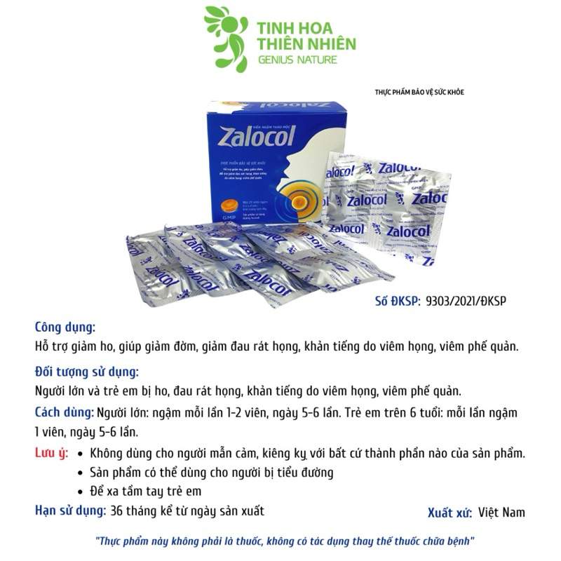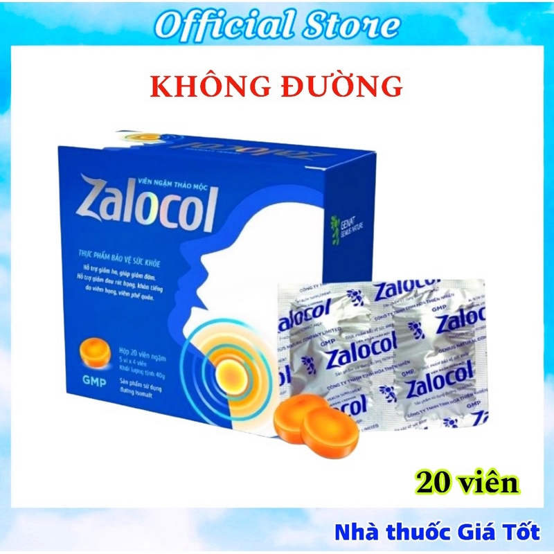 Sản phẩm này không phải là thuốc, không có tác dụng thay thế thuốc chữa bệnh--------Viên ngậm thảo mộc Zalocol ( 20 viên) Hỗ trợ giảm ho, đau họng, khản tiếng do viêm họngĐối tượng sử dụng: - Người lớn: mỗi lần ngậm 1-2 viên, ngày dùng 5-6 lần- Trẻ em trên 6 tuổi: mỗi lần ngậm 1 viên, ngày dùng 5-6 lầnThành phần: Mỗi viên ngậm có chứa 80 mg cao hỗn hợp tương đương các thảo mộc: ngưu bàng từ 150, cát cánh 120 mg, xạ can 120 mg, hoàng cầm 92 mg, bối mẫu 92 mg, bạch giới tử 30 mg, cam thảo 25 mg, xích thược 15 mg, bạch chỉ 10 mg, huyền sâm 6 mg, tế tân 5 mg, phòng phong 5 mg, menthol 4,5 mg, tinh dầu gừng 0,4 mg, tinh dầu tràm gió 0,3 mg, tinh dầu tần 0,2 mg, tinh dầu nghệ 0,1 mgPhụ liệu: Isomalt (553), Sucralose (955), hương vanillin tổng hợp, nước RO vừa đủ 1 viên 2gBảo quản: Nơi khô ráo, thoáng mát, tránh ánh nắng trực tiếpLưu ý:- Sản phẩm có thể dùng cho người bị tiểu đường