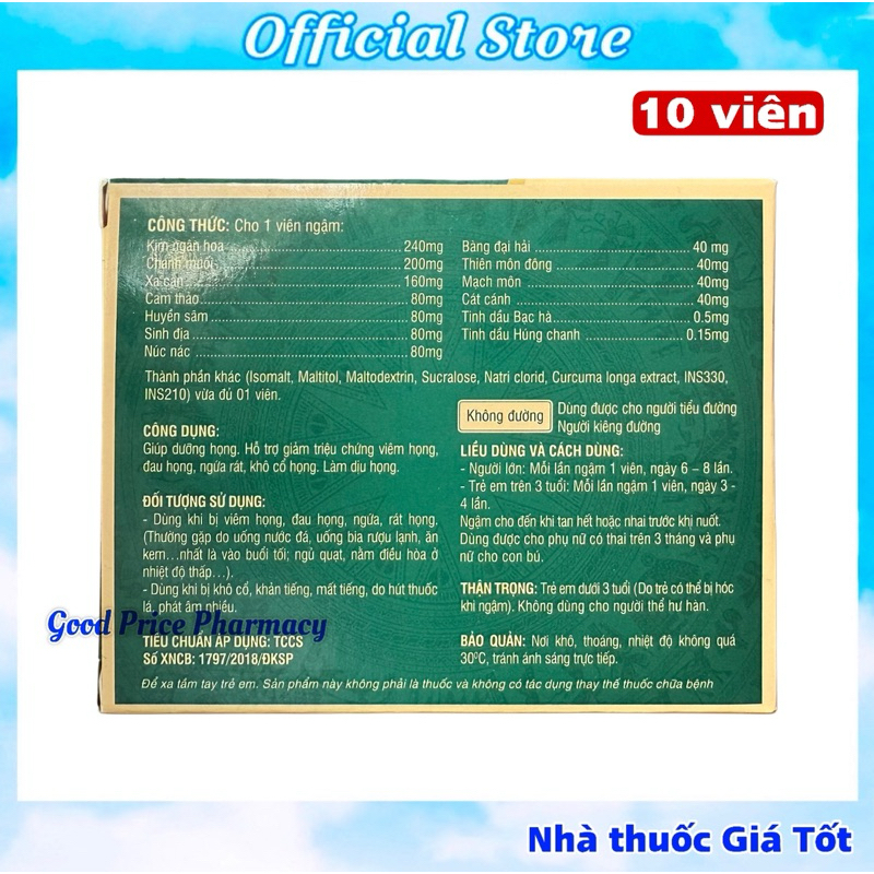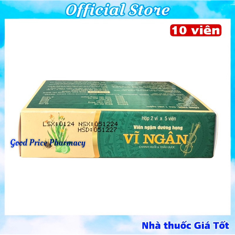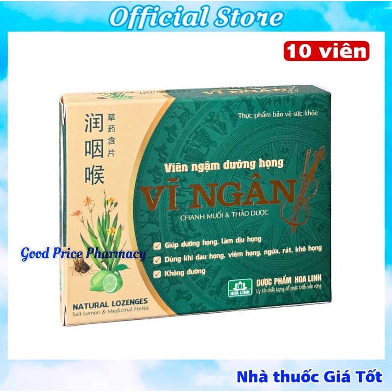 ✅ CÔNG DỤNGGiúp dưỡng họng, Hỗ trợ giảm triệu chứng viêm họng, đau họng, ngứa rát, khô cổ họng. Làm dịu họng✅ CÁCH SỬ DỤNGDùng khi bị viêm họng, đau họng, ngứa, rát họngDùng khi bị khô cổ, khản tiếng, mất tiếng, do hút thuố.c lá, phát âm nhiềuViên ngậm dưỡng họng Vĩ Ngân sử dụng chất Isomalt để tạo vị ngọt. Isomalt được chiết xuất từ củ cải, là loại đường chuyên dùng cho người ăn kiêng, người bị tiểu đường. Vì vậy, viên ngậm dưỡng họng Vĩ Ngân sử dụng thích hợp cho người bị tiểu đường, người kiêng đường.✅ LIÊU DÙNG, CÁCH DÙNG:Người lớn: Mỗi lần ngậm 1 viên, ngày 6 - 8 lầnTrẻ em trên 3 tuổi: Mỗi lần ngậm 1 viên, ngày 3 - 4 lầnNgậm cho đến khi tan hết hoặc nhai trước khi nuốtDùng được cho phụ nữ có thai trên 3 tháng và phụ nữ cho con bú✅ QUY CÁCH: Hộp 2 vỉ x 5 viên.Không sử dụng cho người có mẫn cảm với bất kỳ thành phần nào của sản phẩm. ❌ Thực phẩm này không phải là thuốc, không có tác dụng thay thế thuốc chữa bệnh.