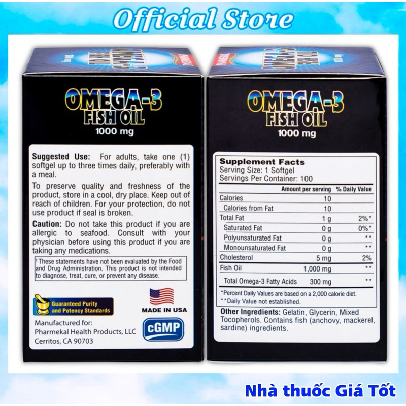 Viên Uống Dầu Cá Omega 3 Fish Oil 1000mg 100 Viên là cách nhanh nhất giúp bạn bổ sung lượng Omega 3 cần thiết cho cơ thể mà không mất nhiều thời gian mà lại tiết kiệm. Omega 3 Fish Oil có tác dụng hỗ trợ tuần hoàn, bảo vệ tim mạch, giảm nguy cơ tử vong do tim mạch. Omega 3 Fish Oil còn có tác dụng giảm các loạn nhịp tim, những người bị nhồi máu cơ tim khi bổ sung dầu cá sẽ làm giảm nguy cơ bị nhồi máu cơ tim tái phát. Omega 3 Fish Oil còn có tác dụng làm giảm quá trình lão hóa. Giúp mắt sáng khoẻ. Tăng trí nhớ, bảo vệ tế bào thần kinh, chống lại bệnh Alzheimer và tâm thần phân liệt.Thành phần:Calories, Calories from Fat, Total Fat, Saturated Fat, Polyunsaturated Fat, Monounsaturated Fat, Cholesterol, Fish Oil, Omega-3, Gelatin, Glycerin, Mixed Tocopherols. Contains fish (anchovy, mackerel, sardine) ingredients.Đặc trưng:DPA là một chất rất cần thiết cho sự phát triển hoàn thiện của thai nhi và tế bào thần kinh của thai nhi. DPA giữ một vai trò rất quan trọng trong suốt quá trình phát triển trước và sau khi sinh của trẻ nhỏ.DHA chiếm tỉ lệ rất cao trong chất xám (tạo ra sự thông minh) của não và trong võng mạc (tổng chỉ huy sự nhìn của mắt). DHA tạo ra độ nhạy của các nơ-ron thần kinh, giúp dẫn truyền thông tin nhanh và chính xác EPA giúp tạo ra Prostagladin trong máu có tác dụng ức chế sự đông vón tiểu cầu, giảm và phòng ngừa hình thành huyết khối, đồng thời có thể giảm bớt lượng cholesterol, giảm bớt triglyceride trong máu làm giảm độ nhớt dính của máu, giữ cho tuần hoàn được thông thoáng. Công dụng:Omega 3 Fish Oil có tác dụng hỗ trợ tuần hoàn, bảo vệ tim mạch, giảm nguy cơ tử vong do tim mạch.Omega 3 Fish Oil còn có tác dụng giảm các loạn nhịp tim, những người bị nhồi máu cơ tim khi bổ sung dầu cá sẽ làm giảm nguy cơ bị nhồi máu cơ tim tái phát.Ăn cá 1- 2 lần mỗi tuần cg làm giảm nguy cơ bị đột quỵ (hay còn gọi là tai biến mạch máu não).Omega 3 Fish Oil còn có tác dụng làm giảm quá trình lão hóa.Giúp mắt sáng khoẻ.Tăng trí nhớ, bảo vệ tế bào thần kinh.Kết quả nghiên cứu cho thấy omega 3 giúp bảo vệ chống lại bệnh Alzheimer và tâm thần phân liệt. Một nghiên cứu gần đây đã chứng minh bổ sung DHA có thể làm chậm mất trí nhớ do tuổi tác.Hướng dẫn sử dụng:Dùng cho người lớn, 3 lần/ngày, 1 viên/ lần, tốt nhất khi kèm với bữa ănBảo quản:Nơi khô ráo, thoáng mátTránh ánh nắng trực tiếpXuất xứ: MỹQuy cách: 100 viênThương hiệu: PharmekalChú ý: Sản phẩm không phải là thuốc, không thể thay thế thuốc chữa bệnh.#vienuong #Pharmekal