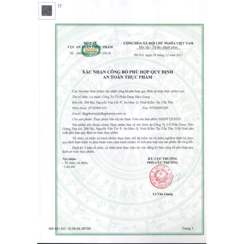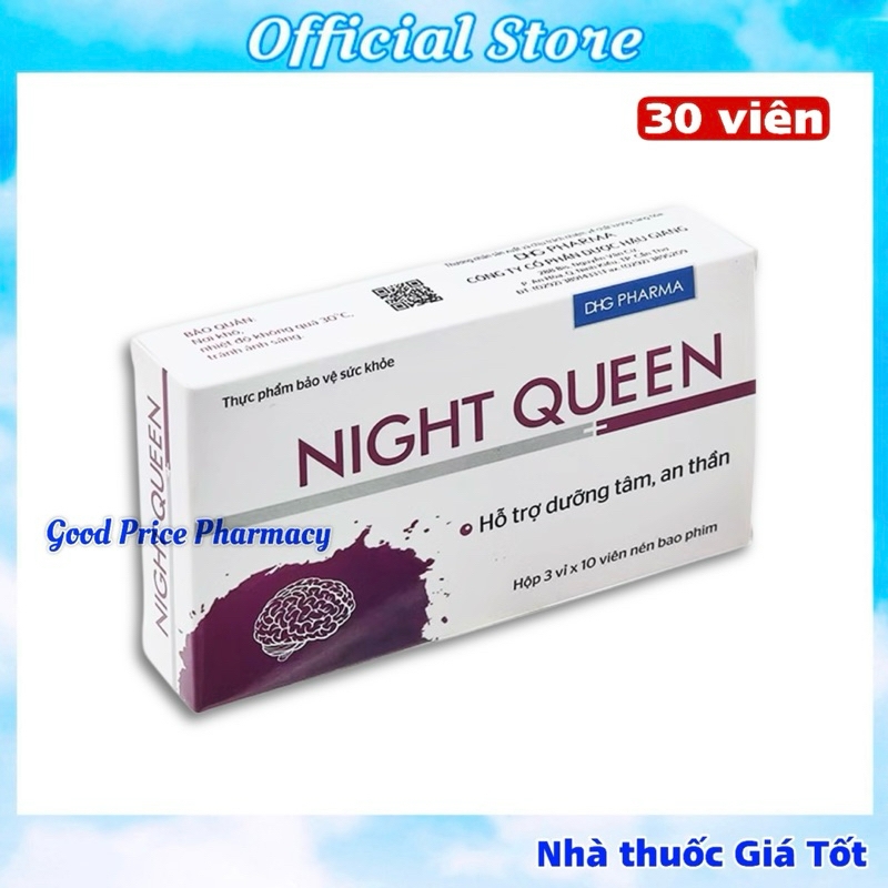 Night Queen là thực phẩm bảo vệ sức khỏe của Công ty Cổ phần Dược Hậu Giang (DHG Pharma), hỗ trợ dưỡng tâm, an thần và cải thiện chất lượng giấc ngủ.🧪 Thành phần chính (trong 1 viên)Cao khô Bình vôi: 75 mg (tương đương 30 mg Rotundin sulfat)Cao khô Trinh nữ: 50 mg (tương đương 638 mg Trinh nữ)Cao khô Lạc tiên: 40 mg (tương đương 600 mg Lạc tiên)Cao khô Vông nem: 30 mg (tương đương 600 mg Vông nem lá)Cao khô Lá sen: 18 mg (tương đương 180 mg Lá sen)Cao khô Tâm sen: 15 mg (tương đương 150 mg Tâm sen)Phụ liệu: colloidal silicon dioxide, calci hydrophosphat dihydrat, magnesi carbonat base, natri croscarmellose, talc, magnesi stearat, sepifilm LP770, hypromellose 2910 (6cp và 15cp), copovidon, titan dioxyd, màu FD & C Blue No 1 Alum lake, màu indigo carmin lake.🌿 Công dụngHỗ trợ dưỡng tâm, an thần.Giúp dễ ngủ, ngủ sâu giấc.👥 Đối tượng sử dụngNgười bị mất ngủ, ngủ không sâu giấc.Người hay lo lắng, bồn chồn và căng thẳng tinh thần.💊 Liều dùng và cách dùngNgười lớn và trẻ em trên 12 tuổi: uống 1–2 viên/lần, trước khi đi ngủ 30–60 phút.⚠️ Lưu ý khi sử dụngKhông sử dụng cho phụ nữ có thai, trẻ em dưới 12 tuổi.Không sử dụng cho người mẫn cảm với bất kỳ thành phần nào của sản phẩm.Không sử dụng cho người đang lái xe hoặc vận hành máy móc.❌ Sản phẩm này không phải là thuốc và không có tác dụng thay thế thuốc chữa bệnh. 📦 Quy cách đóng góiHộp 3 vỉ x 10 viên nén bao phim.🗓️ Hạn sử dụng36 tháng kể từ ngày sản xuất.🏭 Nhà sản xuấtCông ty Cổ phần Dược Hậu Giang (DHG Pharma)