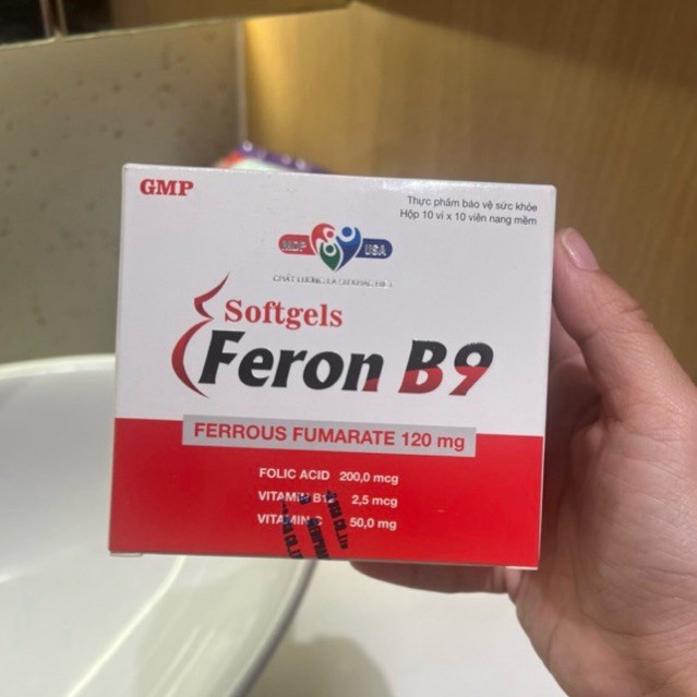 Viên Uống Feron B9 Mediphar USA Bổ Sung Sắt Và Acid Folic - Hộp 100 Viên✅ Thành phần viên uống bổ sung sắt Feron B9:Mỗi viên nang mềm chứa:Sắt II : 50,0 mgAcid Folic : 200 mcgVitamin B1 : 1,50 mgVitamin B2 : 1,50 mgVitamin B6 : 1,50 mgVitamin B12 : 2,5 mcgVitamin PP : 5,0 mgVitamin E : 5,0 IU✅ Công dụng viên uống Feron B9: Viên sắt Feron B9 hỗ trợ bổ sung sắt, acid folic và các thành phần cần thiết cho quá trình tạo máu; giúp dự phòng thiếu máu và thiếu sắt trong các trường hợp mất máu do phẫu thuật, chấn thương, người hiến máu. Hỗ trợ làm giảm triệu chứng da xanh xao, gầy yếu, hoa mắt, chóng mặt do thiếu máu thiếu sắt, giúp tăng cường sức khỏe, giúp thai nhi và trẻ em phát triển khỏe mạnh. Giúp ngăn ngừa thiếu máu ở phụ nữ có thai, cho con bú, trẻ em tuổi dậy thì, phụ nữ trong thời kỳ kinh nguyệt, rong kinh.✅ Đối tượng sử dụng viên uống bổ sung sắt Feron B9:Phụ nữ có thai và cho con bú khi thức ăn không cung cấp đủ.Phụ nữ trong thời kỳ kinh nguyệt, rong kinh.Những người kém hấp thu sắt như cắt đoạn dạ dày, viêm teo niêm mạc dạ dày, viêm ruột mãn tính.Người thiếu máu do thiếu sắt, acid folic và vitamin B12, người mới hồi phục sau chấn thương.✅ Hướng dẫn sử dụng:Uống 1-2 viên/lần, ngày 1-2 lần❌ LƯU Ý: Sản phẩm này không phải là thuốc và không có tác dụng thay thế thuốc chữa bệnh