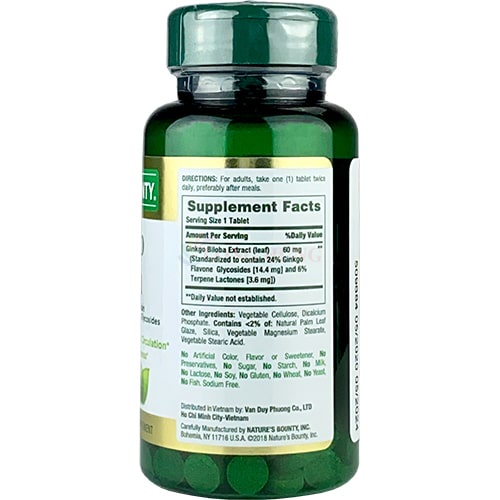 #ginkgobiloba #vienuongginkgo #caithientrinho #bonao #naturesbountyViên uống Nature's Bounty Ginkgo Biloba 60mg với thành phần chiết xuất thảo dược từ ginkgo biloba vốn được biết đến có khả năng cải thiện trí nhớ, hỗ trợ giảm căng thẳng, tuần hoàn máu não, tăng cường sự tập trung.-Thành phần: Gingkgo biloba (bạch quả), Cellulose thực vật , Dicalcium Phosphate-Đối tượng sử dụng: Người suy giảm trí nhớ, người cần sự tập trung, giảm stress...-Hướng dẫn sử dụng: Ngày uống 2 lần, mỗi lần 1 Viên - Xuất xứ : Mỹ- Hàng chính hãng nhập khẩu và phân phối tại Việt NamLưu ý:- Sản phẩm không phải là thuốc và không có chức năng thay thế thuốc chữa bệnh- Vui lòng hỏi ý kiến bác sĩ nếu bạn dị ứng với các thành phần của sản phẩm hoặc đang gặp vấn đề nghiêm trọng về sức khỏe, phụ nữ có thai và cho con bú.- Sản phẩm không thể thay thế cho bữa ăn đủ dinh dưỡng và lối sống lành mạnh - Đọc kĩ hướng dẫn sử dụng trước khi dùng