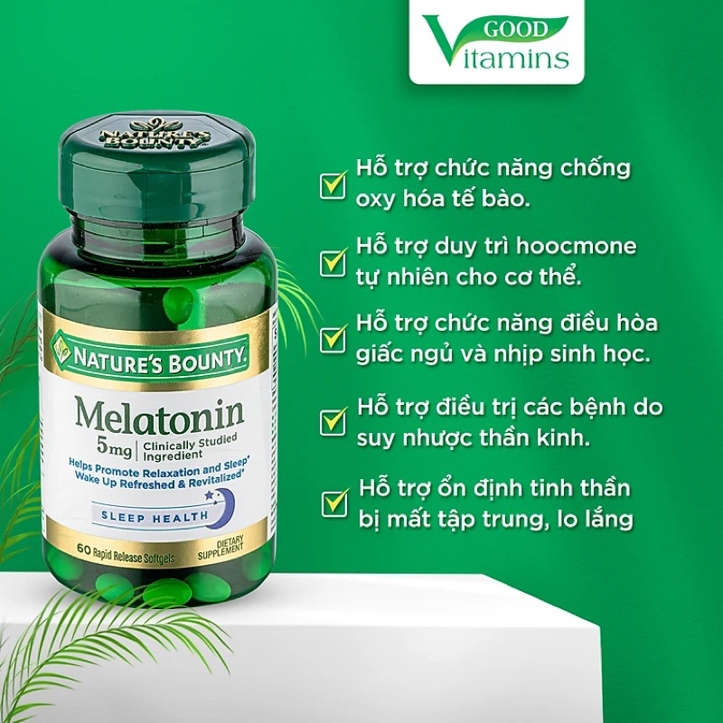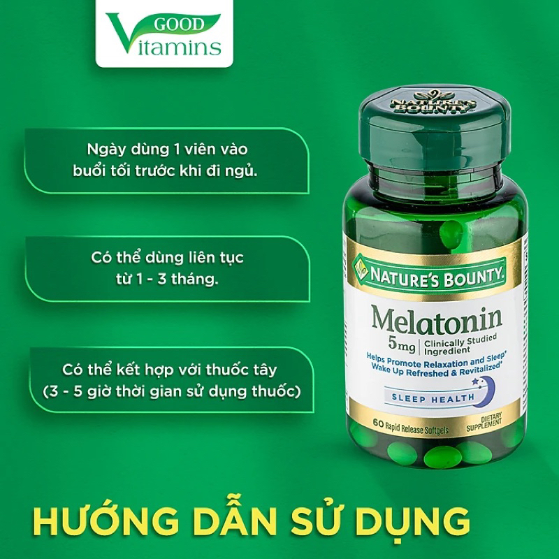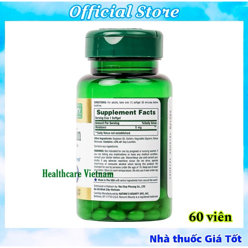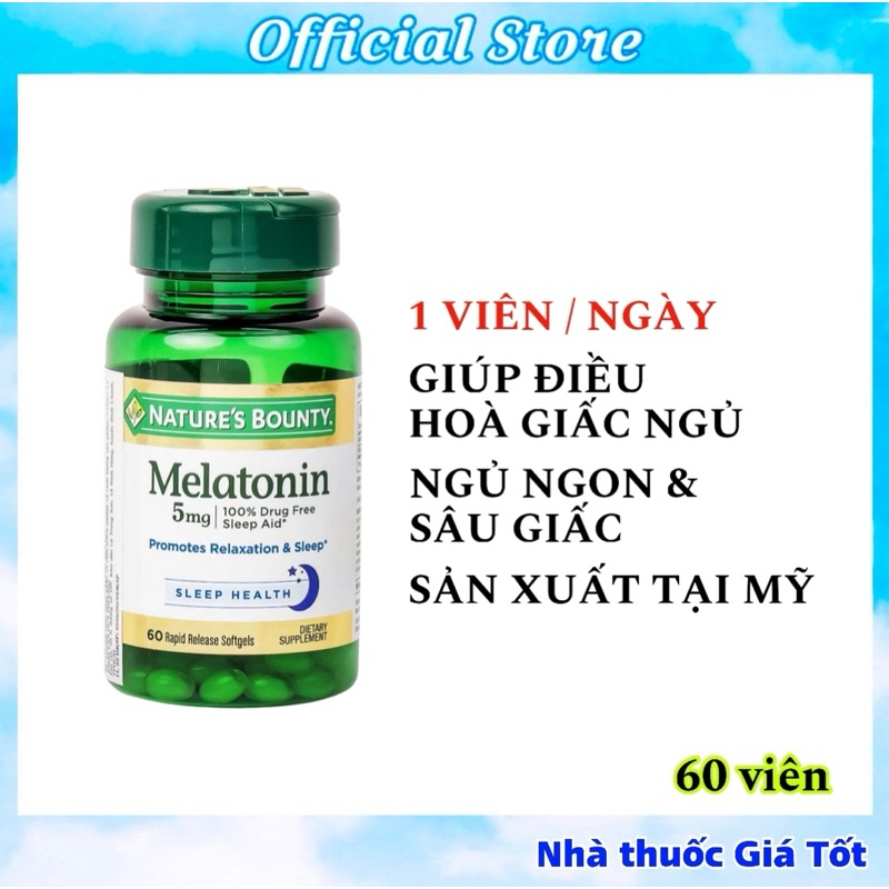 #naturesbounty #melatonin5mg #naturesbountymelatonin5mg #hotrocaithiengiacnguViên uống Nature's Bounty Melatonin 5mg hỗ trợ cải thiện giấc ngủ.- Điều hòa giấc ngủ, hỗ trợ điều trị các chứng mất ngủ, trằn trọc, làm giảm các chứng mệt mỏi, lo âu, khó ngủ về đêm. - Giúp thư giãn đầu óc, các dây thần kinh giúp bạn đi vào giấc ngủ. - Hạn chế các trạng thái trạng thái trầm cảm, nhức đầu, căng thẳng thần kinh, ù tai.- Tăng cường hệ miễn dịch, đối với giai đoạn mãn kinh sẽ dễ chịu và thoải mái hơn.Thành phần : 5mg Melatonin, dầu đậu nành, gelatin, glycerin thực vật, sáp ong vàng... Đối tượng sử dụng : Dùng cho người lớnHướng dẫn sử dụng : Uống mỗi ngày 1 viên, uống trước khi đi ngủ 30 phút để có giấc ngủ ngon và sâu hơnNơi sản xuất : MỹSản phẩm là hàng chính hãng nhập khẩu và phân phối chính thức tại Việt NamLưu ý:- Không dành cho người dưới 18 tuổi sử dụng.- Sản phẩm không phải là thuốc và không có chức năng thay thế thuốc chữa bệnh- Vui lòng hỏi ý kiến bác sĩ nếu bạn dị ứng với các thành phần của sản phẩm hoặc đang gặp vấn đề nghiêm trọng về sức khỏe, phụ nữ có thai và cho con bú.- Sản phẩm không thể thay thế cho bữa ăn đủ dinh dưỡng và lối sống lành mạnh - Sản phẩm có thể gây ngủ gà. Không dùng sản phẩm khi lái xe, vận hành máy móc, uống đồ uống có cồn. - Đọc kĩ hướng dẫn sử dụng trước khi dùng.