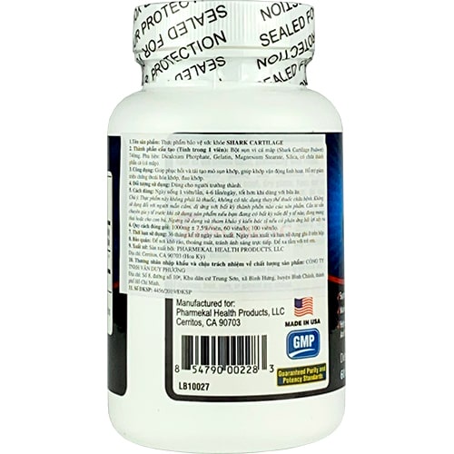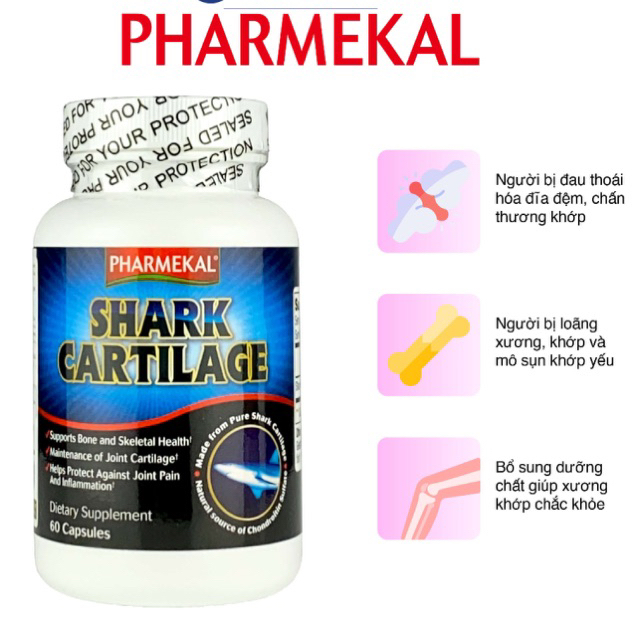 Viên uống Pharmekal Shark Cartilage hỗ trợ chắc khỏe hệ xương khớp giúp phục hồi và tái tạo mô sụn khớp, bôi trơn khớp, đảm bảo sự vận động linh hoạt cho khớp.- Thành phần: Shark Cartilage 740mg, phụ liệu: Dicalcium Phosphate, Gelatin, Silica, Magnesium Stearate- Đối tượng sử dụng: Người trưởng thành đau mỏi xương khớp, thoái hóa khớp- Hướng dẫn sử dụng: Ngày 2-3 viên chia hai lần sau ăn- Nơi sản xuất: Mỹ- Quy cách đóng gói: Hộp 60 viênLưu ý:- Sản phẩm không phải là thuốc và không có chức năng thay thế thuốc chữa bệnh- Vui lòng hỏi ý kiến bác sĩ nếu bạn dị ứng với các thành phần của sản phẩm hoặc đang gặp vấn đề nghiêm trọng về sức khỏe, phụ nữ có thai và cho con bú.- Sản phẩm không thể thay thế cho bữa ăn đủ dinh dưỡng và lối sống lành mạnh - Đọc kĩ hướng dẫn sử dụng trước khi dùng