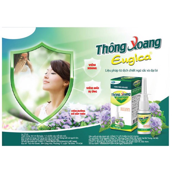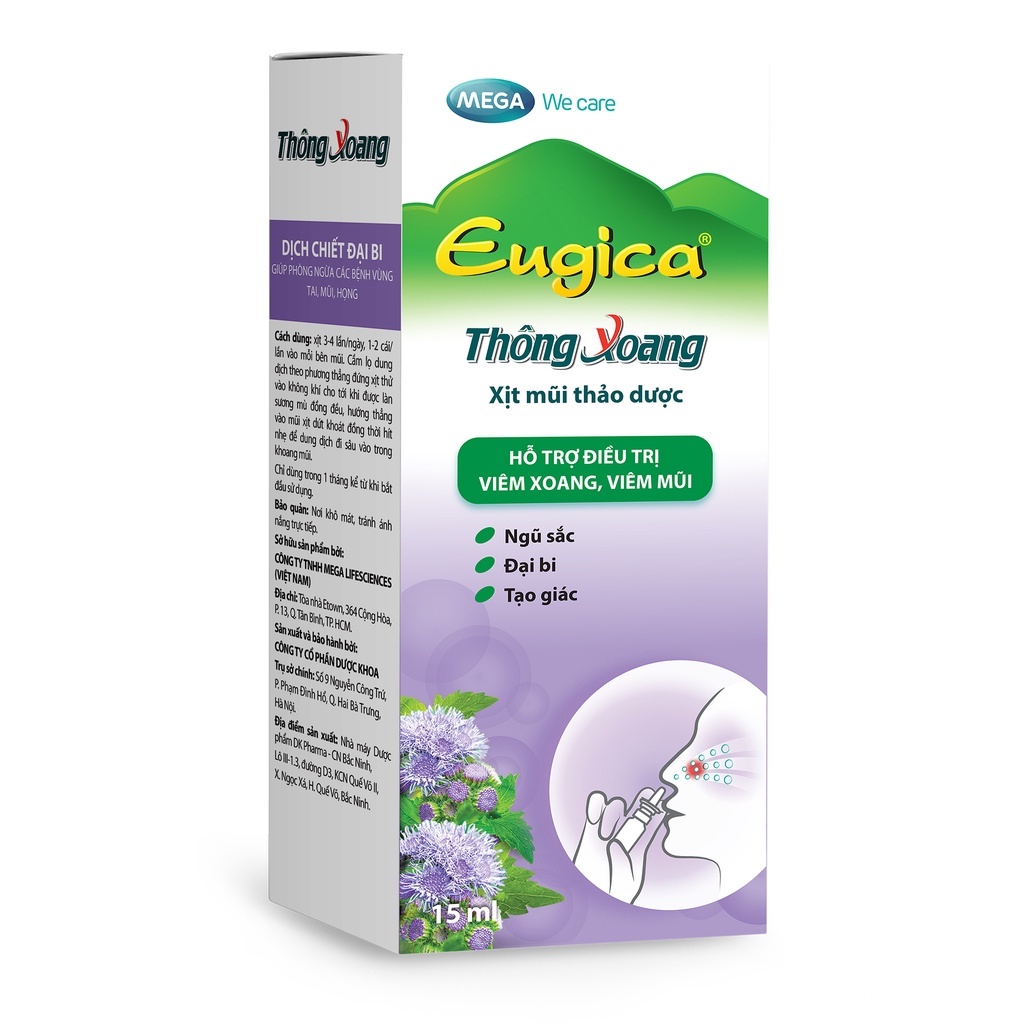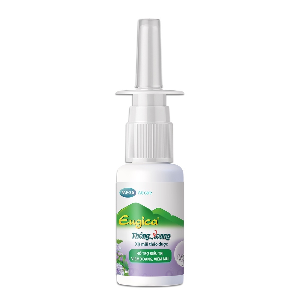 Xịt mũi thảo dược Thông xoang EugicaCÔNG DỤNG:Giúp mũi thông thoáng, hỗ trợ giảm nghẹt mũi, mang lại cảm giác dễ chịu. Dịch chiết ngũ sắc giúp ngăn khuẩn, ngăn vi.êm, hỗ trợ các bệnh lý đường hô hấp trên như vi.êm xoang, vi.êm mũi.Thành phầnDịch chiết Ngũ sắc, Dịch chiết Đại bi, Dịch chiết Tạo giác, Natri clorid, nước tinh khiết, tá dược vừa đủ.ĐỐI TƯỢNG SỬ DỤNG:Người lớn và trẻ em từ 36 tháng tuổi trở lênCÁCH DÙNG:Xịt 3-4 lần/ ngày, 1-2 cái/ lần vào mỗi bên mũiBẢO QUẢN:Nơi khô ráo, thoáng mát, tránh ánh nắng trực tiếp.DẠNG TRÌNH BÀY:Chai xịt 15mlHẠN SỬ DỤNG:2 năm kể từ NSX.Sản phẩm không phải là thuốc và không có tác dụng thay thế thuốc chữa bệnh
